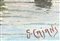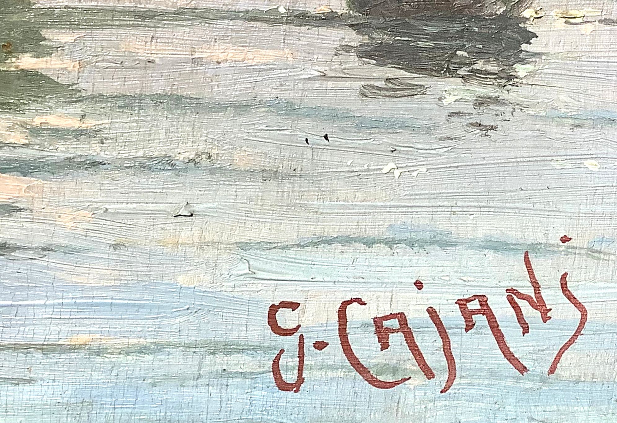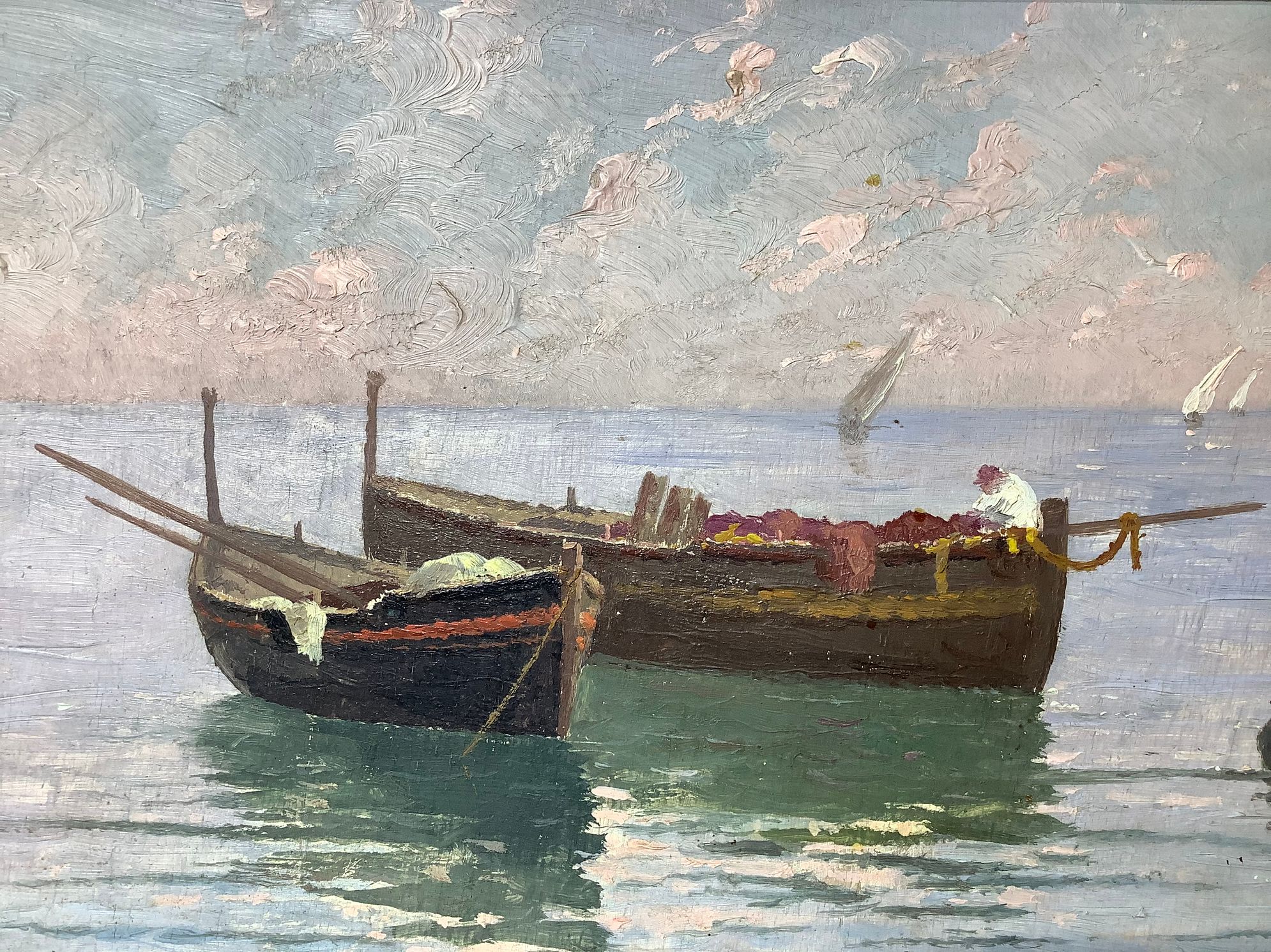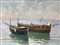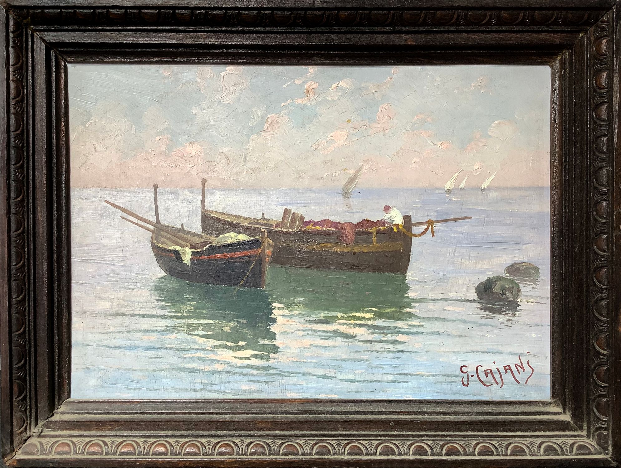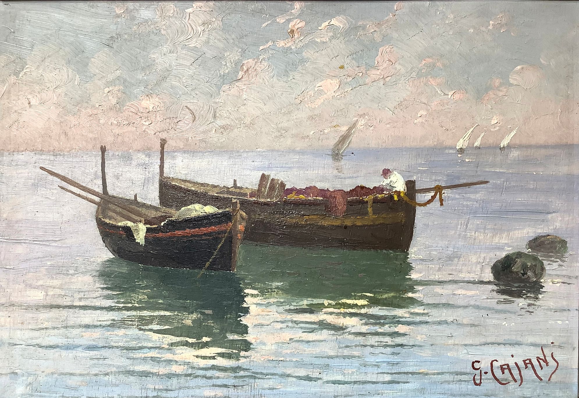 Dipinto ad olio su tela raffigurante marina con barche. G. Cajani . Cm 23x33.
