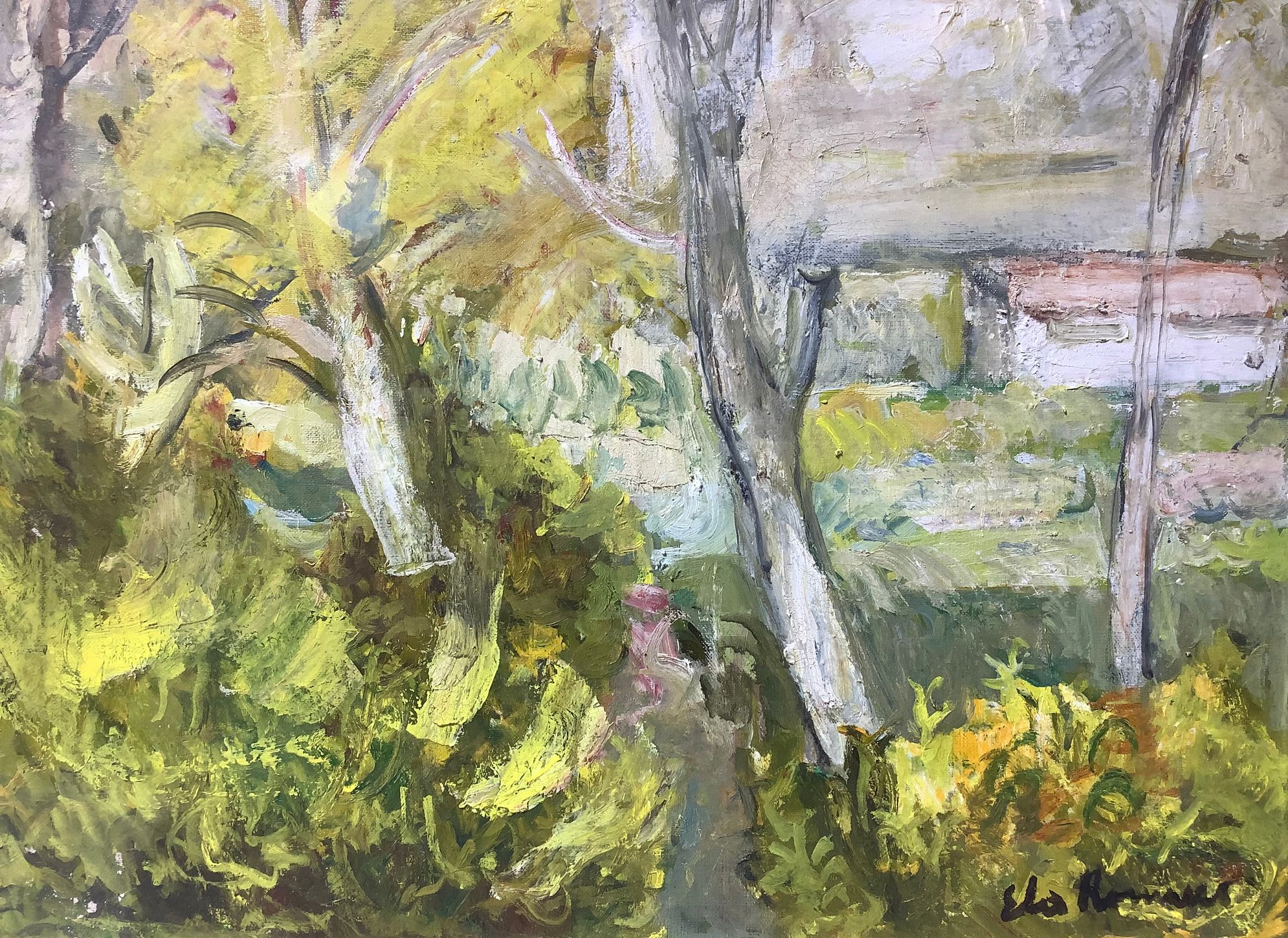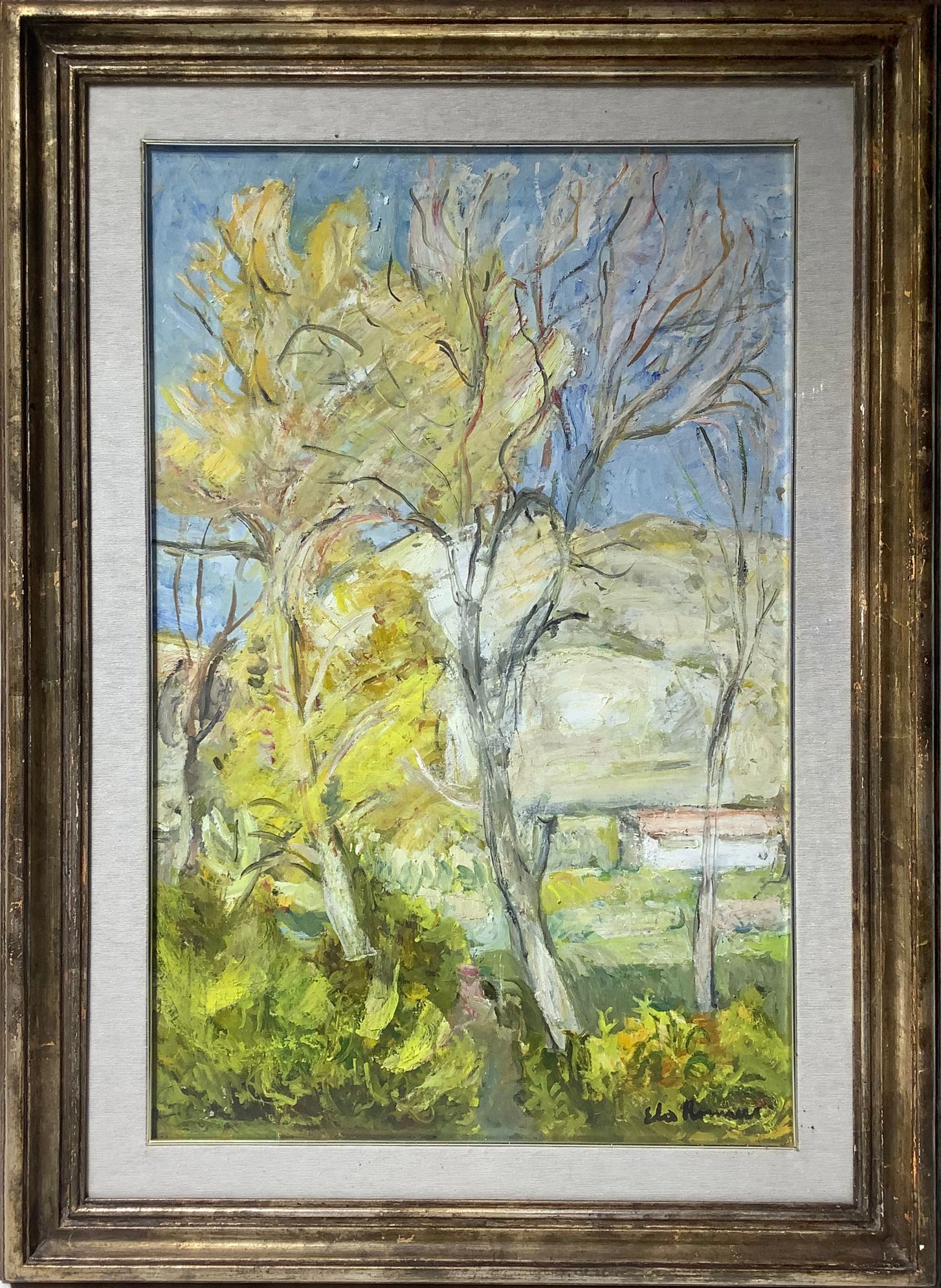 Dipinto ad olio su tela raffigurante paesaggio di Morra con alberi, Elio Romano (Trapani, 21 marzo 1909 – Catania, 12 luglio 1996) . Cm 80x50, in cornice cm 102x72. Firmato in basso a destra.