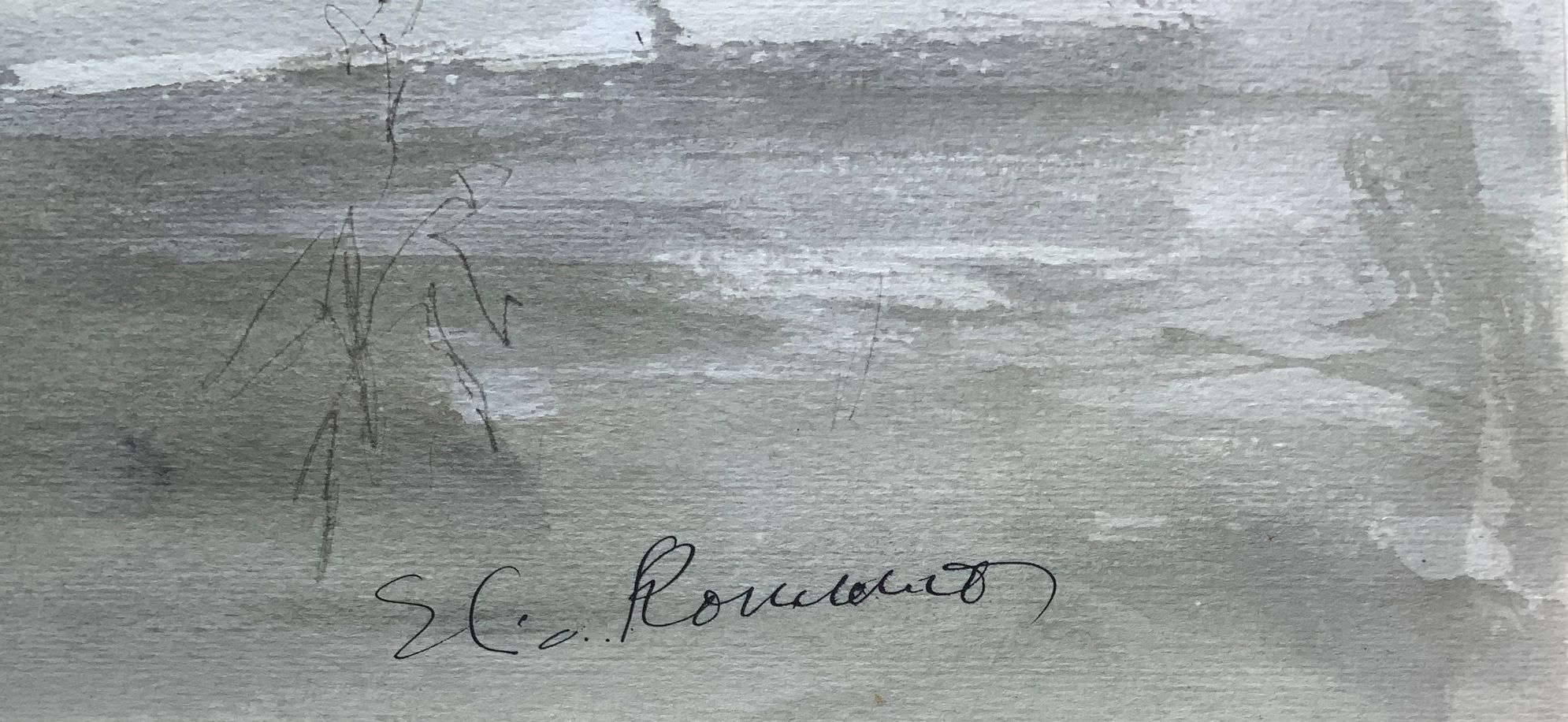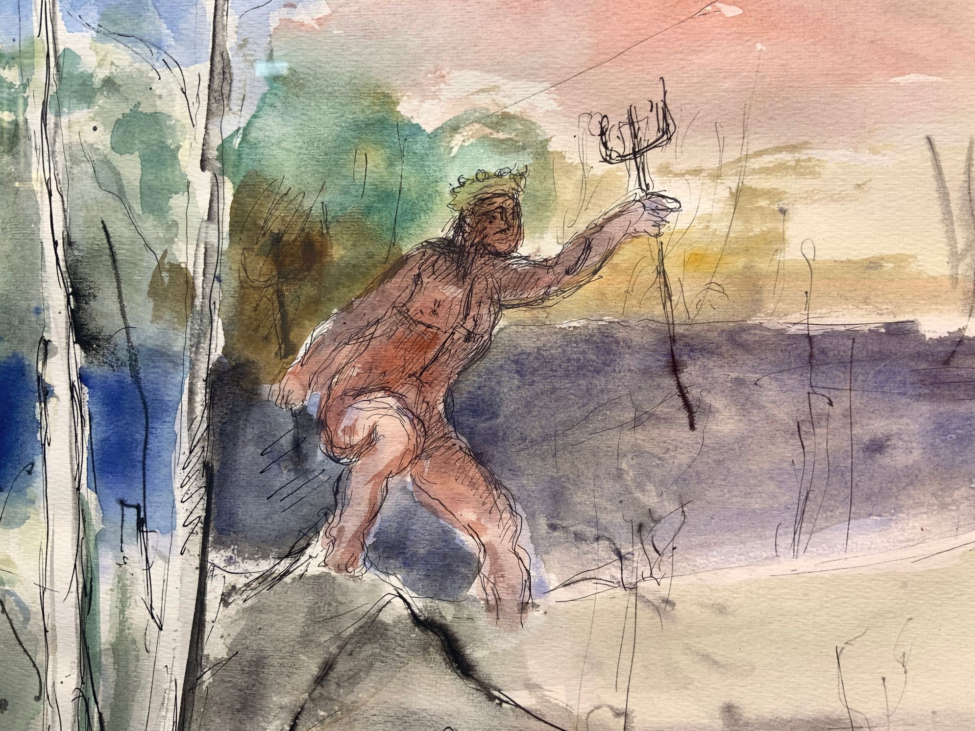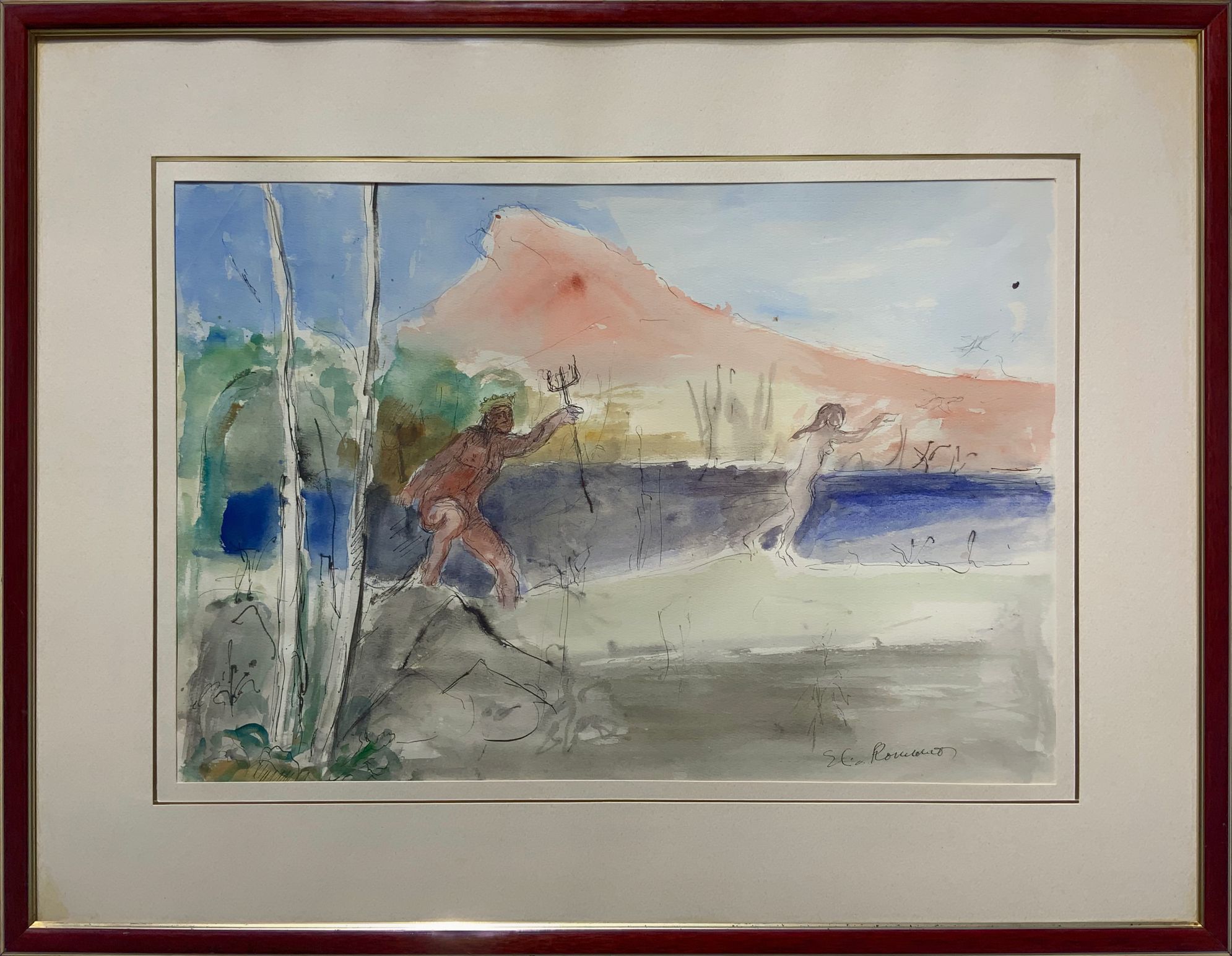 Dipinto ad olio su tela raffigurante Nettuno che insegue Proserpina, Elio Romano (Trapani, 1909 – Catania, 1996). Cm 37x52, acquerello. Firmato in basso a destra.