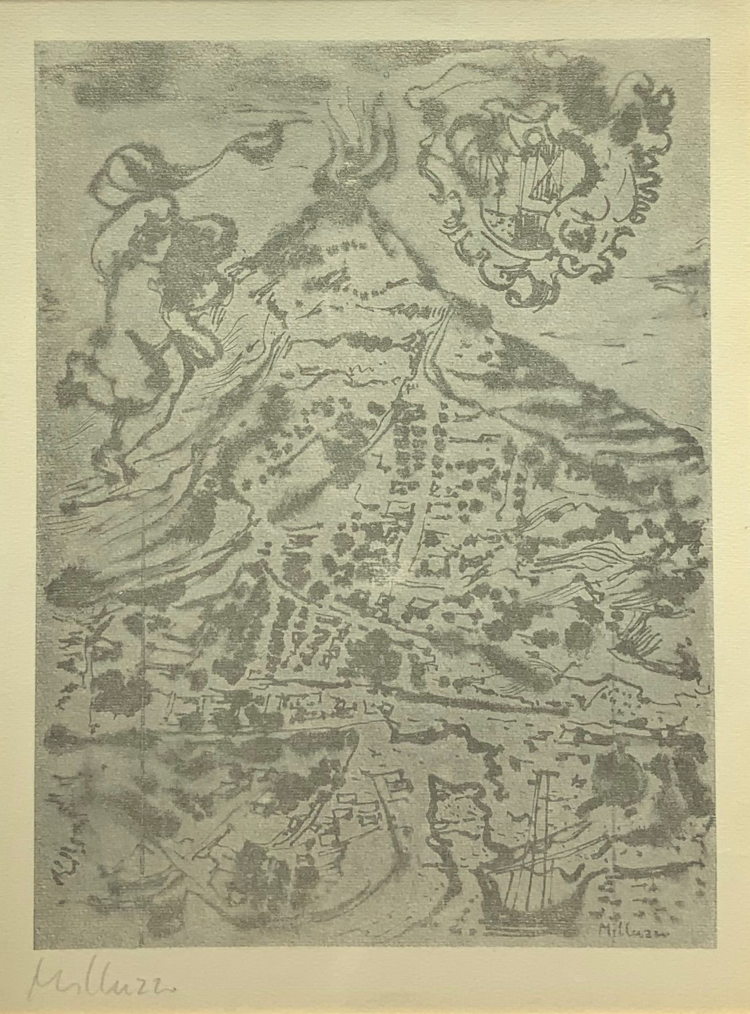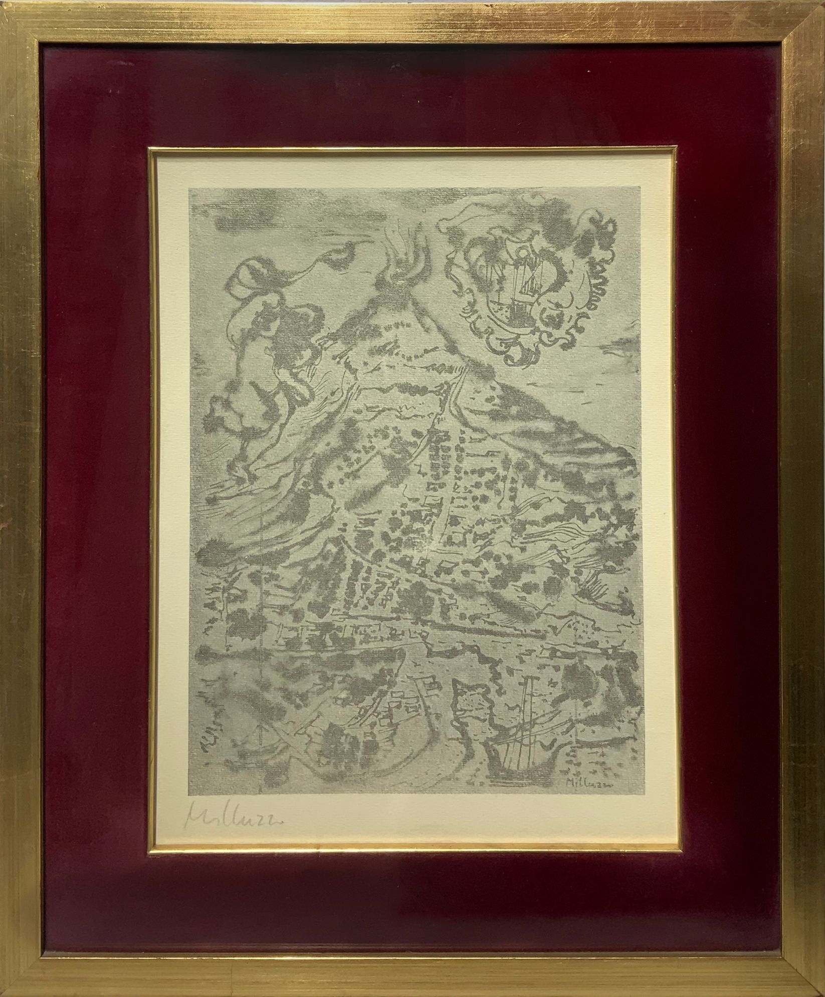 Stampa raffigurante Etna su Catania, Sebastiano Milluzzo (Catania, 12 luglio 1915 – Catania, 30 maggio 2011). Cm 34 x24. In cornice cm 48x38.