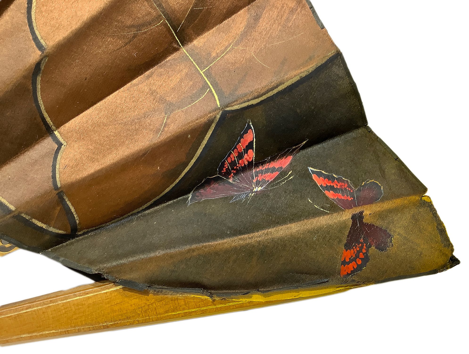 Ventaglio in seta dipinto a mano, Fratelli Battiati Catania. Decorato con foglie e farfalle. XIX secolo, anni ’30. Cm 63