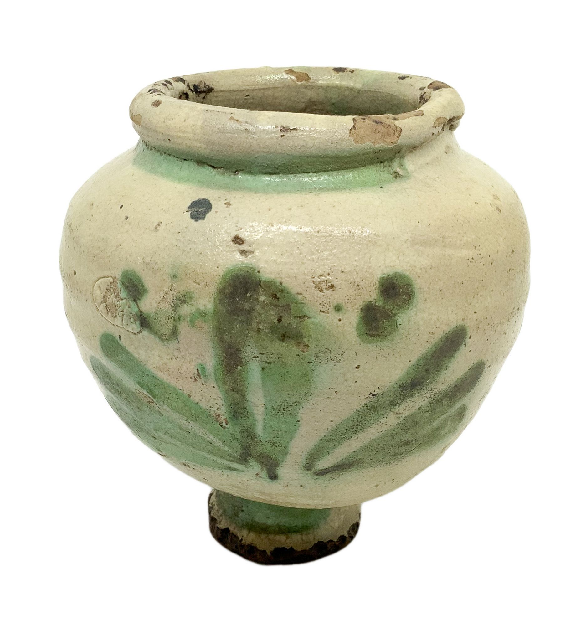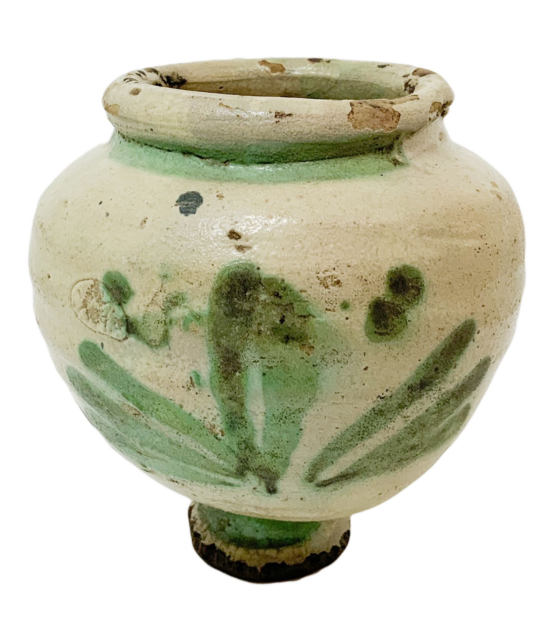 Piccola boccia in maiolica di Caltagirone con decori a palmati verde sul...