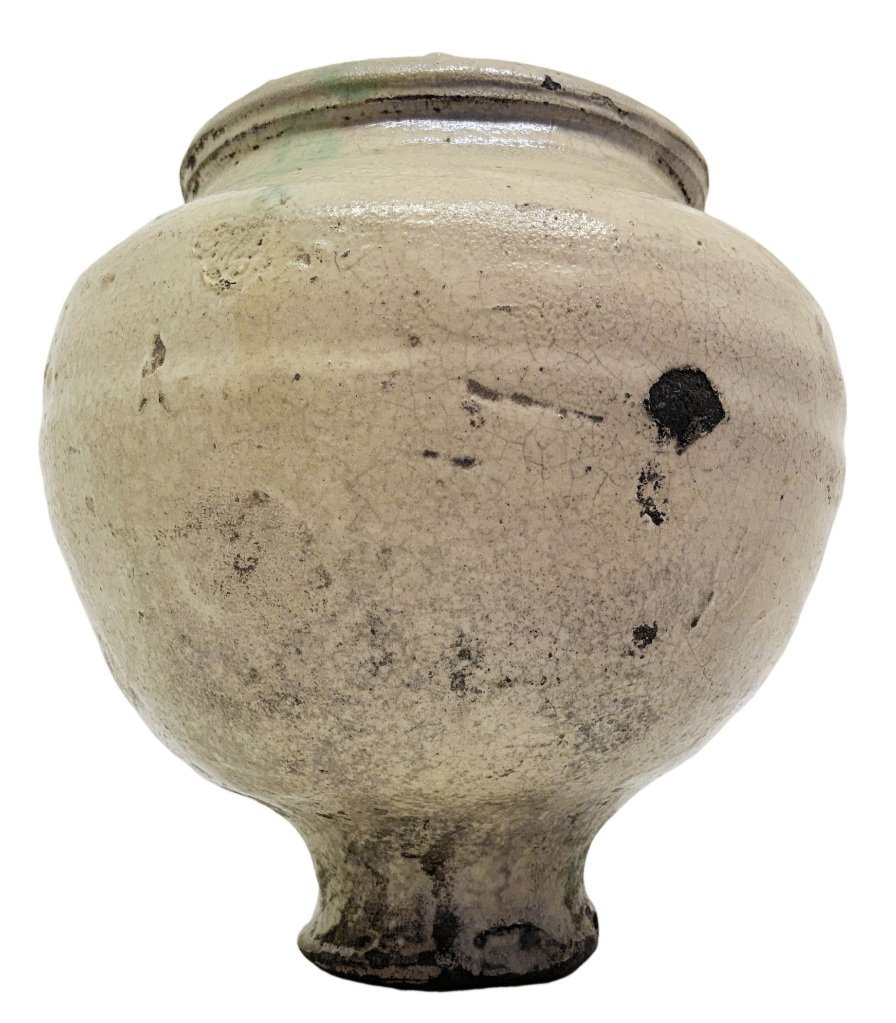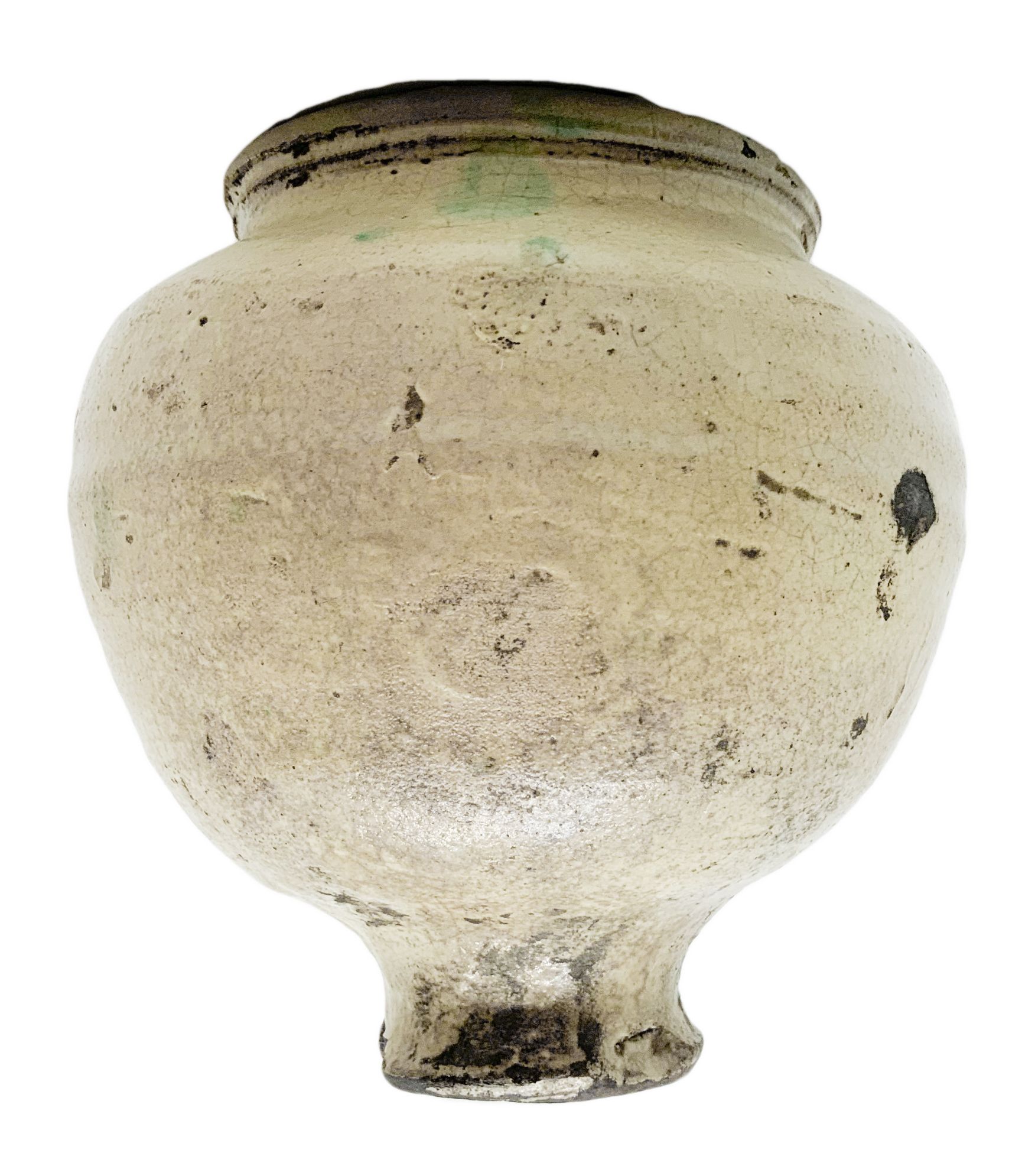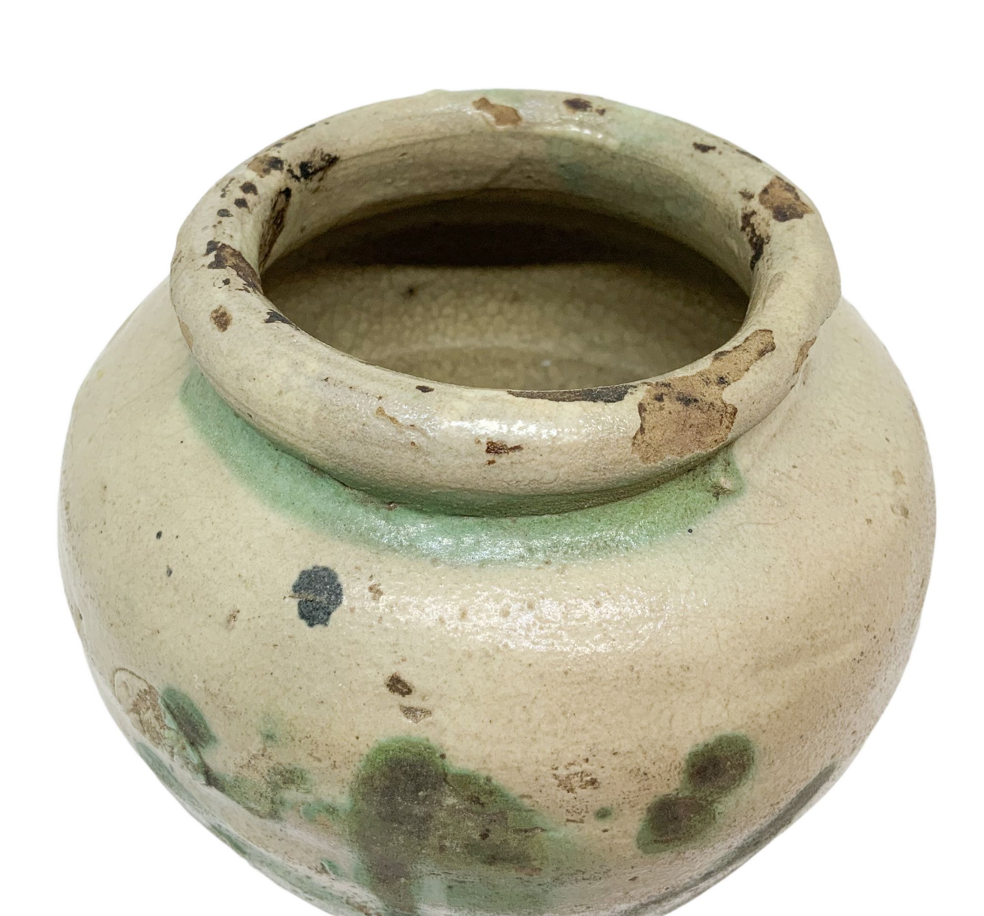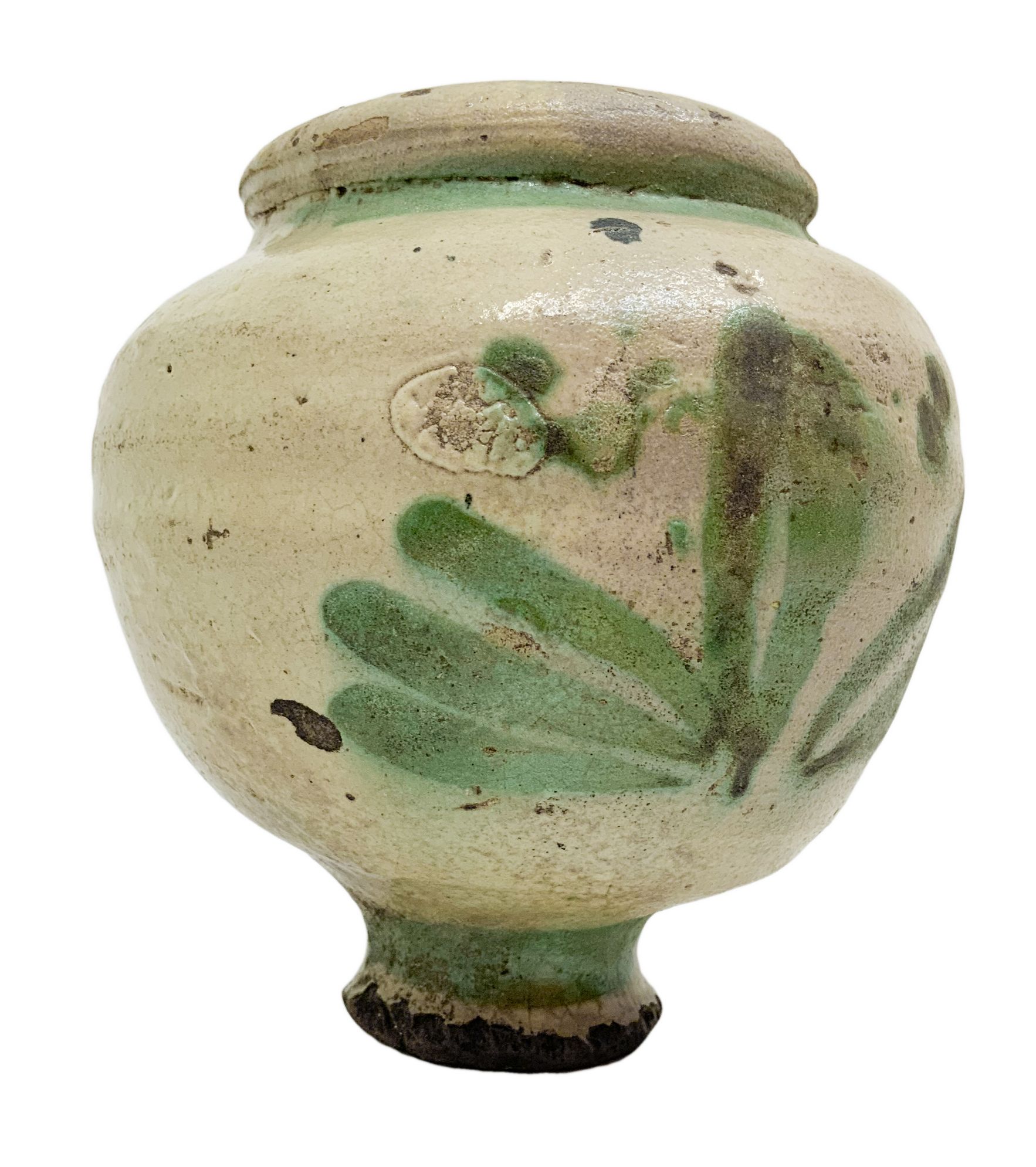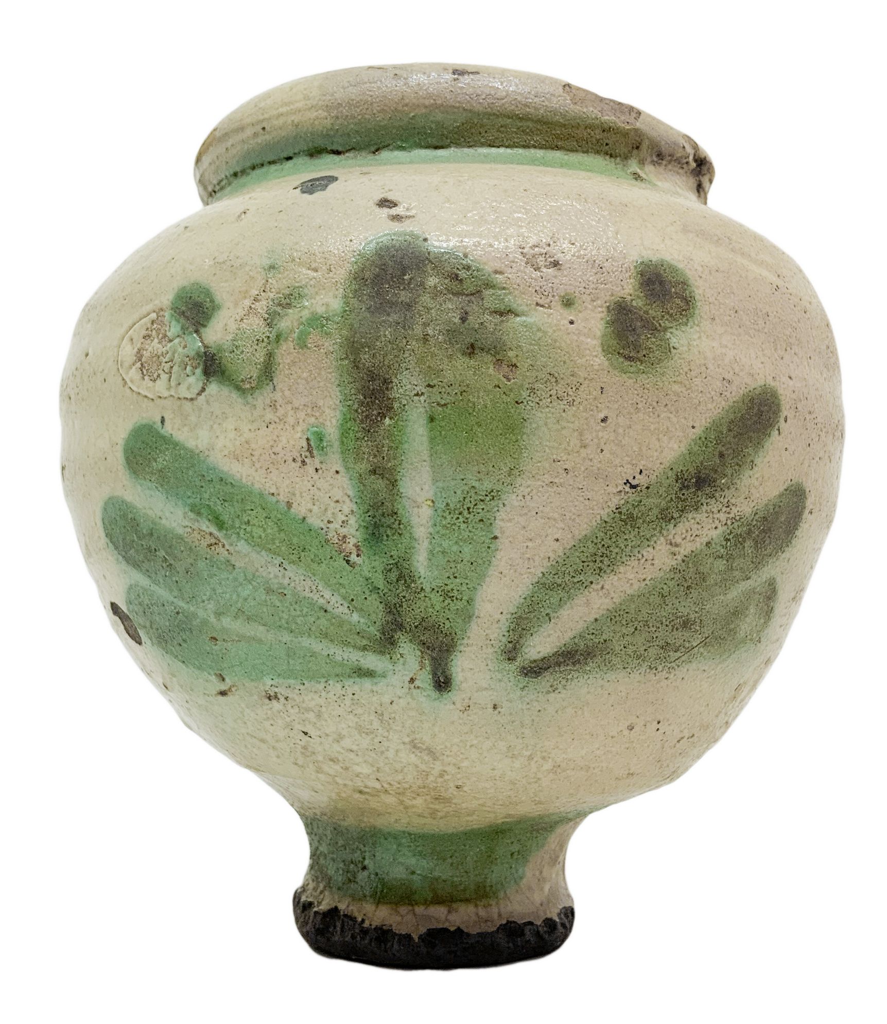 Piccola boccia in maiolica di Caltagirone con decori a palmati verde sul fondo beige, XIX secolo. H cm 11.