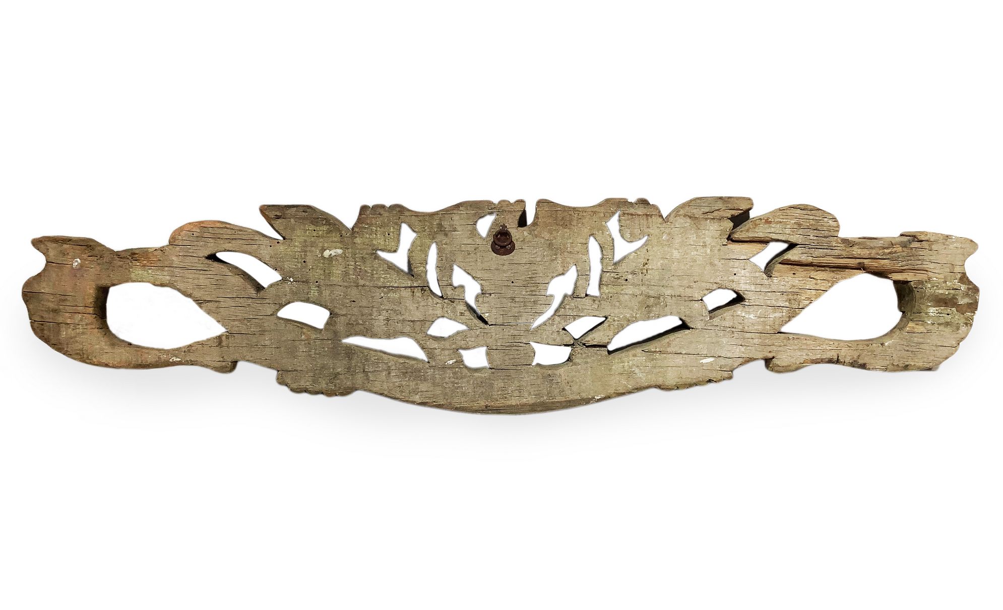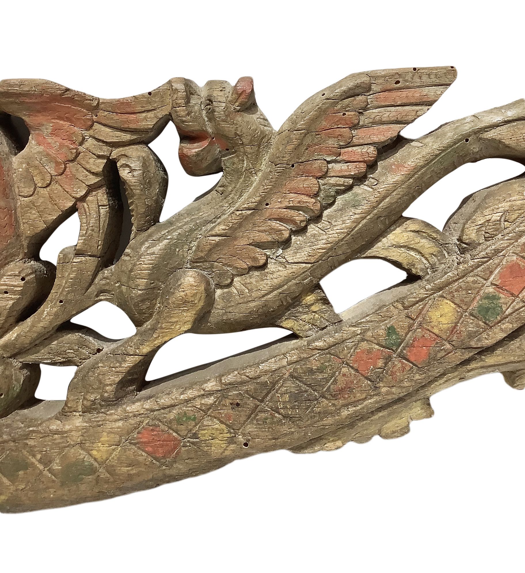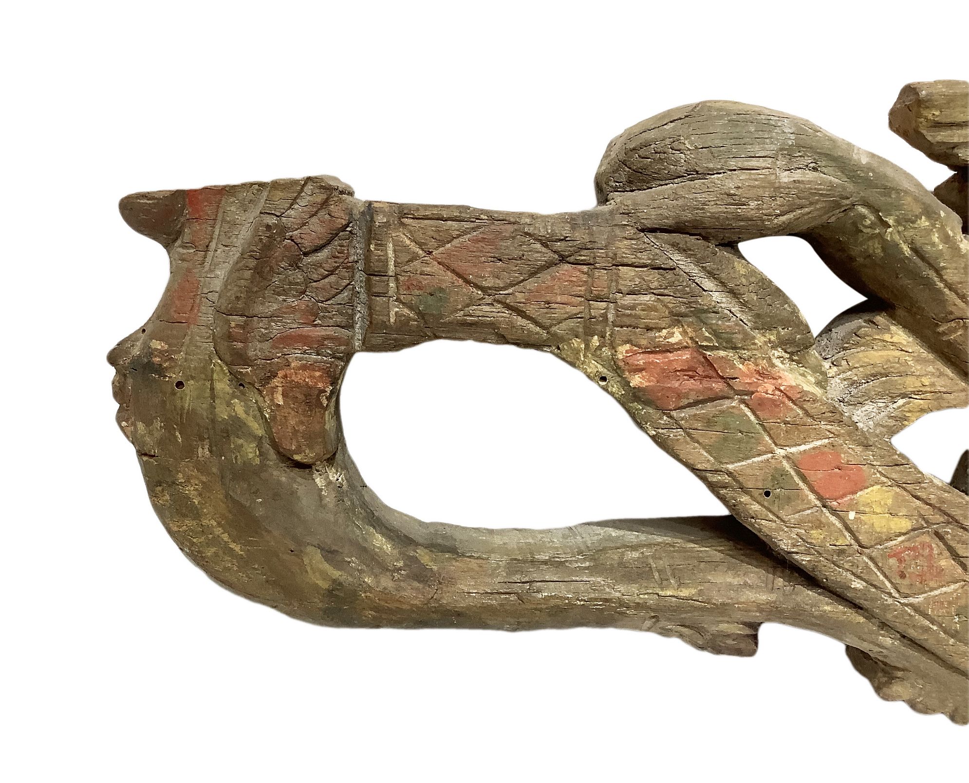 Antica chiave di carretto in legno scolpito policromo, fine del XIX secolo, inizi XX secolo, Sicilia. Cm 20x86