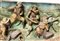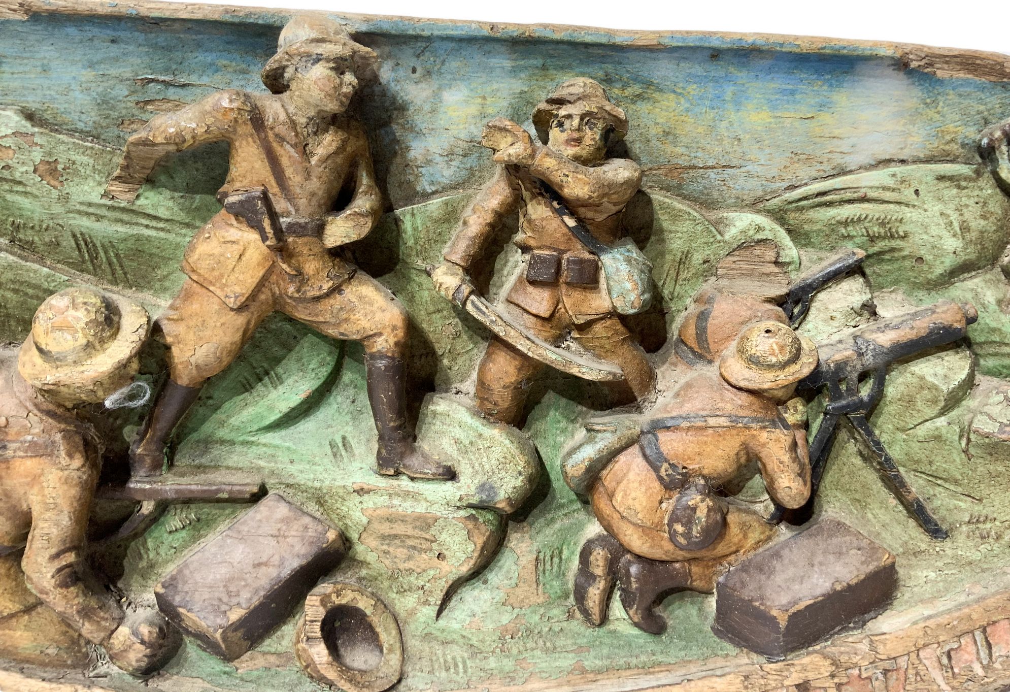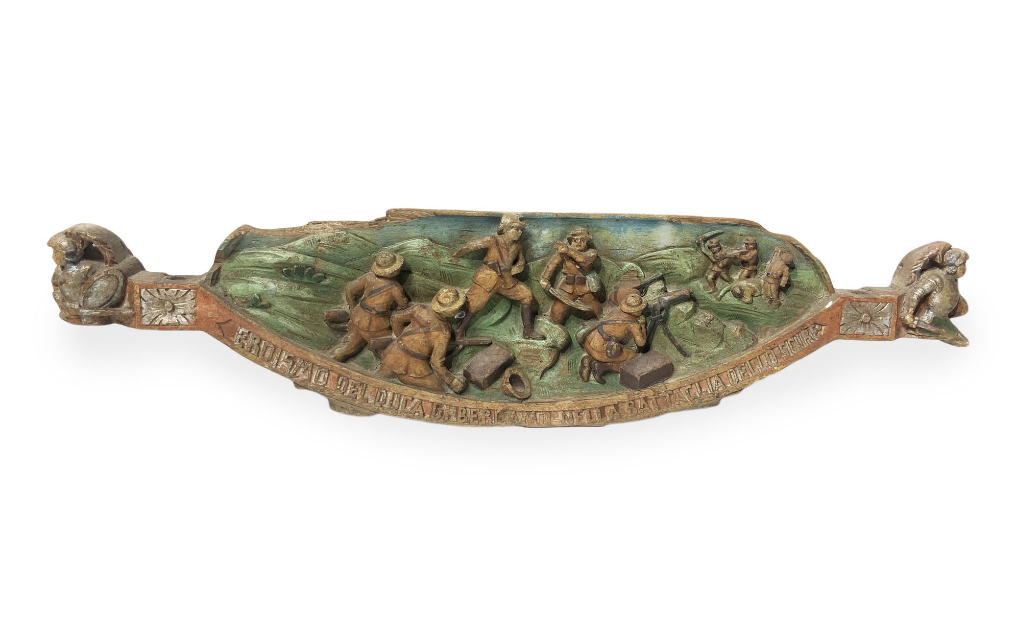Antica chiave di carretto in legno scolpito policromo fine del XIX secolo, metà XX secolo, Sicilia. Raffigurante la battaglia dello Scire' del marzo 1936 contro gli etiopi, in cui si distinse il gen. Alberto Terzani duca di Bergamo. Cm 86x21. Il carretto Siciliano come diffusione di notizie e di cultura, anticipatore e veicolo d'informazioni