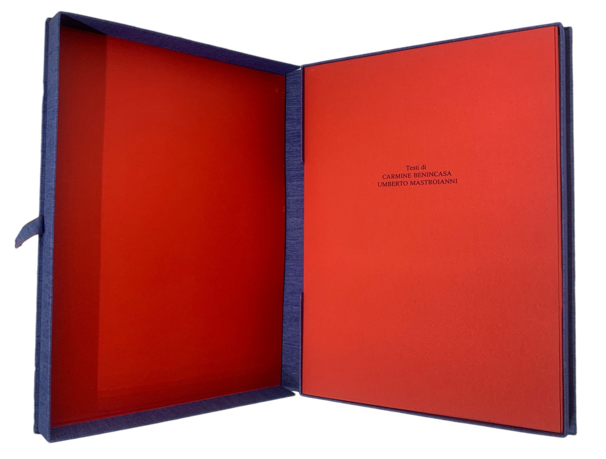 Umberto Mastroianni, testi di Carmine Benincasa. Contenitore in tessuto contenente cartella cartonata con la presentazione di Benincasa e 37 tavole a colori sciolte con veline di protezione. Anno edizione 1985. Ottimo stato. Opera completa.