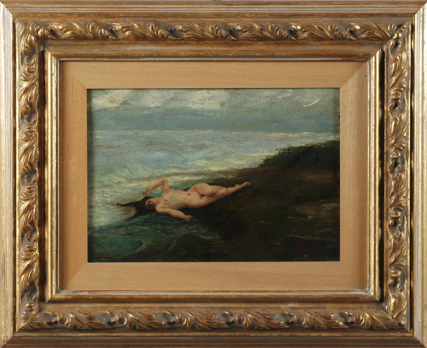 BROGGI MARIO (1890 - 1952) Fanciulla in riva al mare. Olio su compensato. Cm 33,00 x 23,50. Firma in basso a destra. Cornice presente