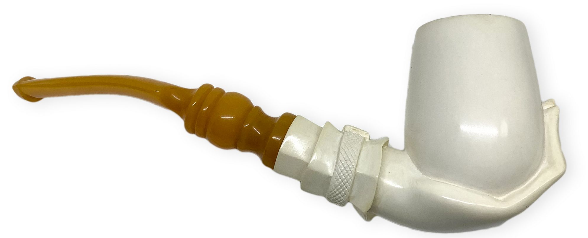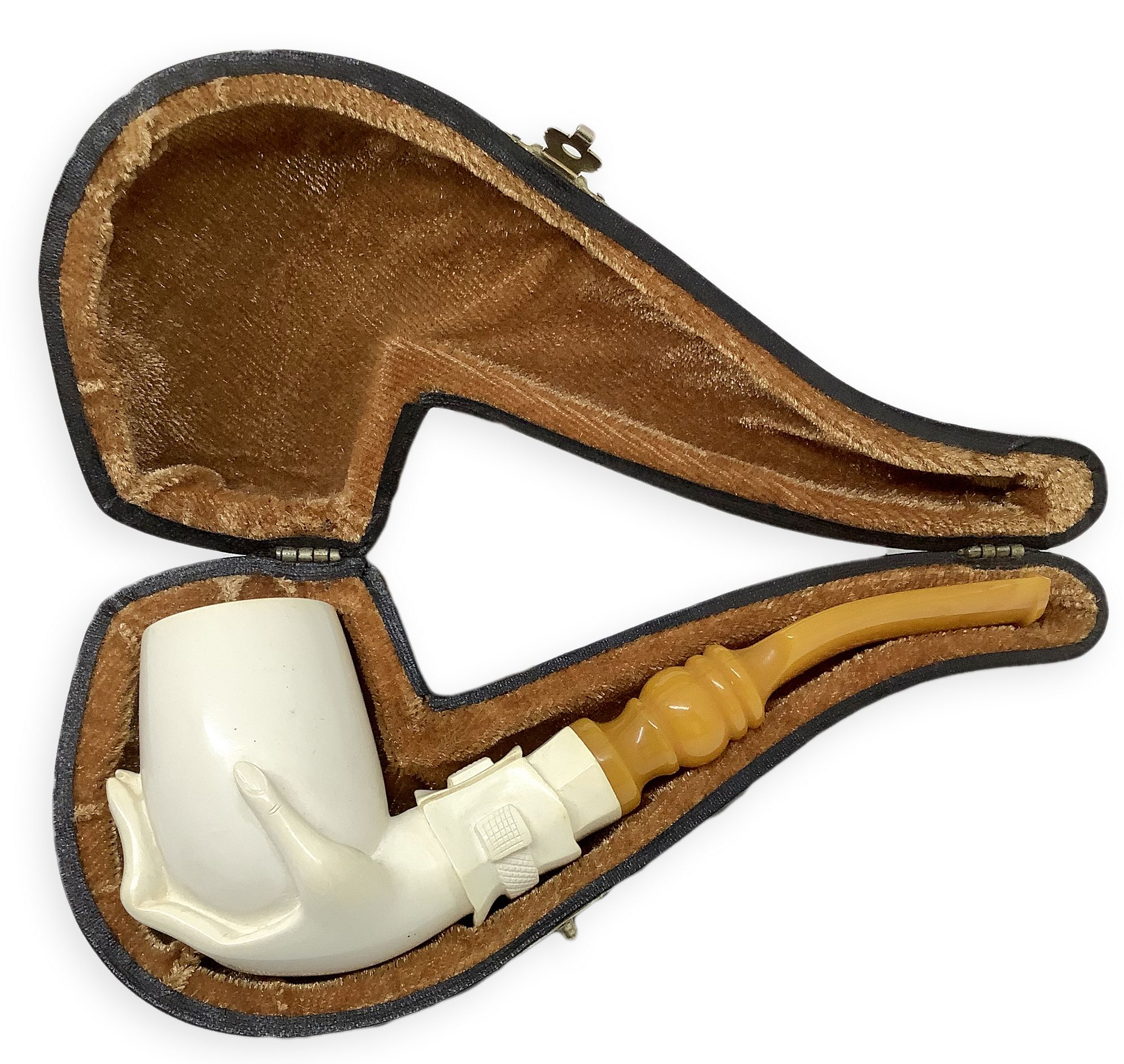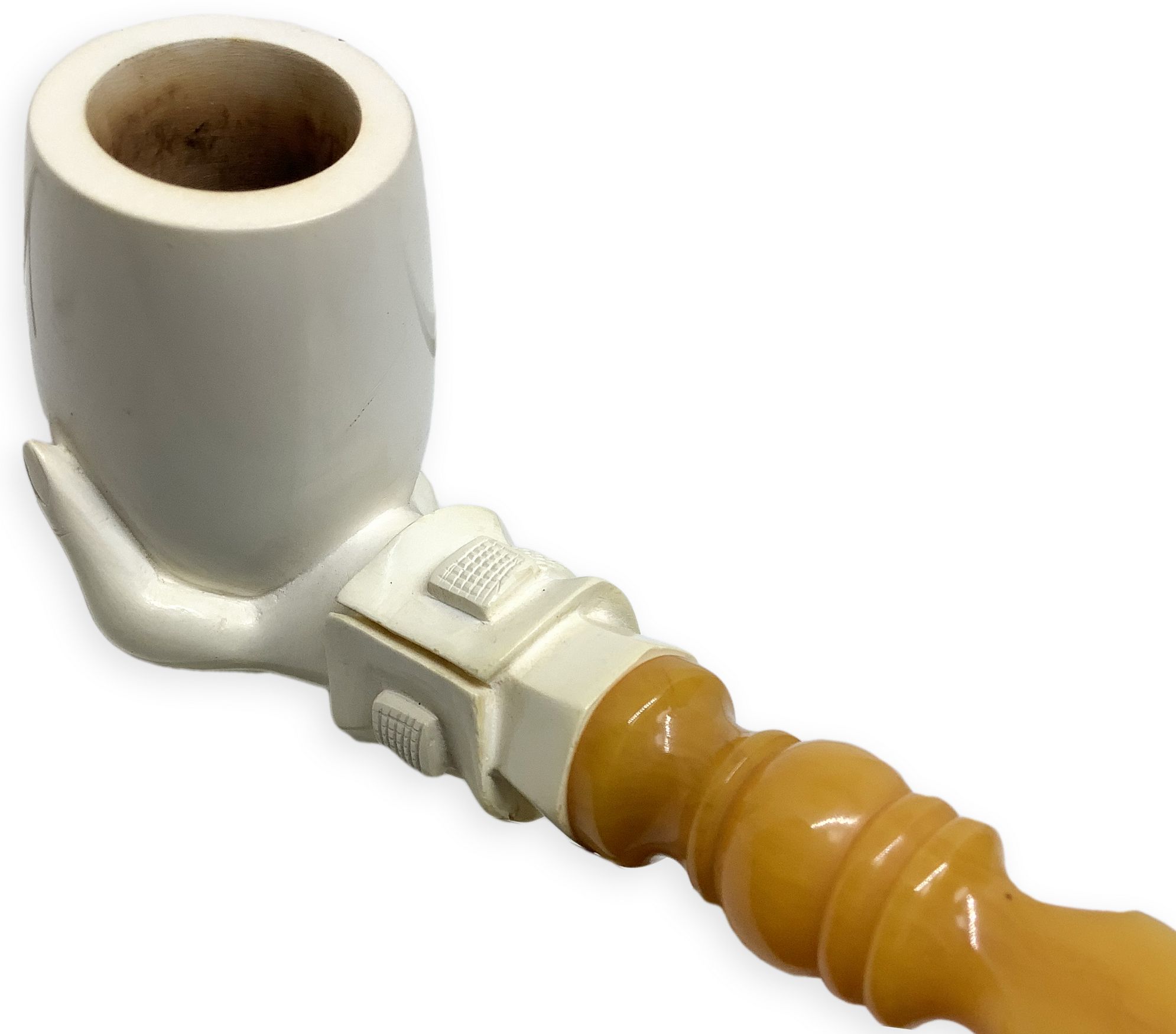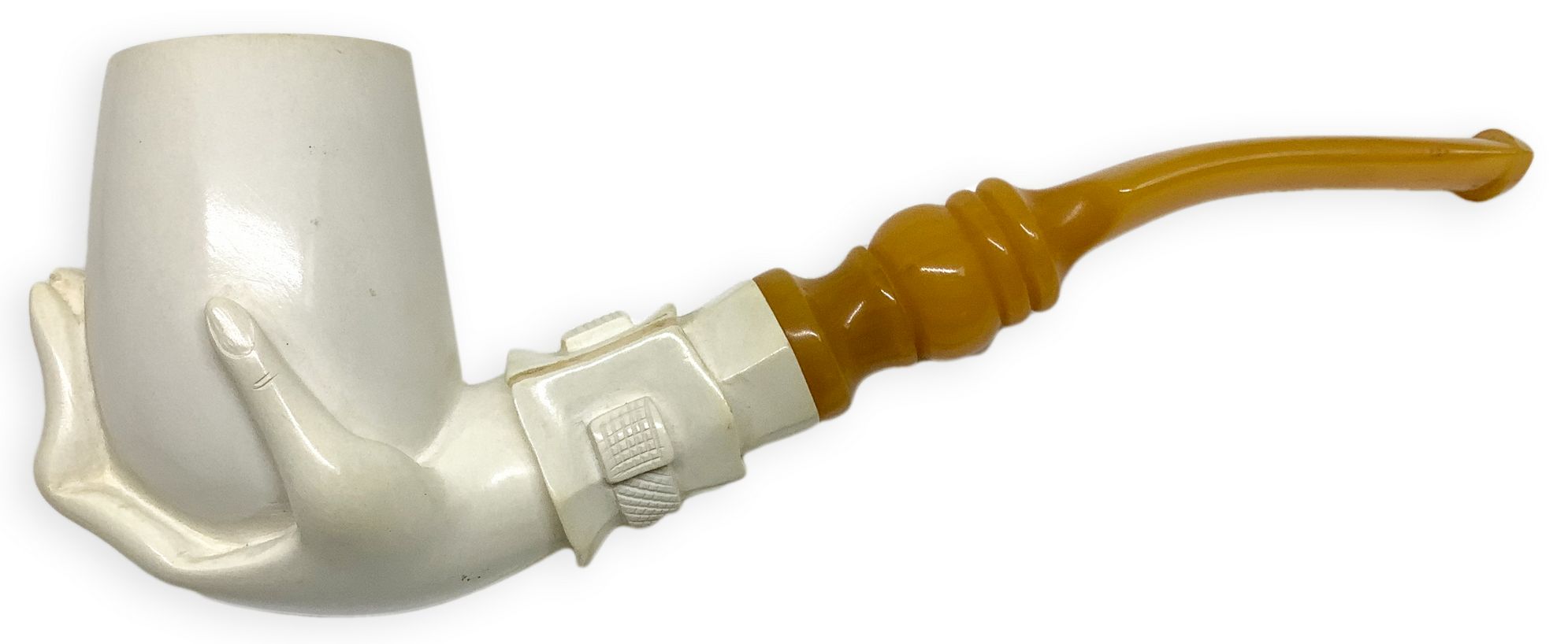 Raffigura una mano sinistra con polsino di camicia dell’Ottocento che tiene nel palmo il fornello della pipa. Il polso e parte del braccio sono costituiti dal cannello.