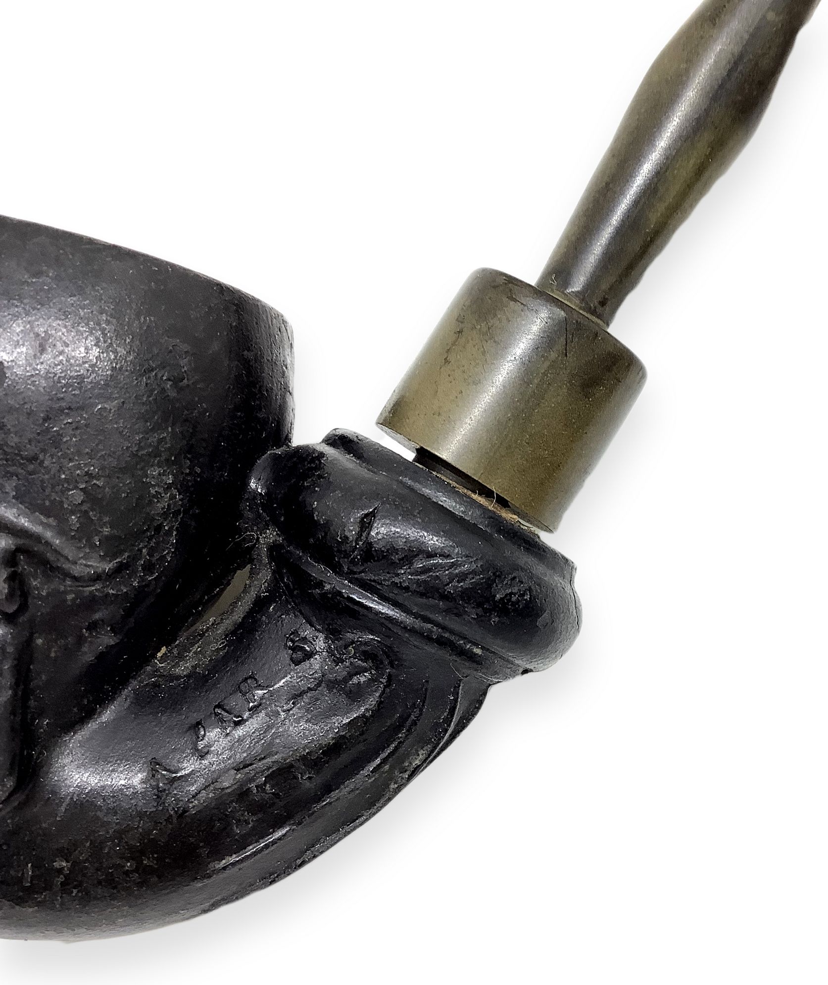 Il cannello, in argilla di colore nero, raffigura un braccio ed una mano appena abbozzato che sostiene il teschio. Sul braccio incisioni decorative a sbalzo. Nella parte finale del cannello un grosso rigonfiamento raffigurante la manica di una tunica, evidenziato, sopra e sotto, da due striature. Sulla parte destra del cannello è incisa a sbalzo la firma dell’artigiano “ GAMBIER “ ed il nome della ditta ed la città “ HIPOLYTE LEON BONNAUD MARSEILE