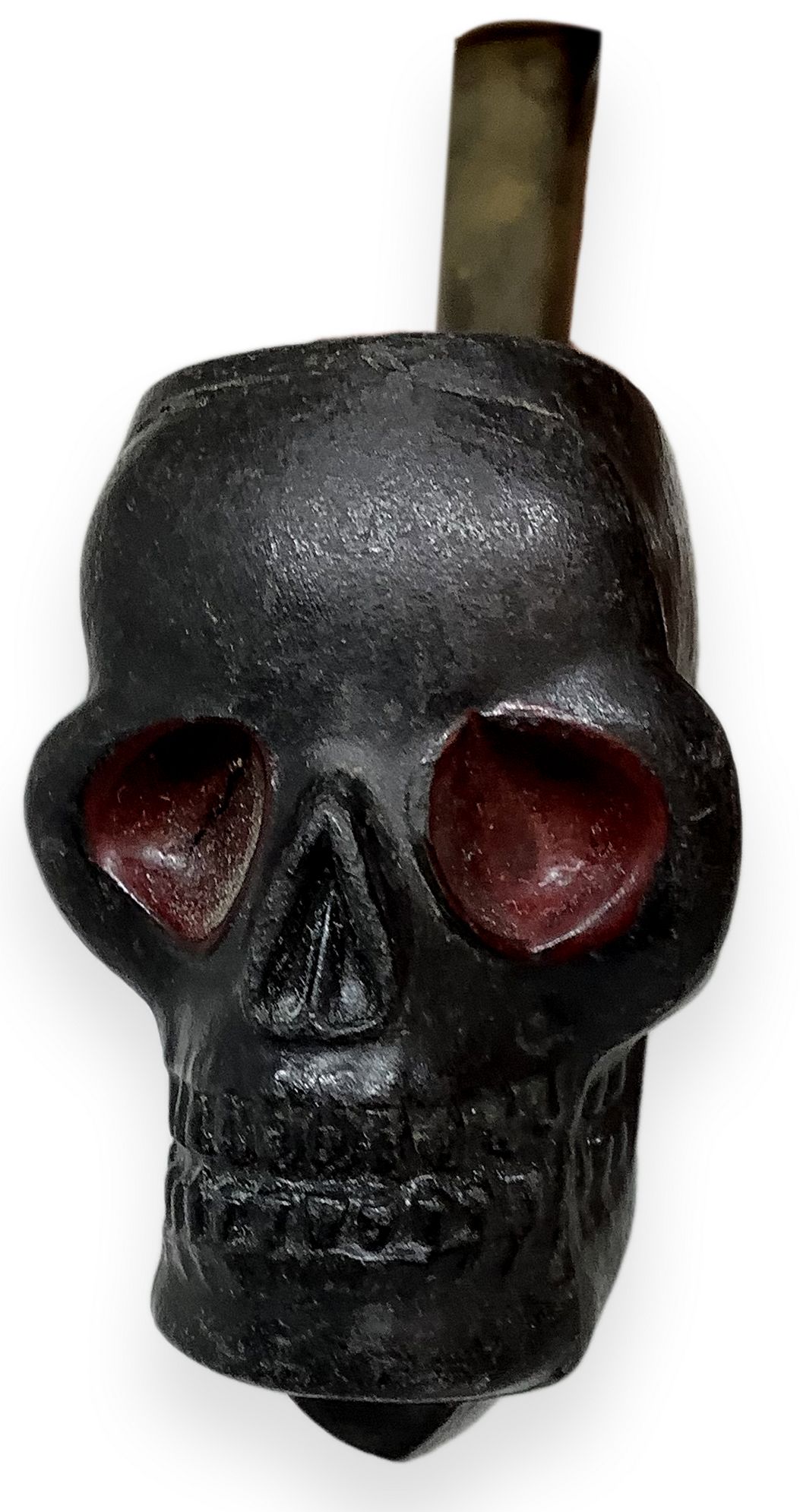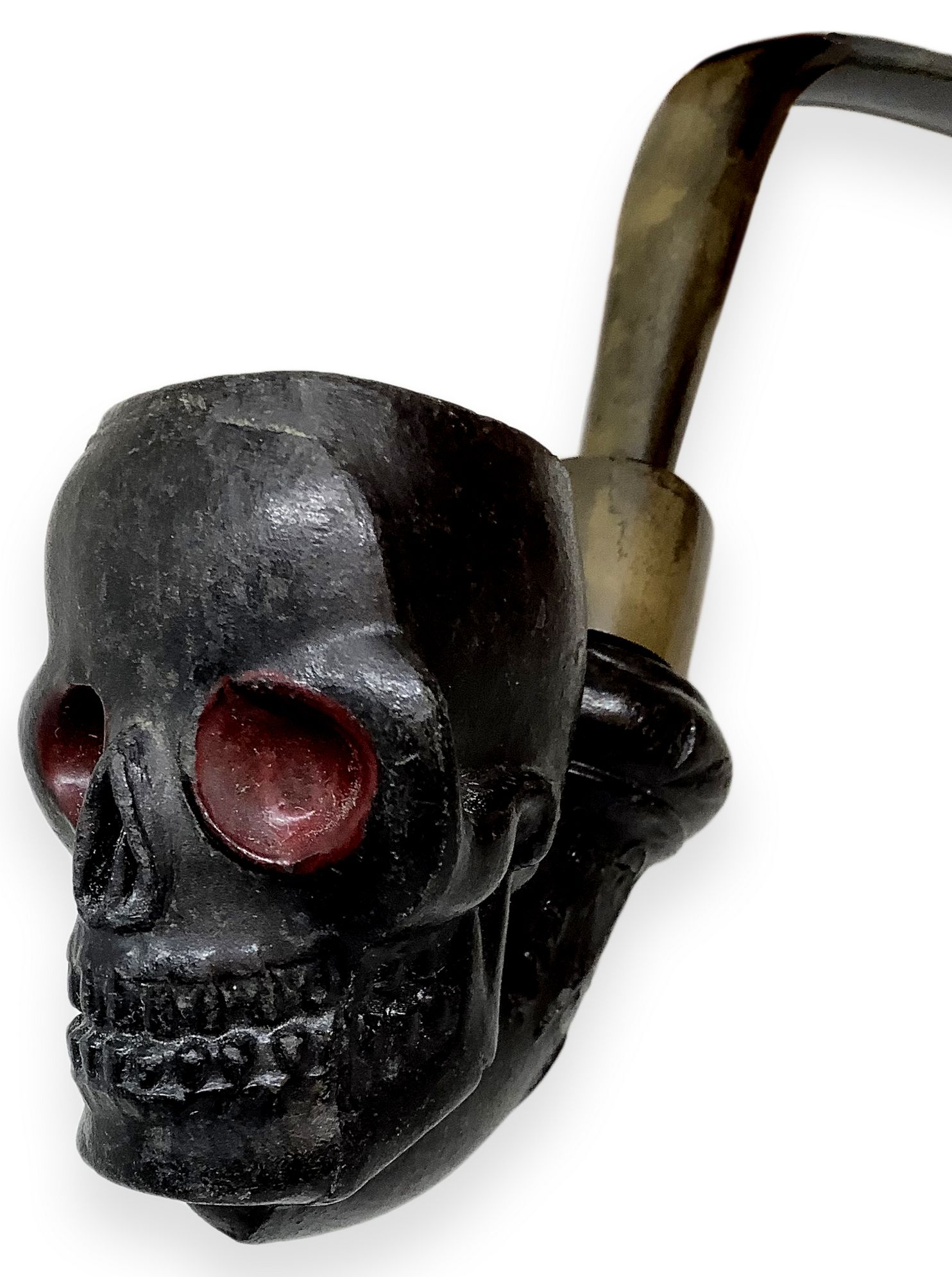 Il fornello, in argilla di colore nero, raffigura un teschio frontale con orbite di colore rosso. L’alta ossatura della fronte costituisce la bocca del fornello.