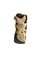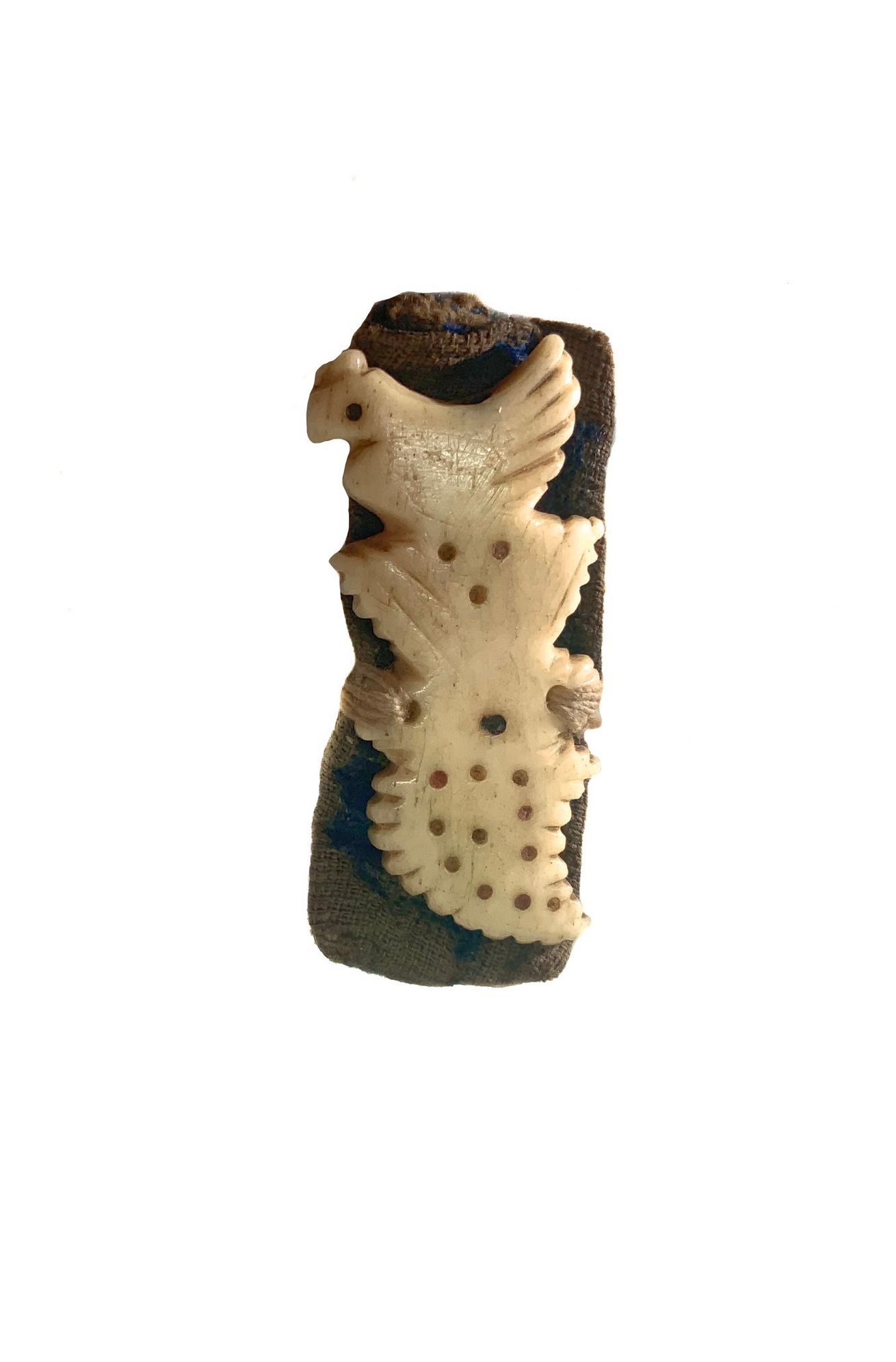 Amuleto con gallo, viso umano e simboli magico-apotropaici. In avorio. Area orientale. Sec. XV d. C. circa Si tratta di un amuleto magico-apotropaico in avorio costituito da una scultura divisa in tre parti. Nella parte superiore è raffigurato un gallo, in posizione sovrastante, antico simbolo della virilità e della rinascita. Nella parte mediana è raffigurato il viso di una figurina maschile, frontale, con barba e lunghi capelli. Nella parte finale l’amuleto assume la forma leggermente arcuata verso sinistra ed appuntita come quella di un corno schiacciato. Sulla parte mediana sono incisi n. 3 piccoli cerchietti, mentre nella parte finale sono incisi n. 11 piccoli cerchietti. Sulla parte dorsale del gallo vi è un foro che permetteva l’inserimento di un perno con anelletto passante per l’applicazione di un cordoncino e poter così appendere al collo l’amuleto con funzione protettiva o propiziatoria. L’amuleto è fissato su una base di pelle marrone coeva mediante due fili cuciti attraverso due fori passanti laterali. Tenendo l’amuleto dalla parte finale estrema, appare la raffigurazione del gallo sovrastante ed il corpo di un personaggio maschile con un cerchietto all’altezza addome-pube. Capovolgendo l’amuleto e tenendolo dalla parte finale estrema appare raffigurato il corpo di una figura femminile con un ampio vestito e con l’organo genitale femminile sottolineato da tre cerchietti. H cm. 4,5; larg. cm. 1,5. Rarissimo esemplare di amuleto magico-apotropaico
