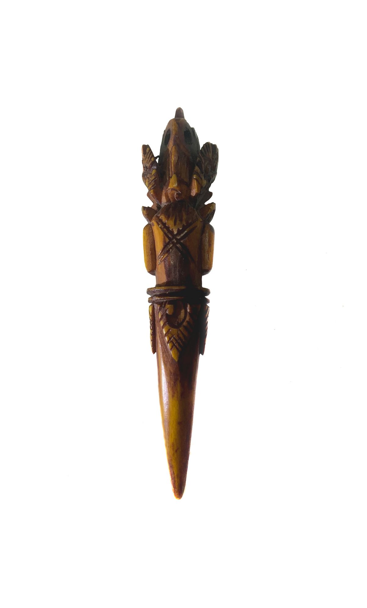 Descrizione: Si tratta di un amuleto magico-apotropaico in avorio scolpito a mano a tutto tondo che raffigura il busto di una divinità demoniaca, con enormi orecchie e corona sul capo.