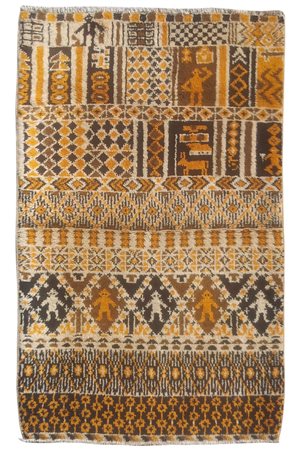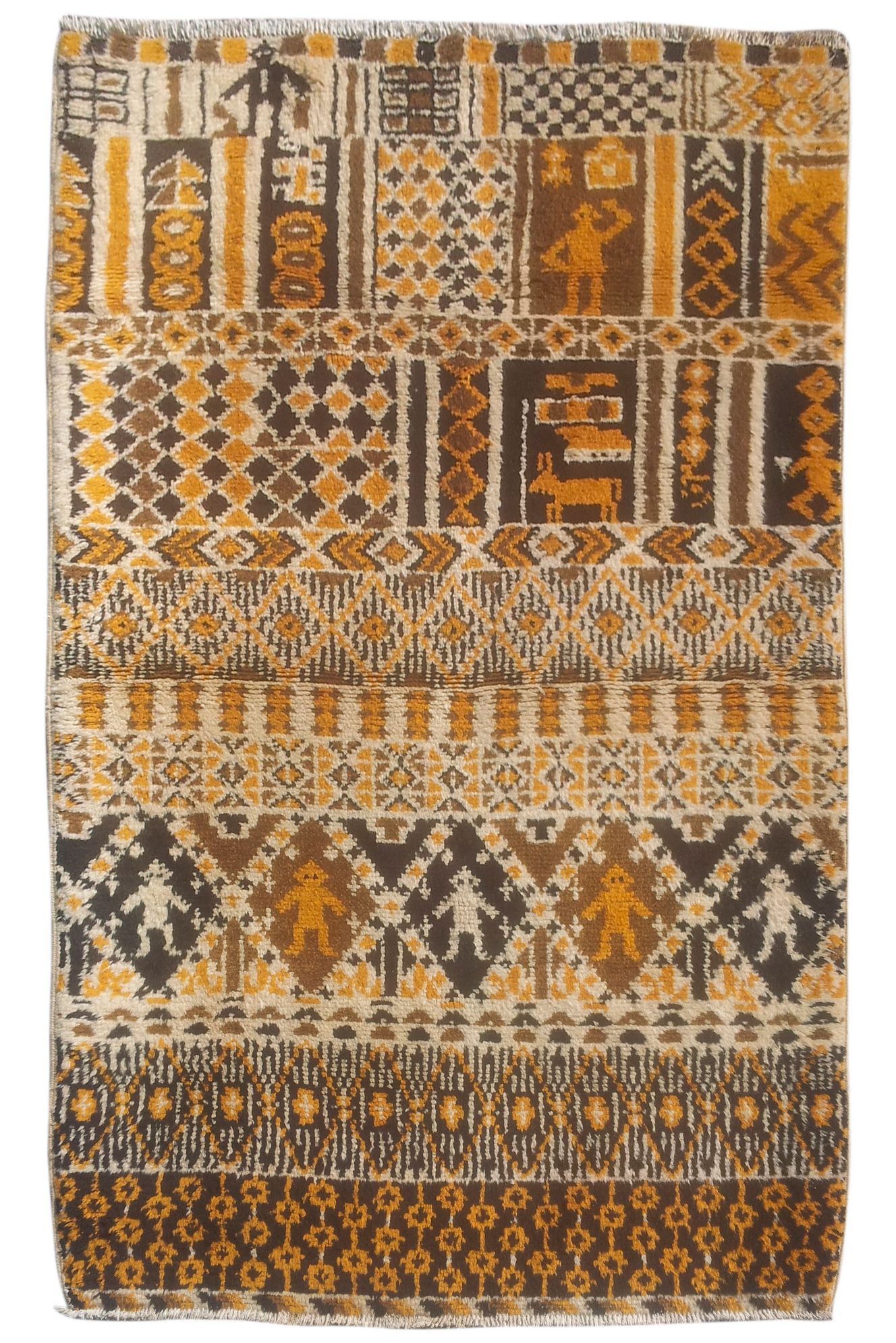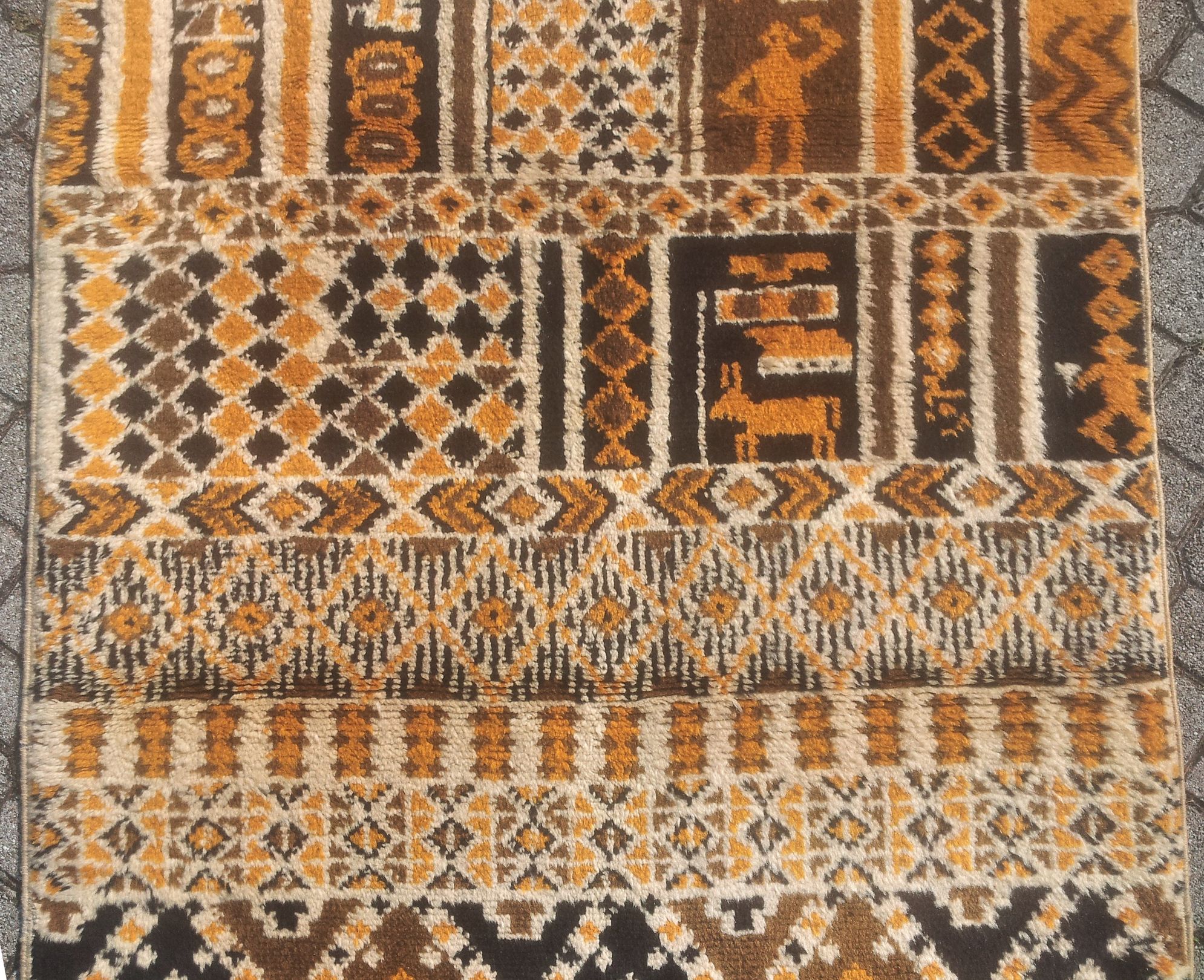 Tappeto Berbero, Marocco, 1970 ca, cm. 210x125, ordito, trama in cotone e vello in lana. Ottimo stato di conservazione. Realizzato dalle tribù Berbere, insolita figura umana con animali nel campo delineato da diverse campiture di disegno.