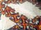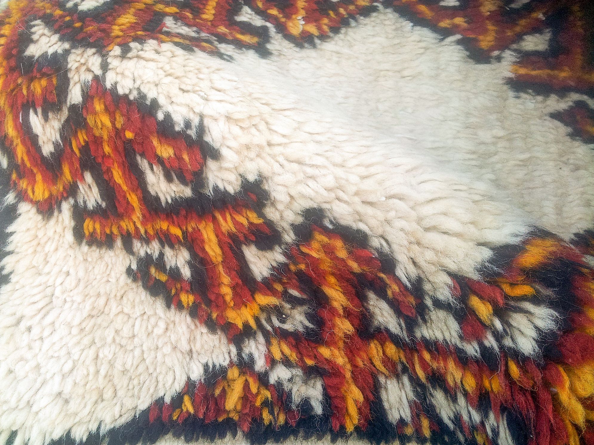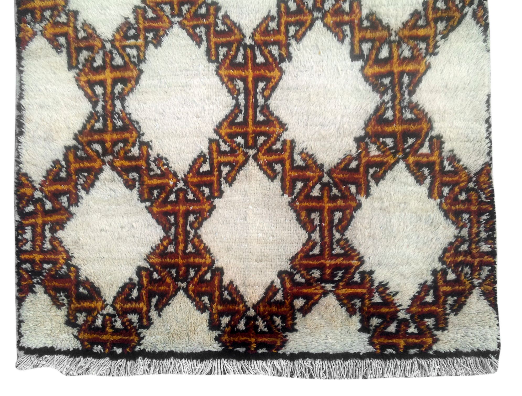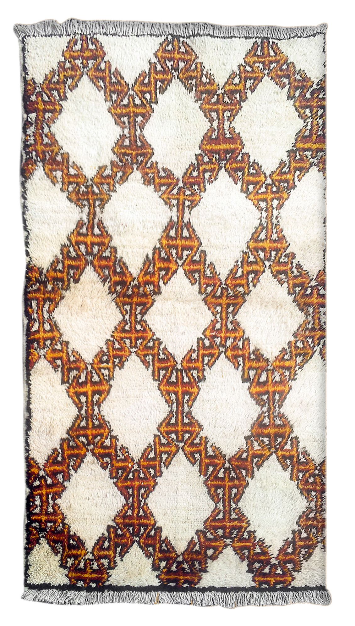 Tappeto Berbero, Marocco, 1970 ca, cm. 199x115, ordito, trama e vello in lana. Su un fondo bianco una griglia a losanghe moresche si staglia su un vello alto e soffice. Buono stato di conservazione.