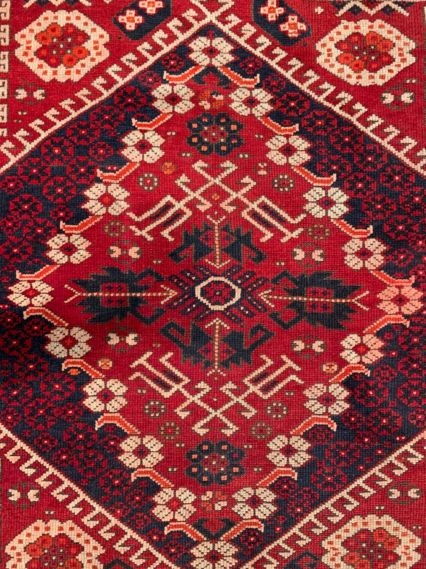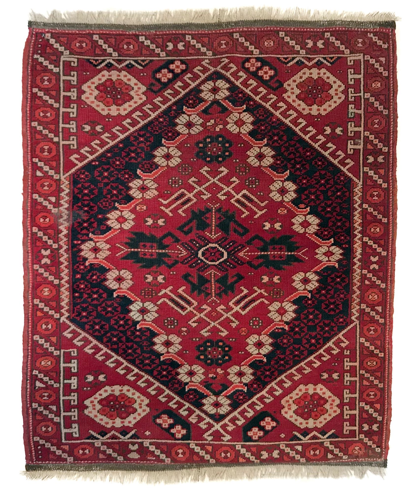 Tappeto Bergama, Anatolia Occidentale, inizi '900 ca, cm. 116 X 95, ordito, trama e vello in lana. Molto buono lo stato di conservazione. Classica doppia preghiera con impianto 4+1 con un grande medaglione a losanga centrale e 4 cantonali ottagonali ai lati.