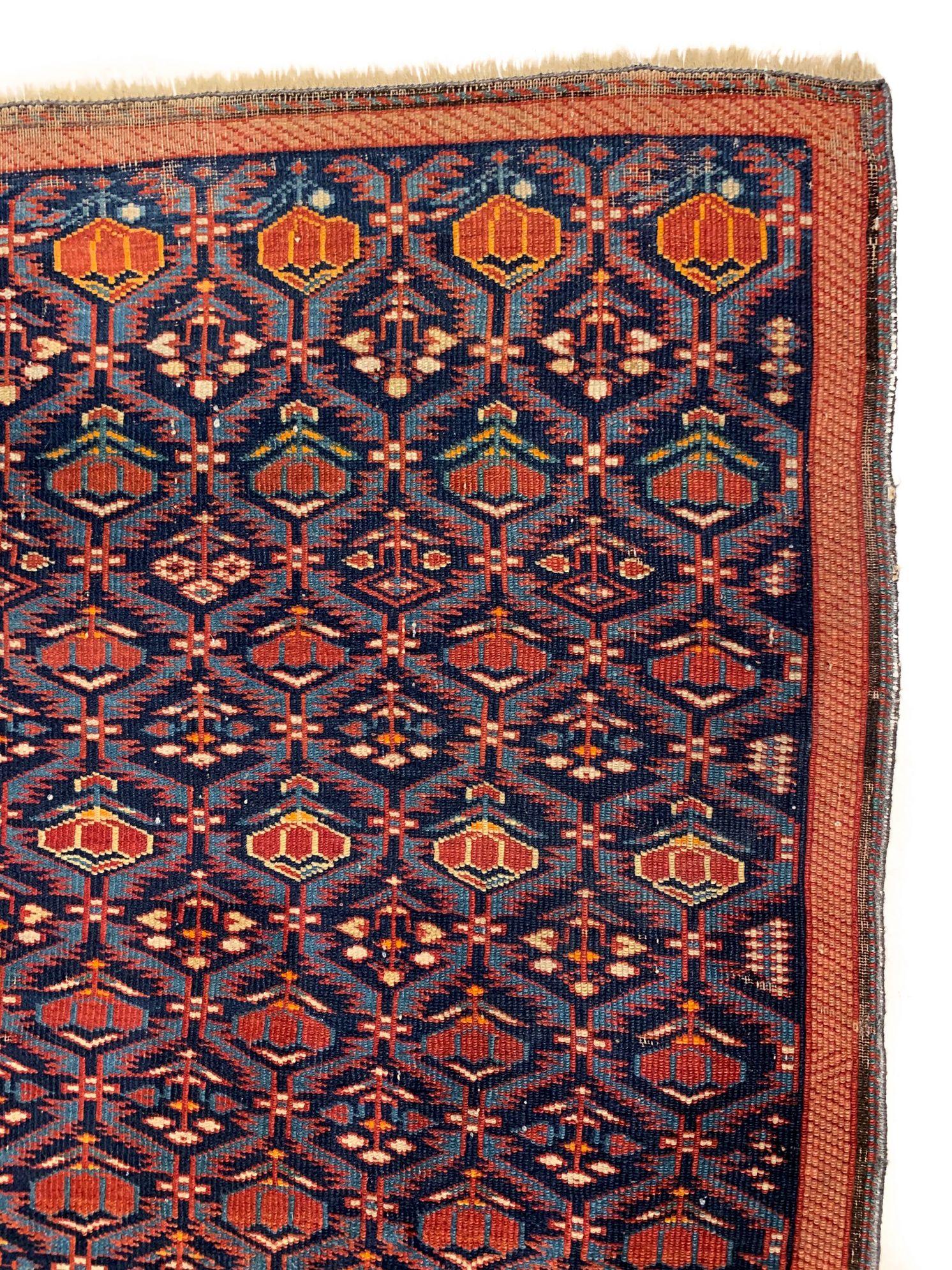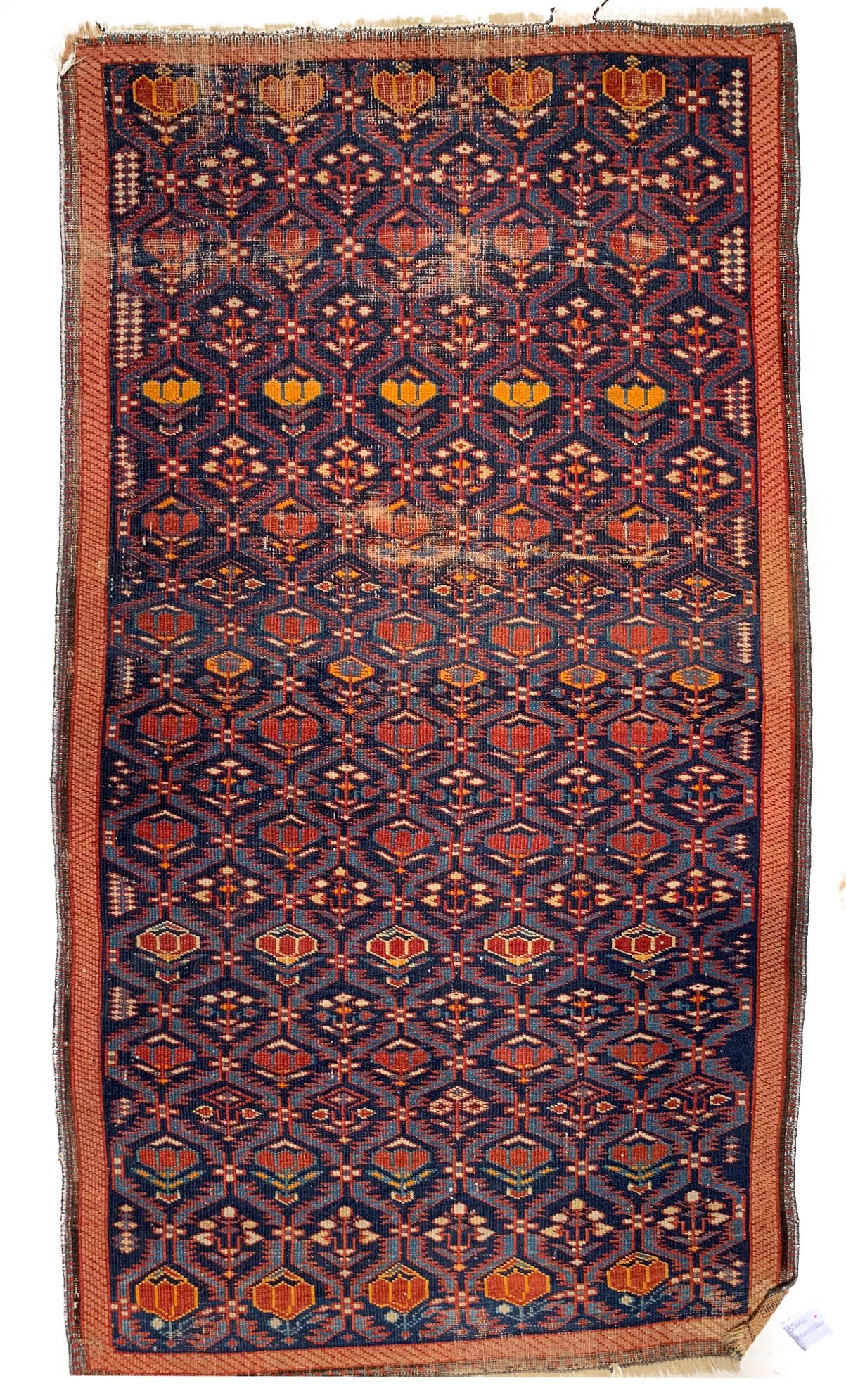 Tappeto Daghestan, Caucaso Nord Orientale, fine '800 ca, cm. 166 X 90, ordito, trama e vello in lana. Buono stato di conservazione, presenta alcune zone consunte. Elegantissimo ed austero tappeto con fittissima grigia a fiori stilizzati, cinto da una stretta bordatura a bande diagonali