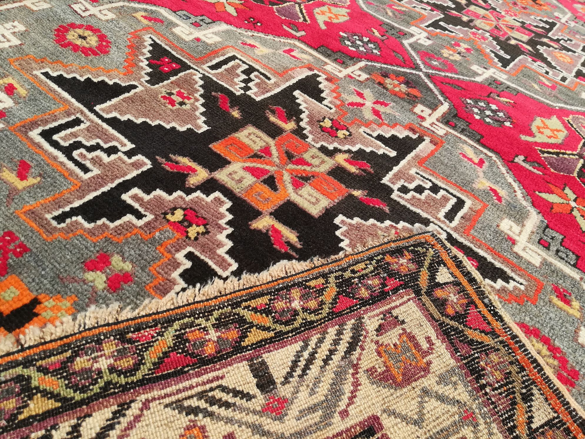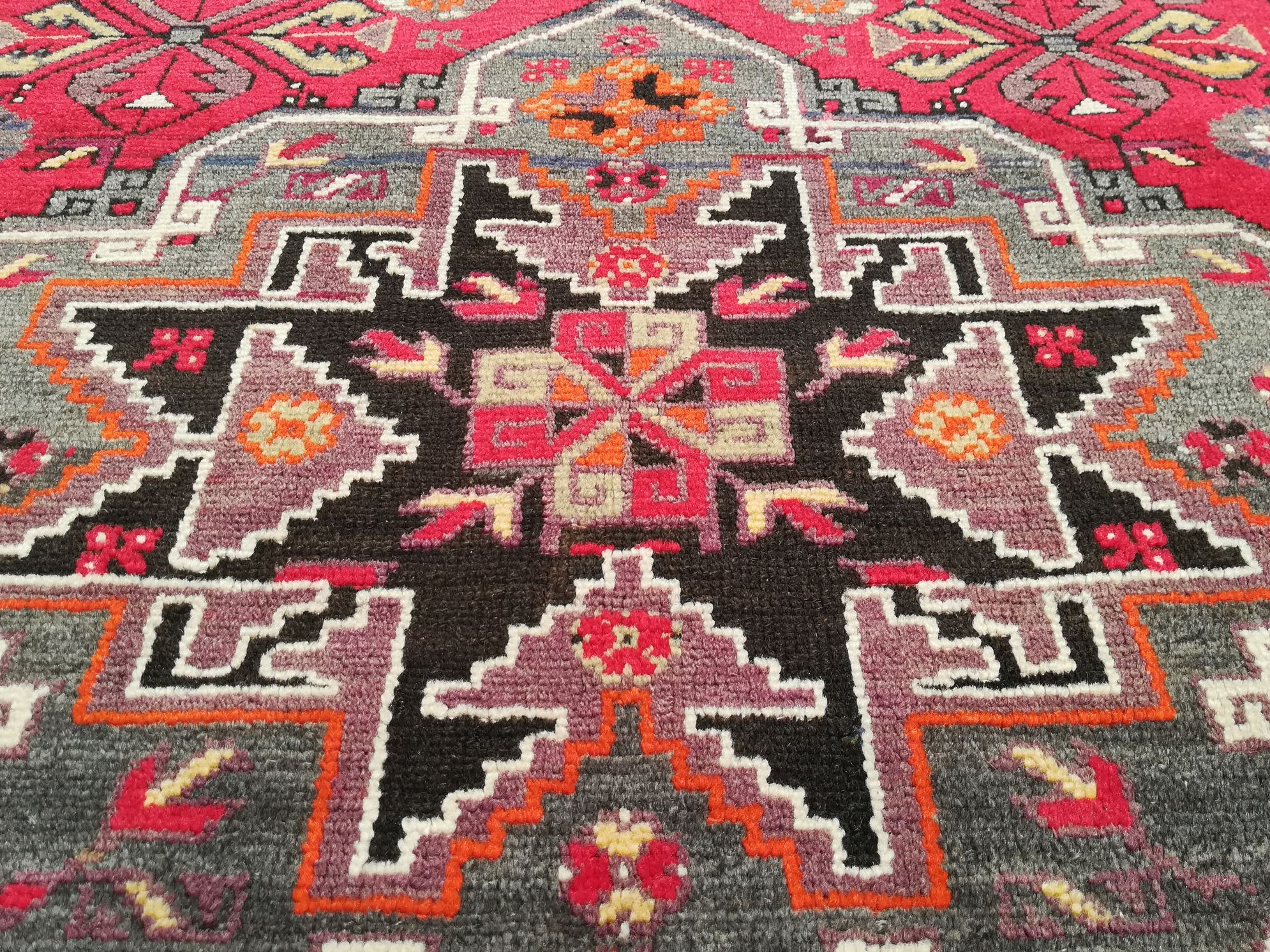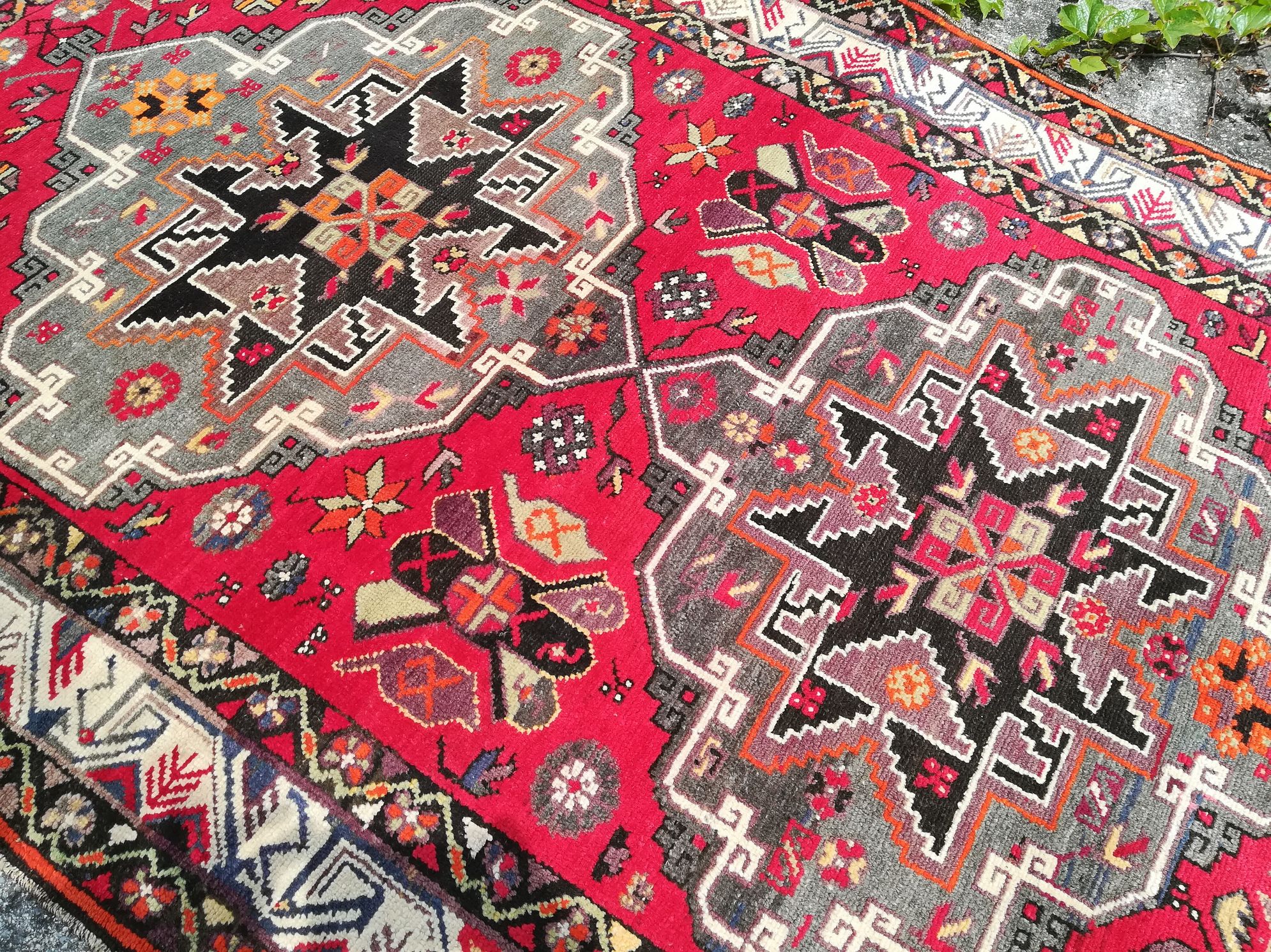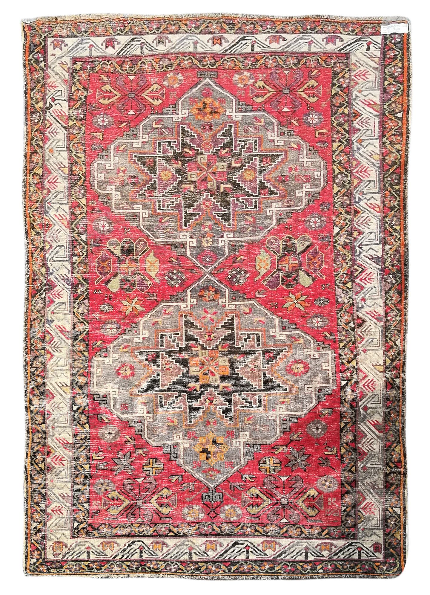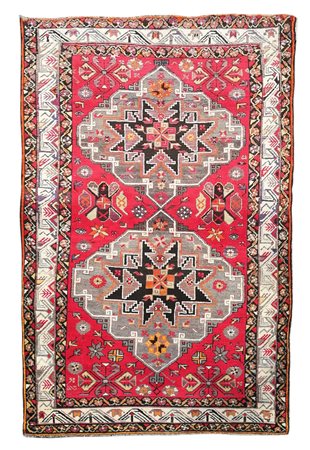 Tappeto Derbent Lesghi, Caucaso Nord Orientale, 1920 ca, cm. 194x126, ordito, trama e vello in lana. Ottimo stato di conservazione. Presenta due grandi medaglioni cruciformi contenenti le due stelle Lesghi, composte da arcaiche iconografie animalistiche e la bordura georgiana con il motivo a grifoni.