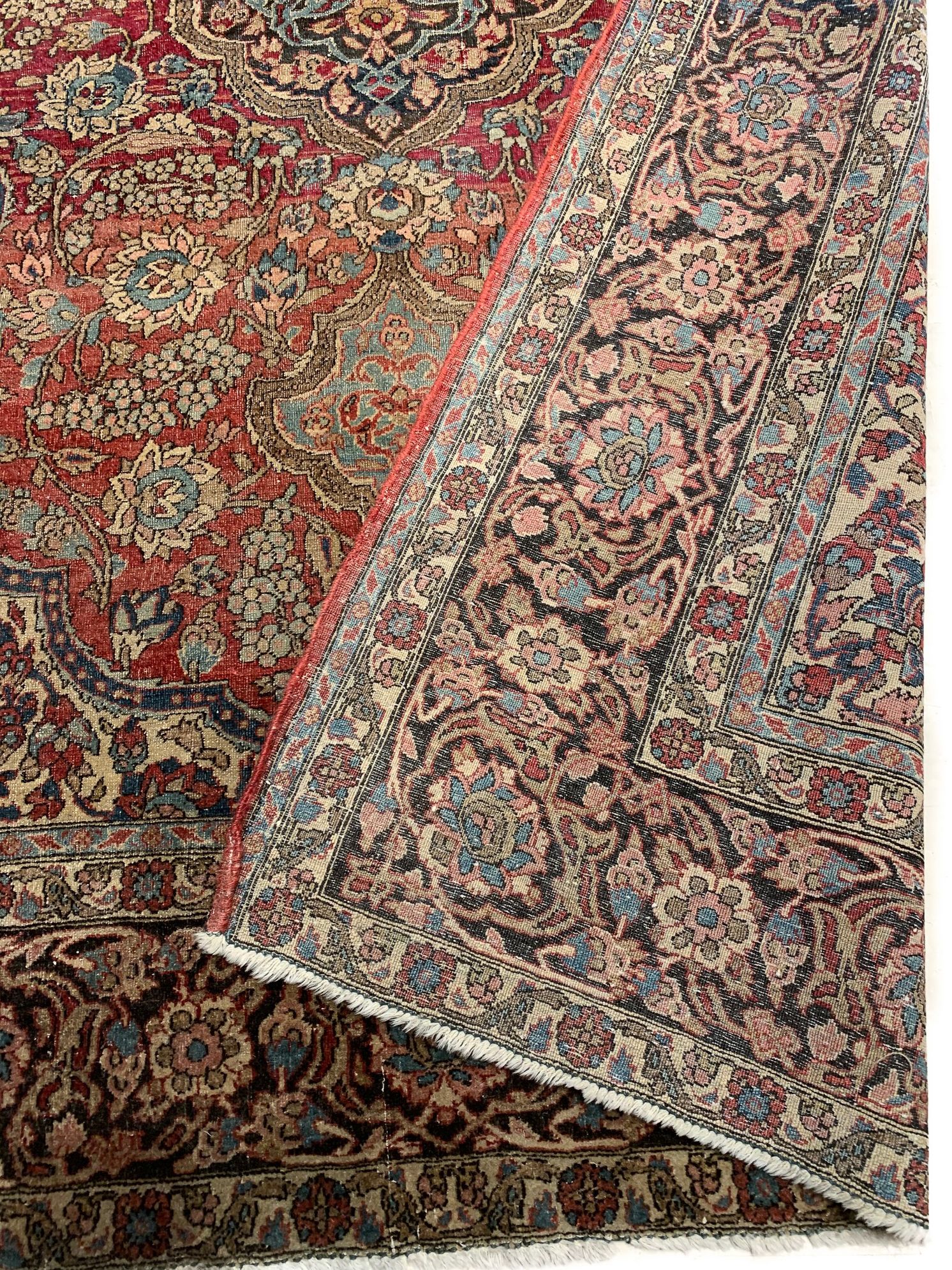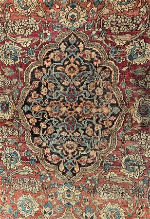 Tappeto Isfahan, Persia Centrale, 1880 ca, cm. 210 X 136, ordito e trame in cotone, vello in lana. Esemplare di rara bellezza e finezza, anche se non in condizioni ottimali. Un classico dell'arte dell'annodato in Persia nella sua composizione a medaglione centrale con grandi pendenti alle estremità e cantonali, lambiti da un andamento curvilineo che circonda la cuspide di una moschea. Esemplare da collezione.