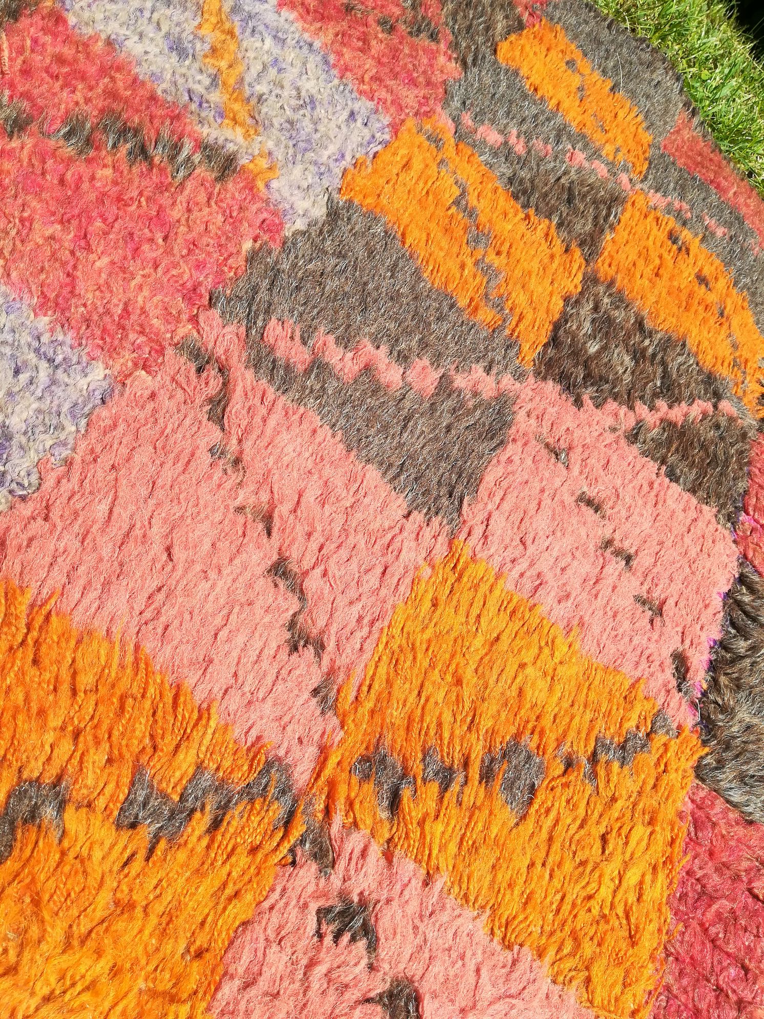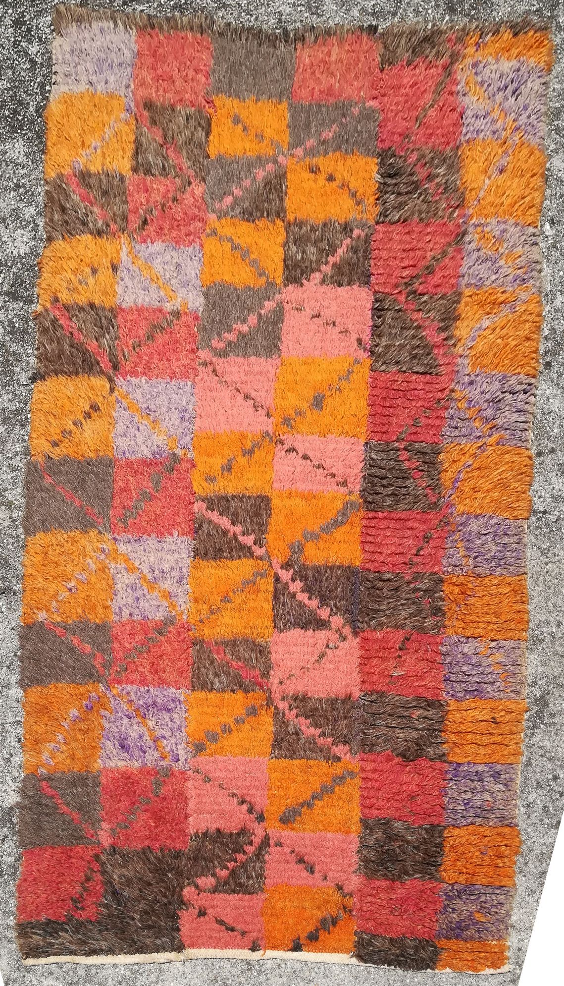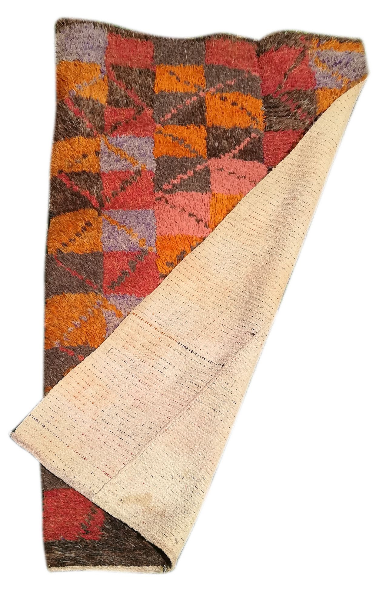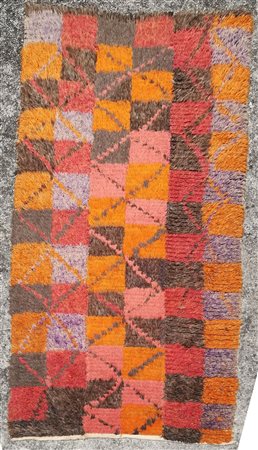Tappeto Julkhyr , Asia Centrale, 1930 ca, cm. 172x89, ordito e trama in cotone, lungo vello in Yak. Tipico esemlare delle steppe siberiane eseguito su piccoli telai orizzontali in tre fasce poi cucite assieme, usato in origine come coperta all'interno della yurta per ripararsi dai venti e dai climi rigidi che spezzano la steppa asiatica. Moderno e attuale nel suo impianto geometrico stilizzato