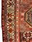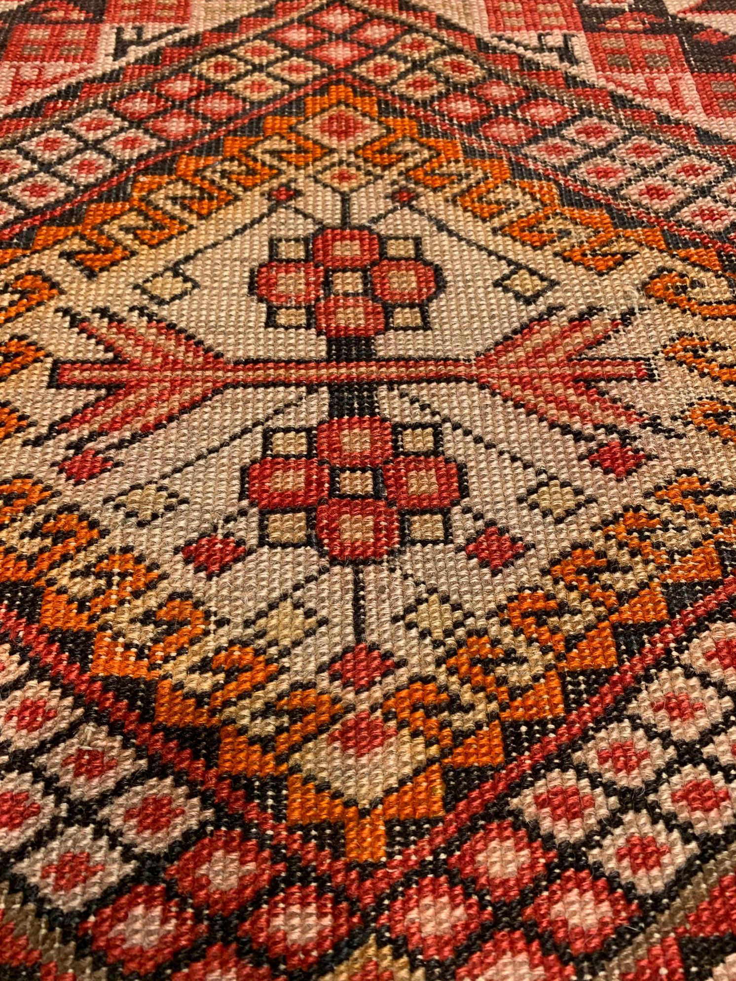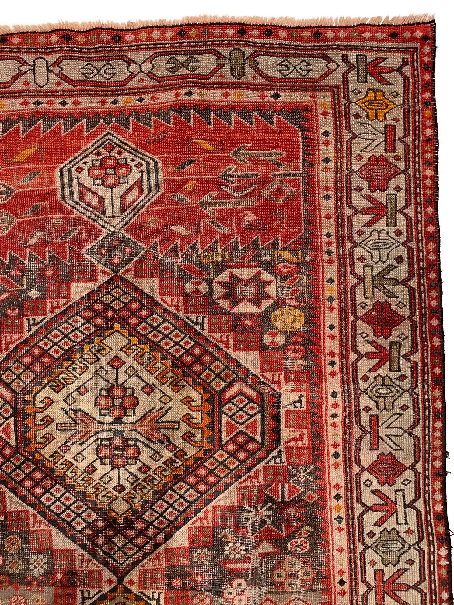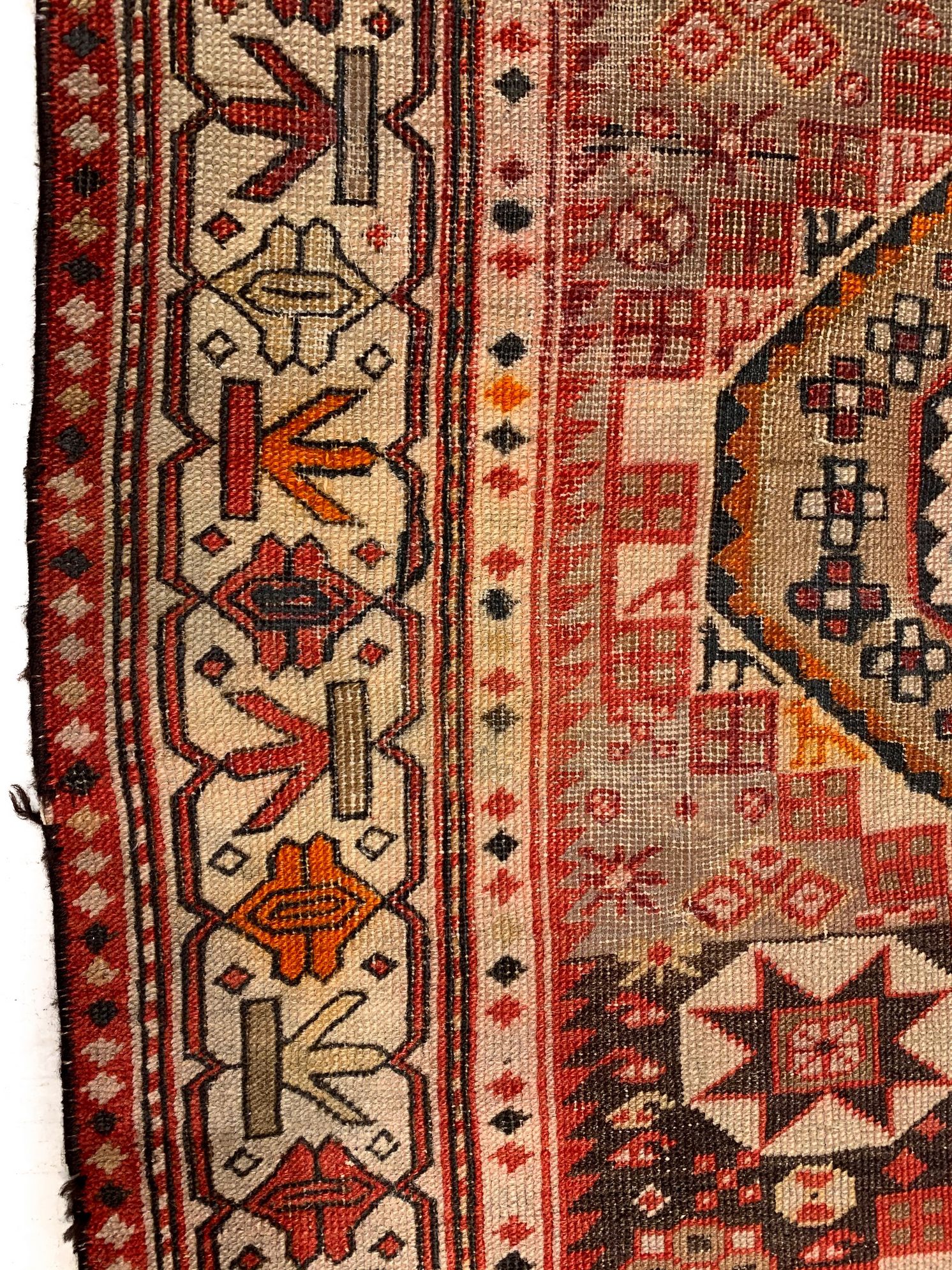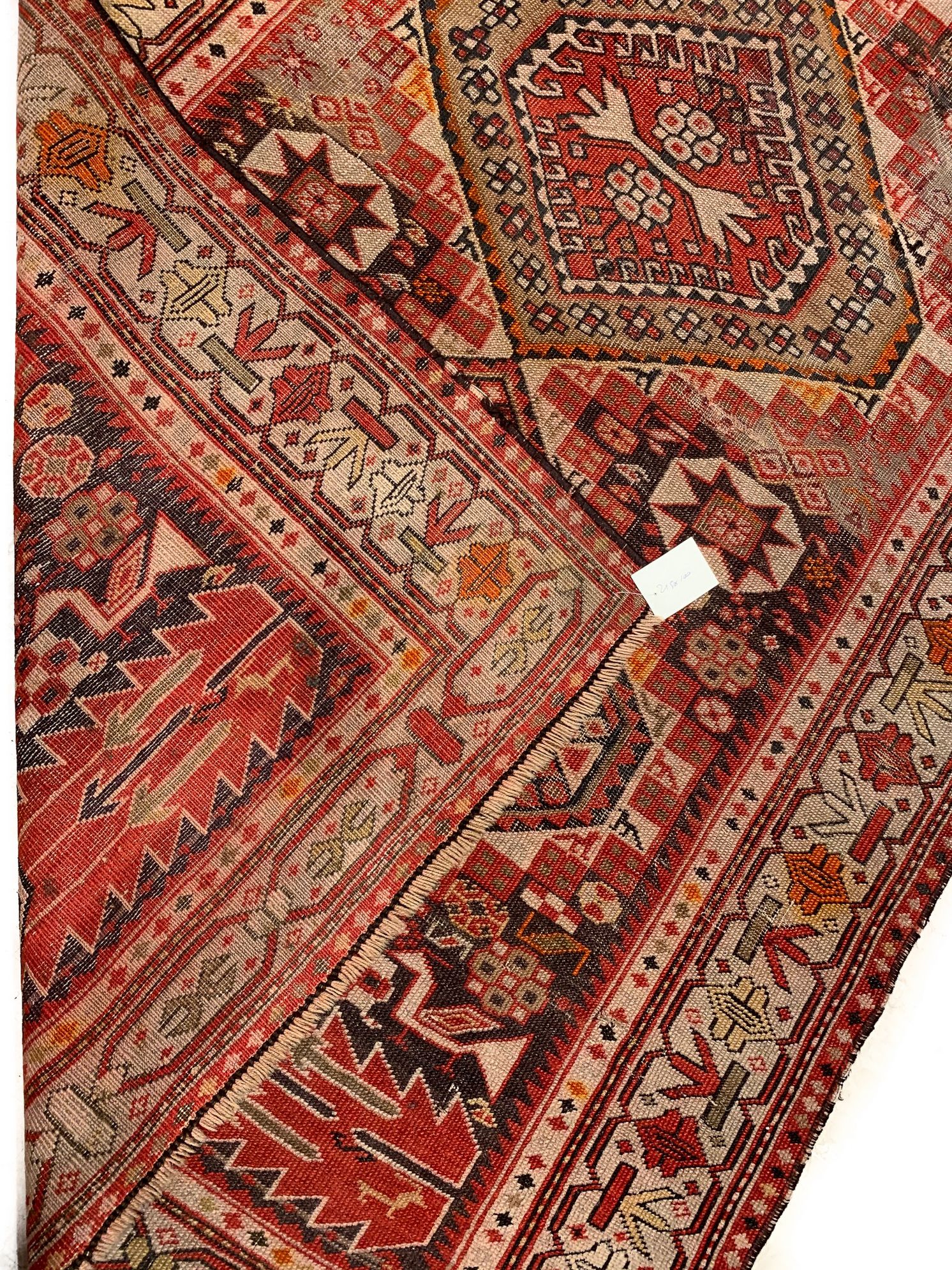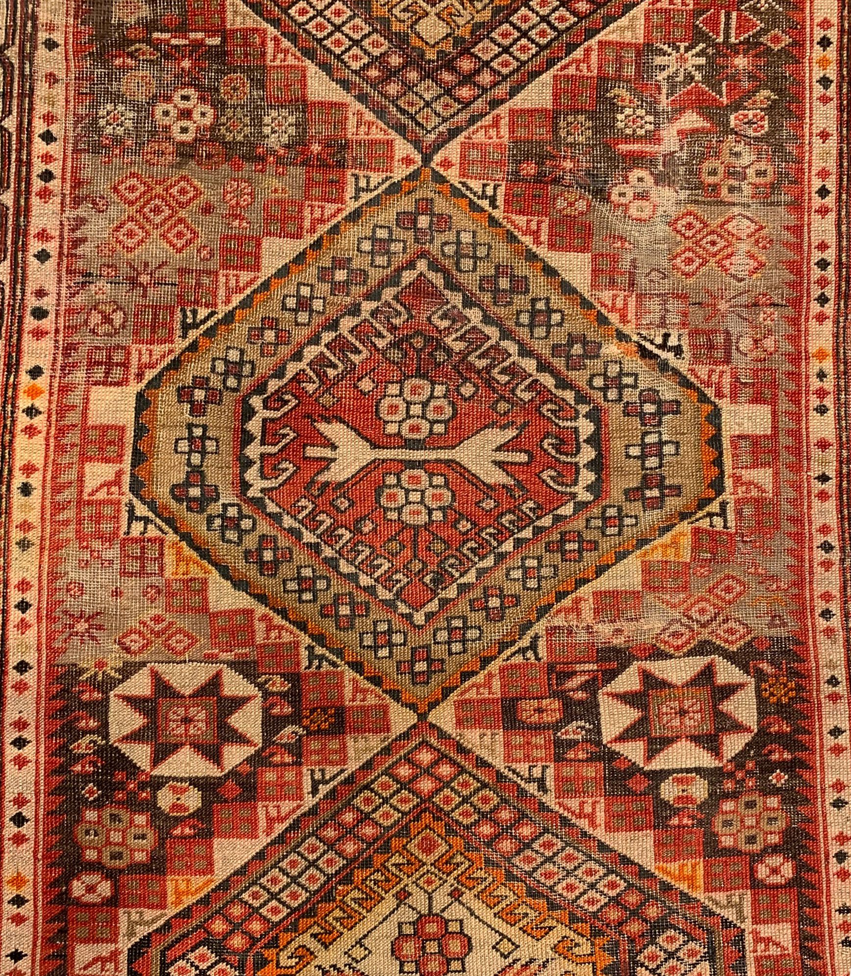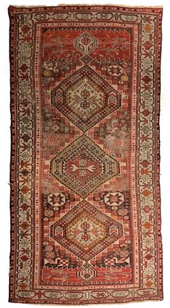 Tappeto Karabagh, Caucaso Meridionale, inizi '900, cm. 215 X 100, trama, ordito e vello in lana. Impianto centrale con tre losanghe scalettate, con motivi animalistici all'interno delle stesse e i motivi gubpa alle estremità. Basso di vello, ma nell'insieme in buono stato.