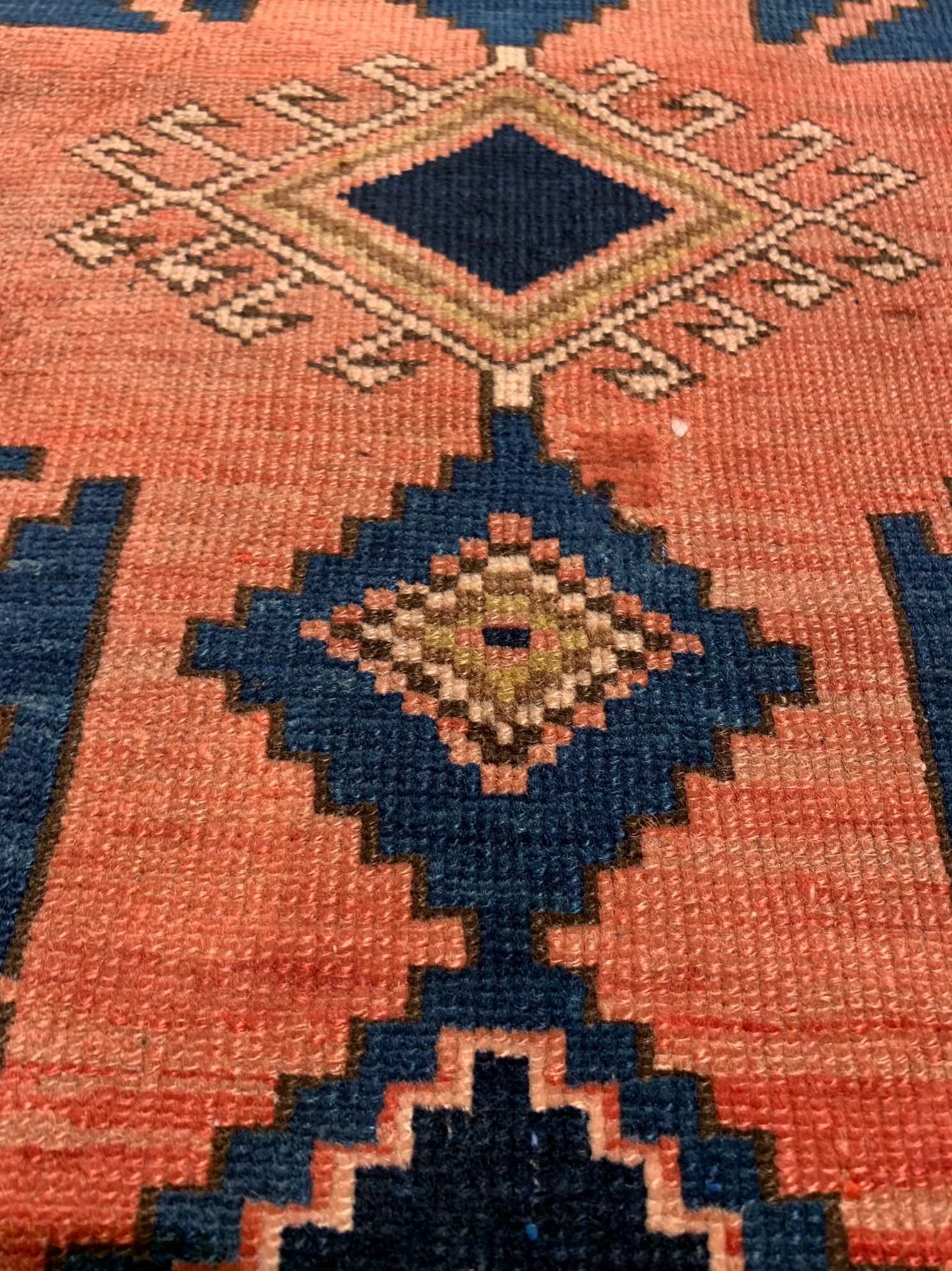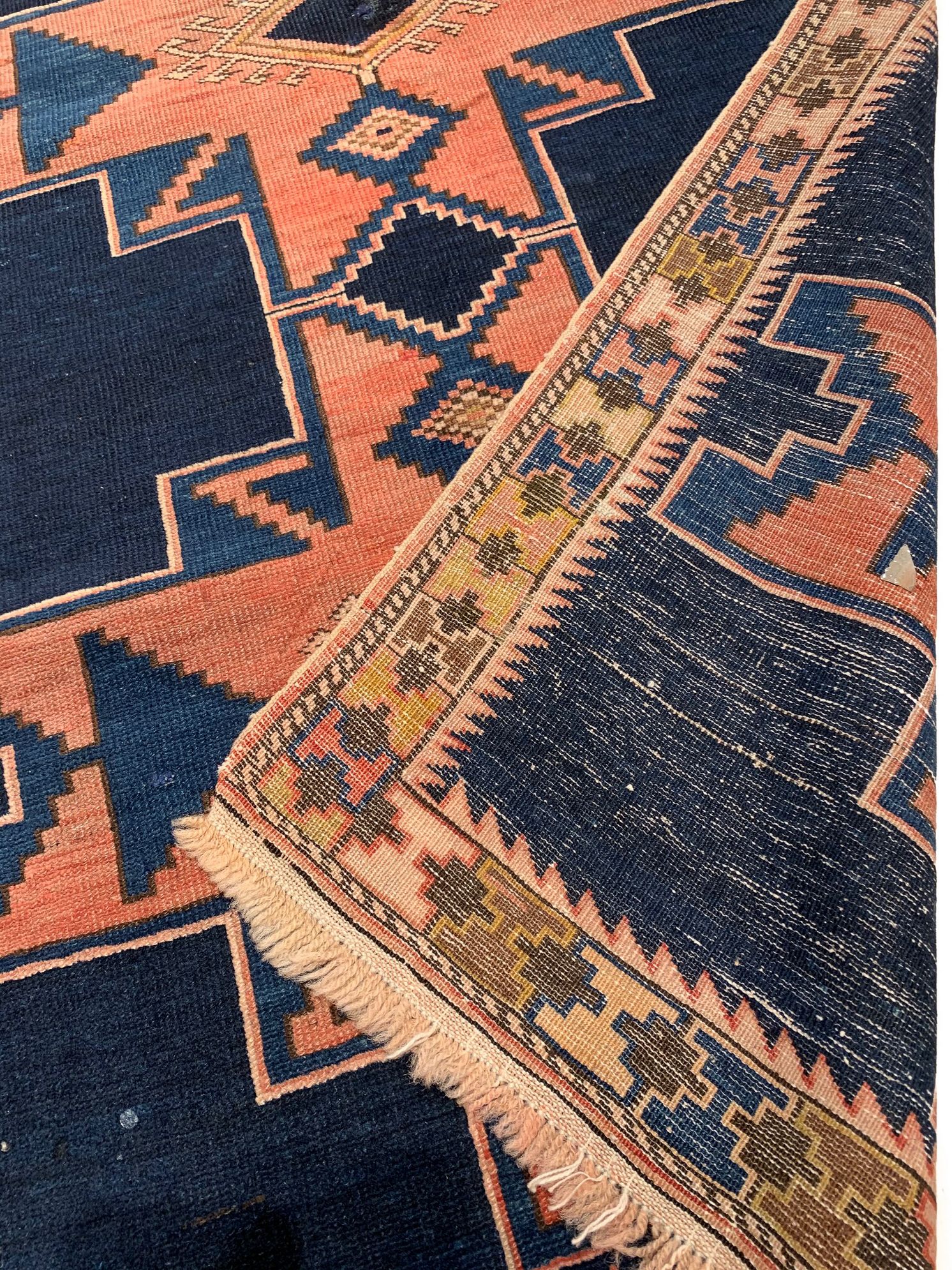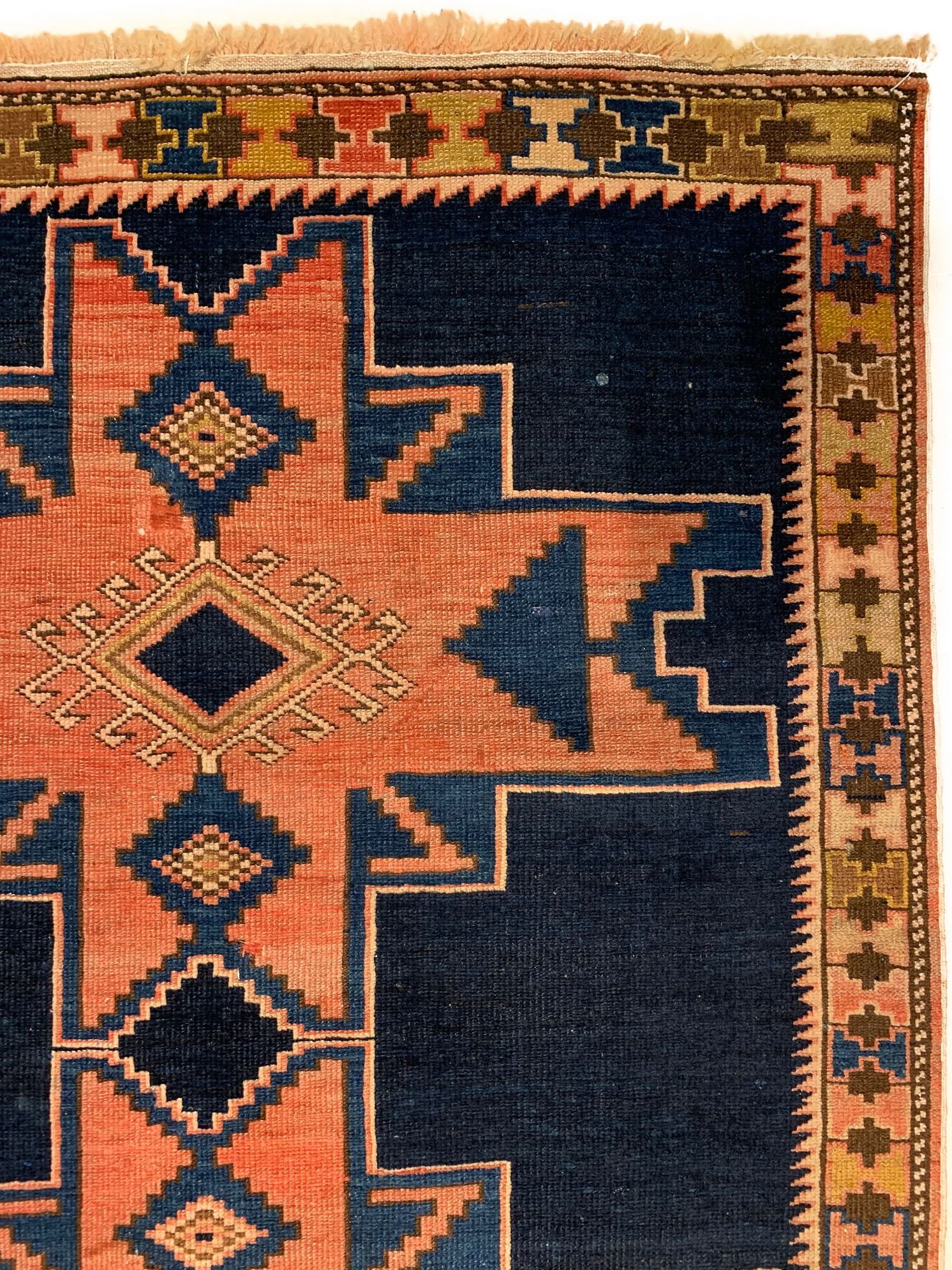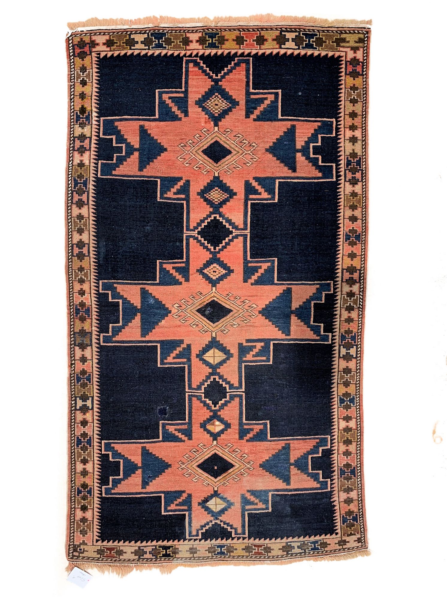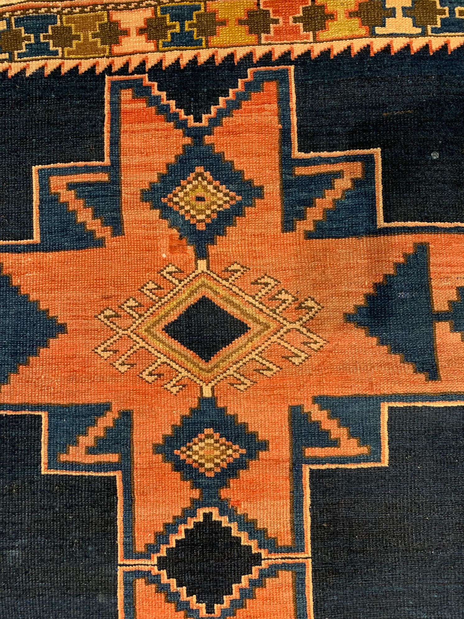 Tappeto Lesghi, Caucaso Nord Orientale, fine '800/inizio '900, cm. 149 X 83. Imponente ed essenziale l'impianto a gandi stelle Lesghi. I colori rossi e blu sono tipici della regione del Daghestan. Buono stato di conservazione