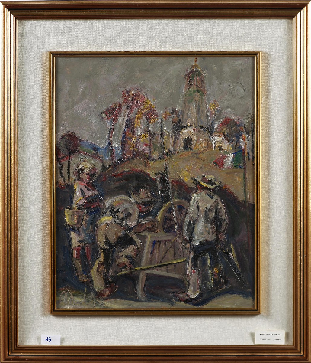 MUCHETTI TANCREDI (n. 1932) Senza titolo. Olio su tela . Cm 40,00 x 50,00. Firma in basso a sinistra. Cornice presente