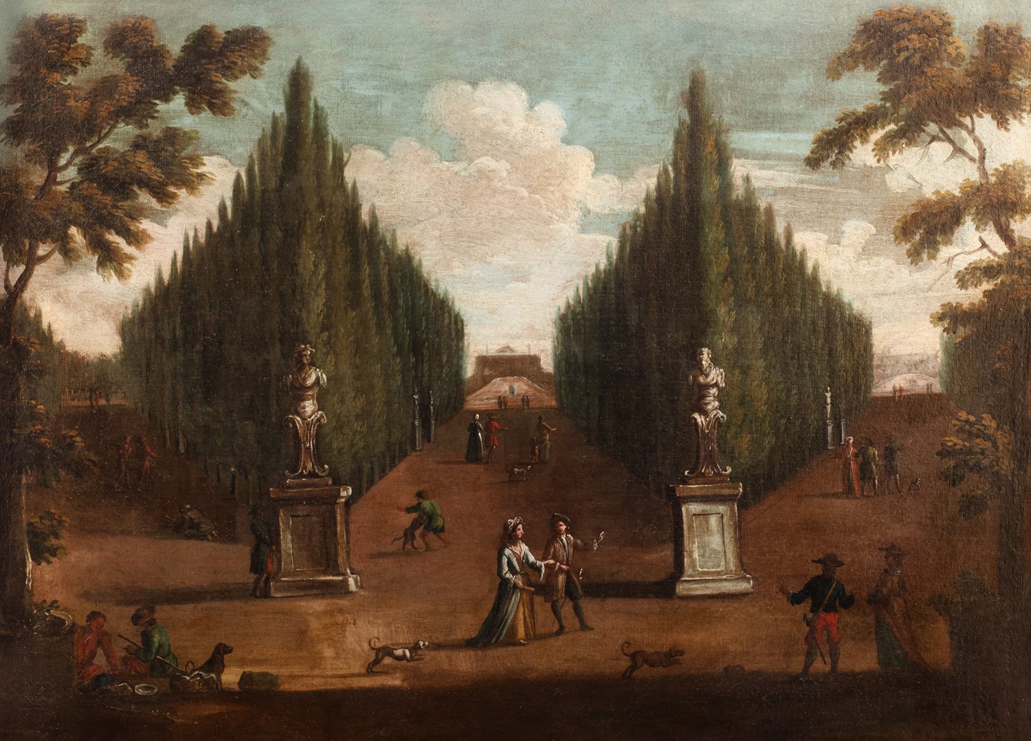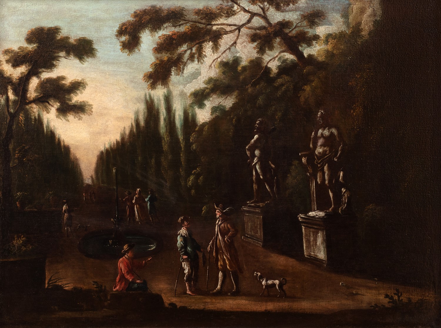 Scuola veneta, secolo XVIII - Giardino di una villa con astanti; e Giardino di una villa con mendicanti presso sculture antiche