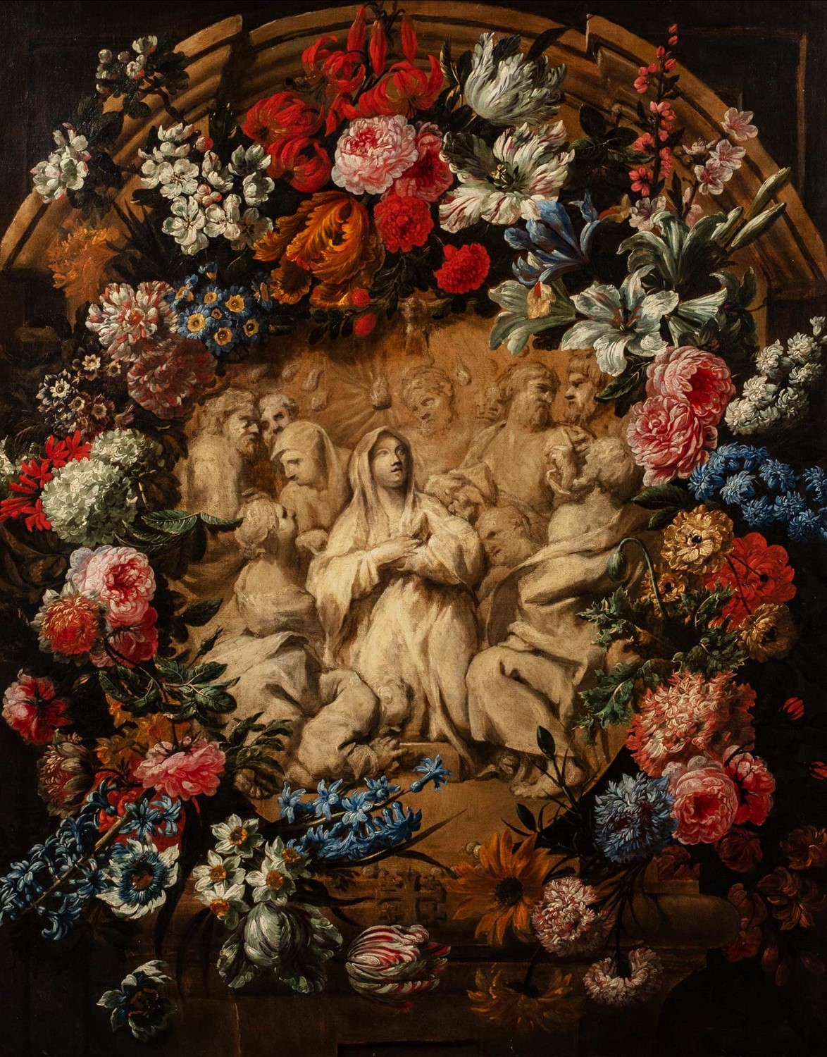 Nicola van Houbraken (Messina 1668-Livorno 1723) - Trompe-l'oeil con bassorilievo in marmo raffigurante la Pentecoste entro ghirlanda di fiori