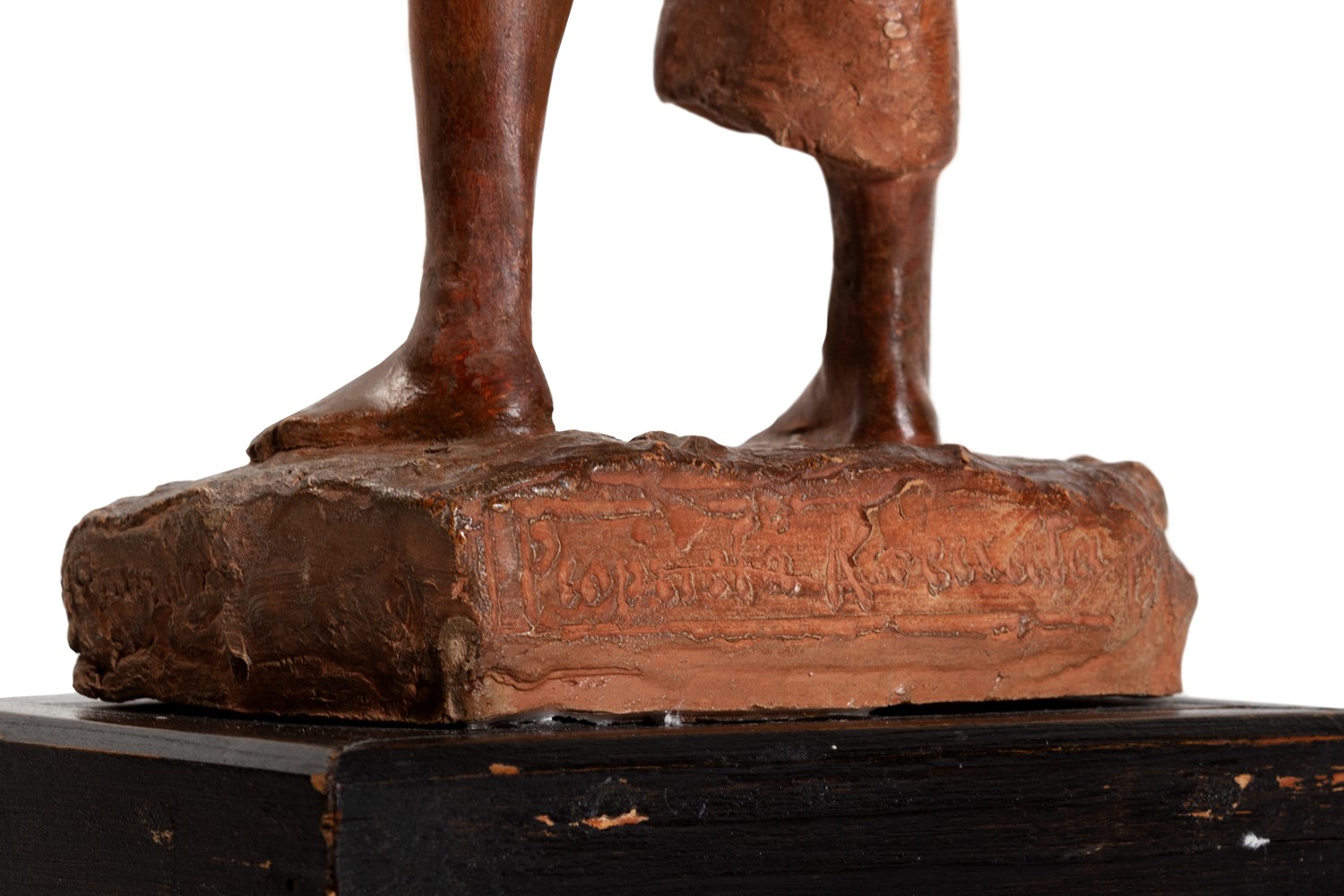 scultura in terracotta su base in legno