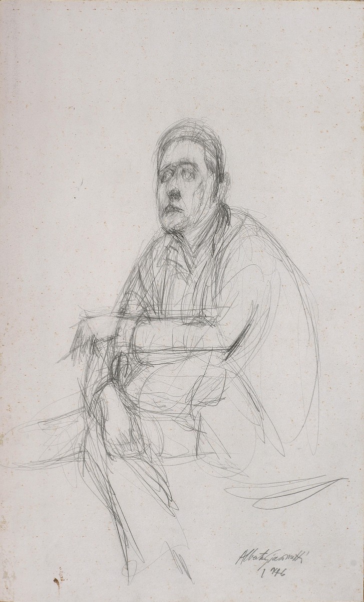GIACOMETTI ALBERTO (1901 - 1966) Uomo con gambe accavallate. Fotolitografia. Cm 28,00 x 46,00. Firma e data in basso a destra a matita. Cornice presente