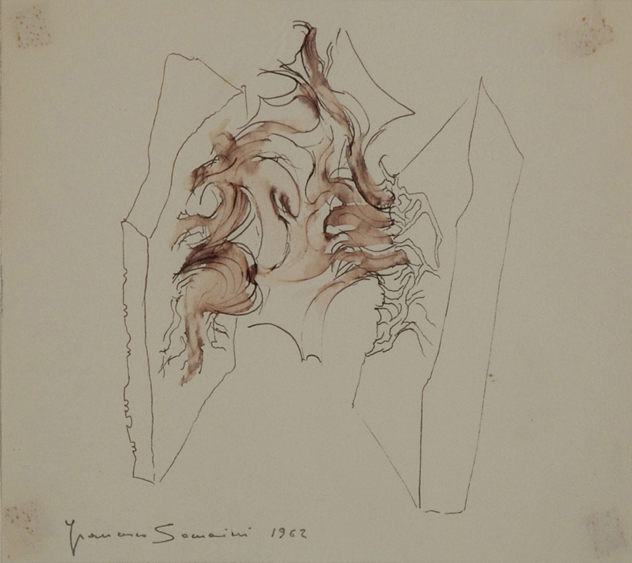 Somaini Francesco (Lomazzo 1926 Como 2005) “Studio per una scultura in piombo e pietra” 1962 inchiostro di china bruno su carta (cm 20x22,2). Firmato e datato in basso a sinistra. L’opera è accompagnata da autentica su fotografia rilasciata dall’Archivio Francesco Somaini con il numero: D.2.6031C. Bibliografia: E. Barilli, 20 disegni di Francesco Somaini, 1964, Edizioni del Milione, Milano, ill. n. 5; E. Crispolti, Urgenza nella città, 1972, Edizioni Mazzotta, Milano, ill. n. 24, p. 80