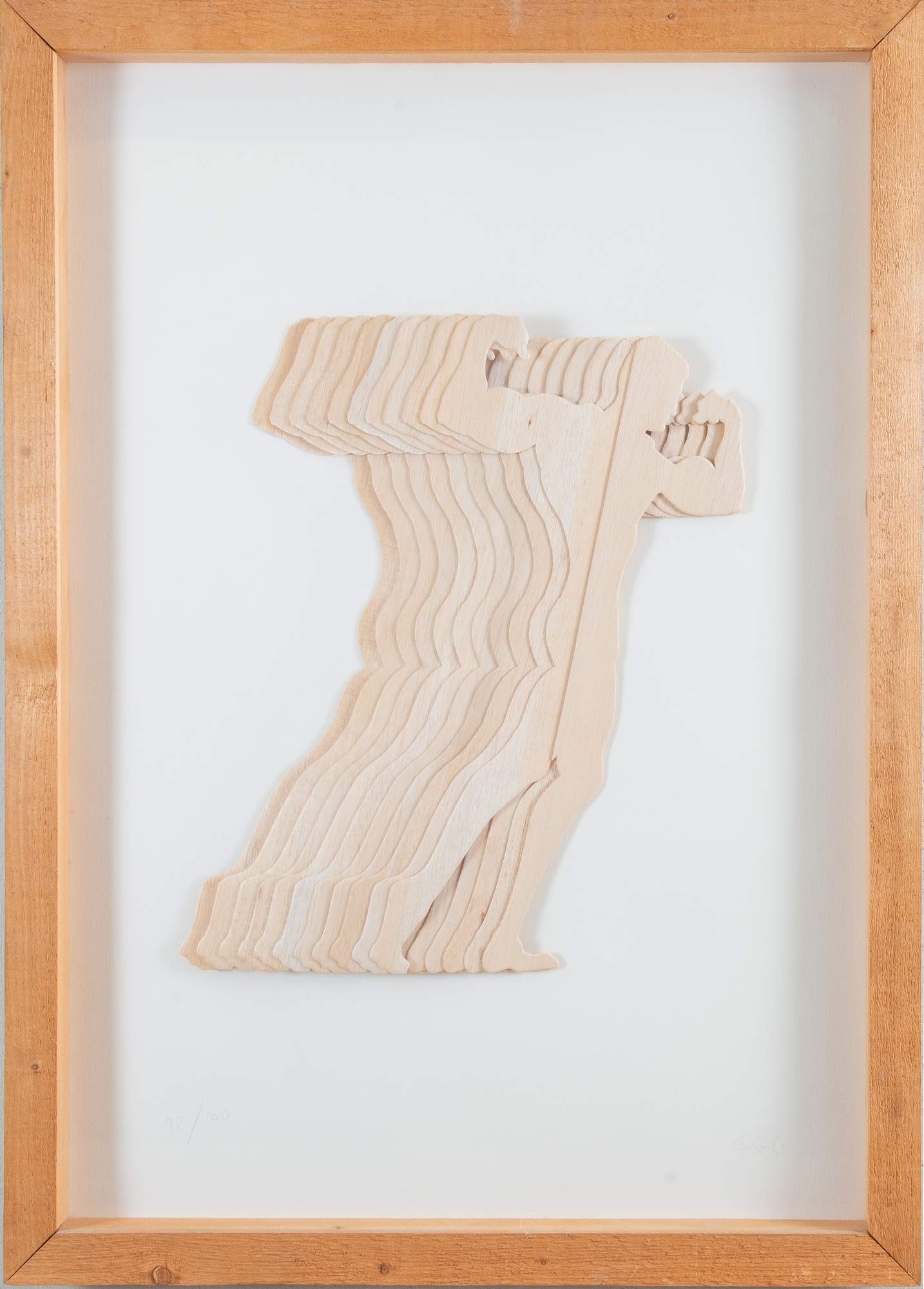 MARIO CEROLI (Castel Frendano 1938) “Figura maschile”. Scultura multiplo in balsa applicato su carta. Cm 100x70. Opera firmata in basso a destra Ceroli. Reca numeri di tiratura in basso a sinistra 92/100.