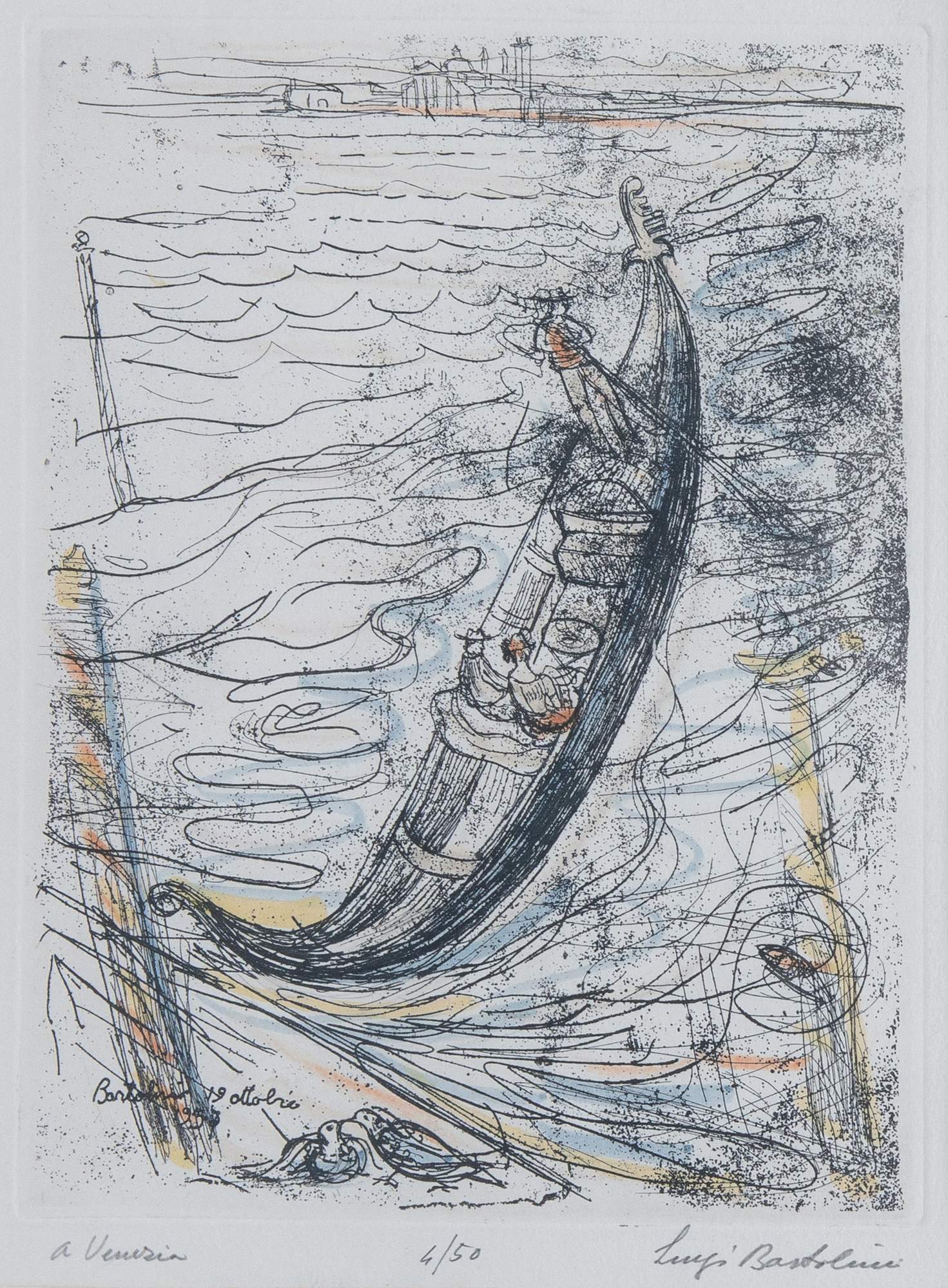 LUIGI BARTOLINI (Cupramontana1892 – Roma 1963) “A Venezia”, 1957. Incisione su carta acquerellata a mano. Cm 42,5x33. Reca firma e data incise nella lastra Bartolini 19 Ottobre 1957. Opera firmata in basso a destra Luigi Bartolini. Opera intitolata in basso a sinistra A Venezia. Reca numeri di tiratura in basso al centro 4/50.