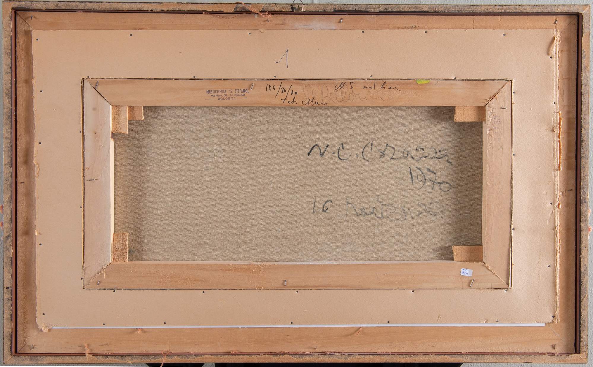 NINO CORRADO CORAZZA (Bologna 1897 – 1975) “La partenza”, 1970. Olio su tela. Cm 30x60. Opera firmata in basso a sinistra Corazza. Al retro opera firmata datata e intitolata N. C. Corazza 1970 La partenza.