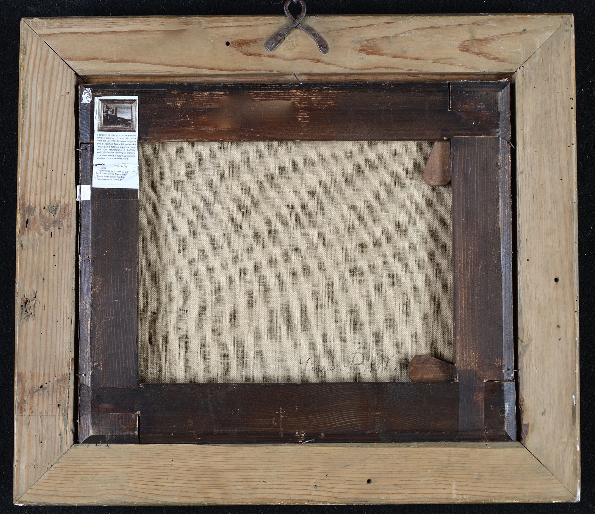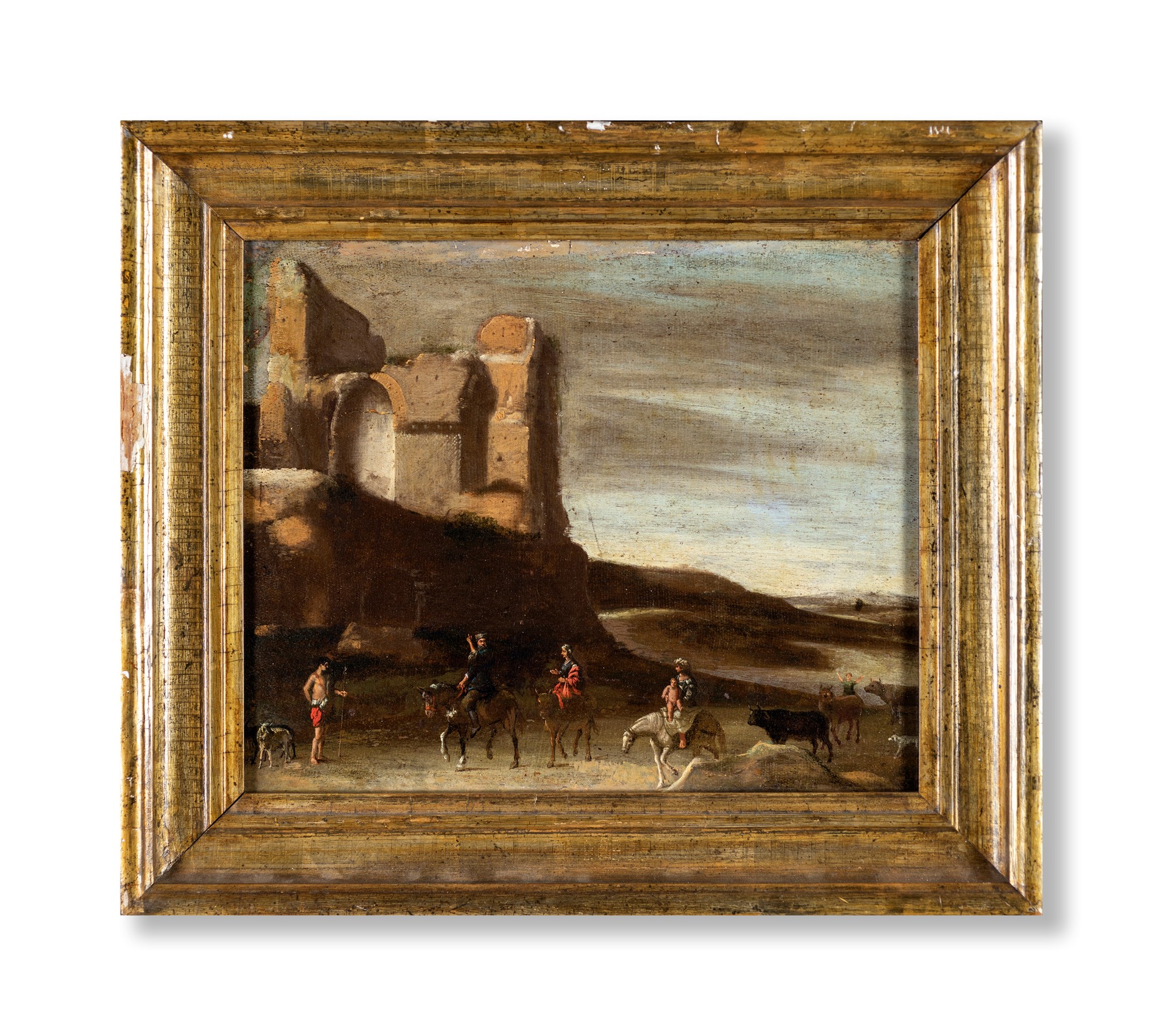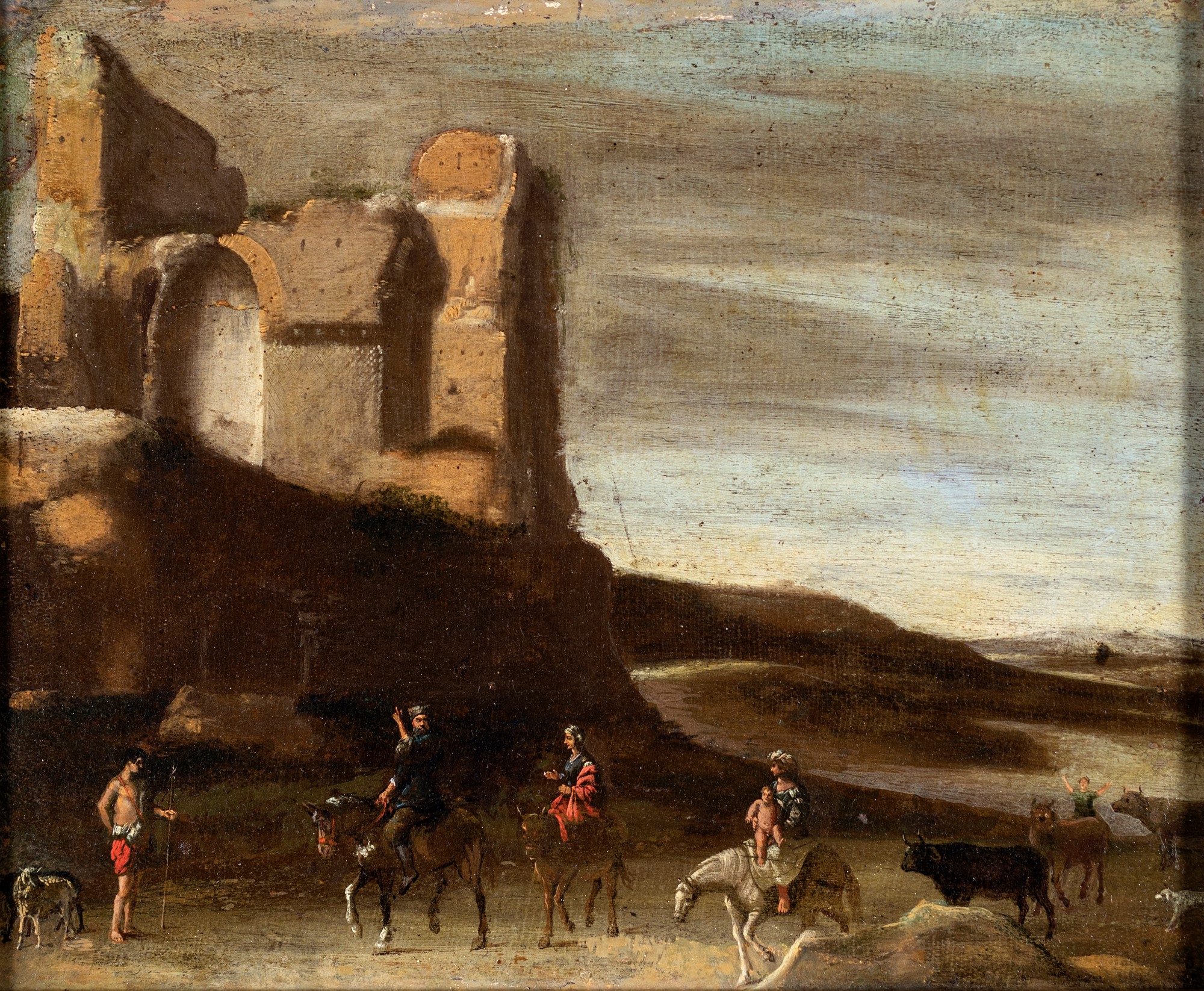 Scuola romana del XVII secolo - Paesaggio fluviale con architetture e fuga in Egitto - olio su tela - cm 35x42
