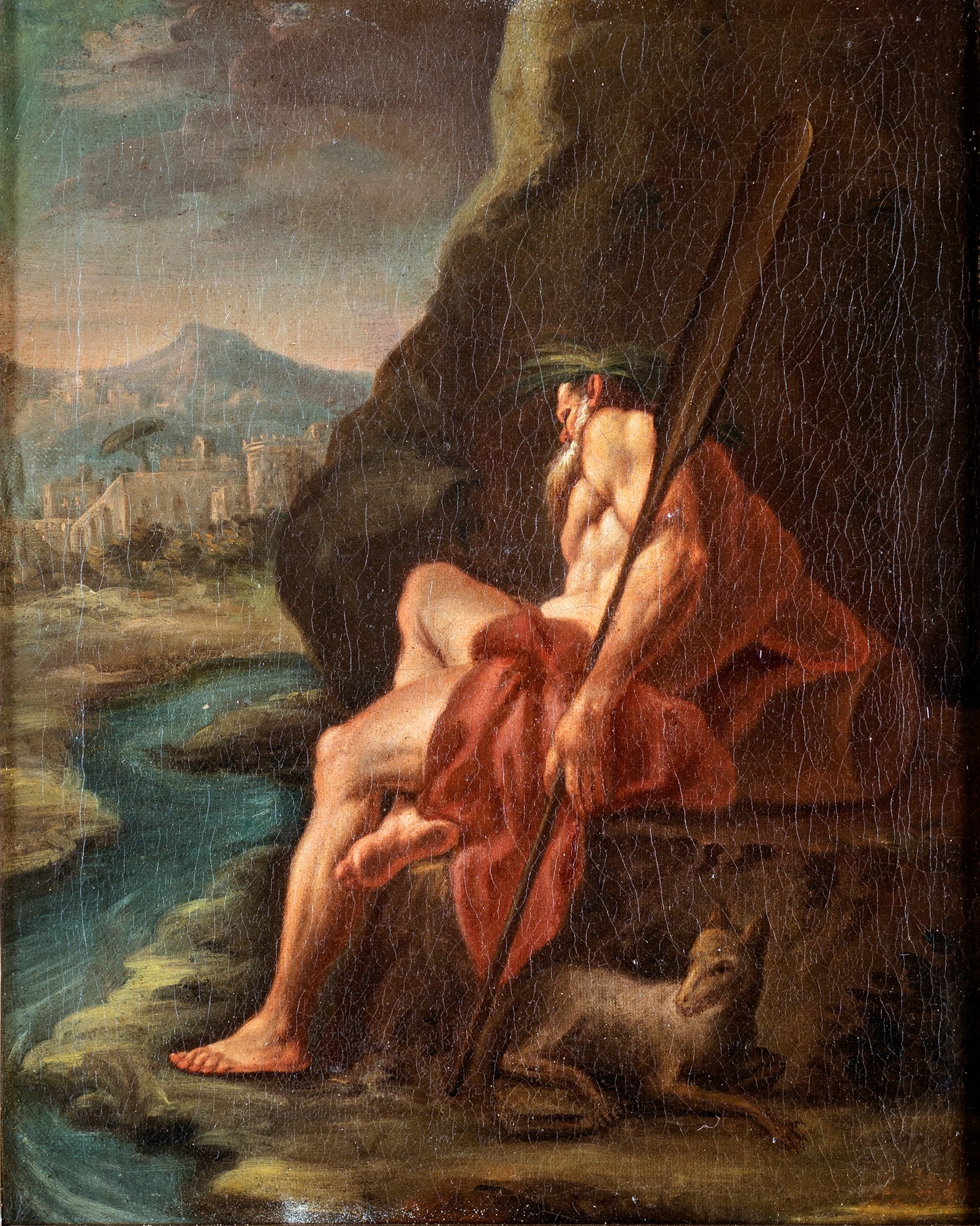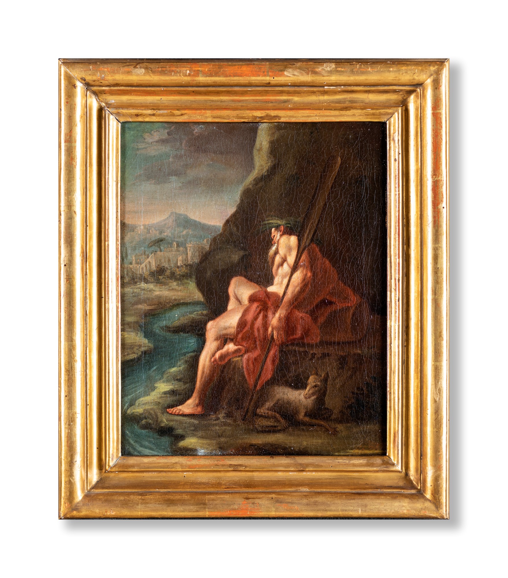 Pittore del XVIII secolo - Paesaggio fluviale con Santo eremita e agnello -...