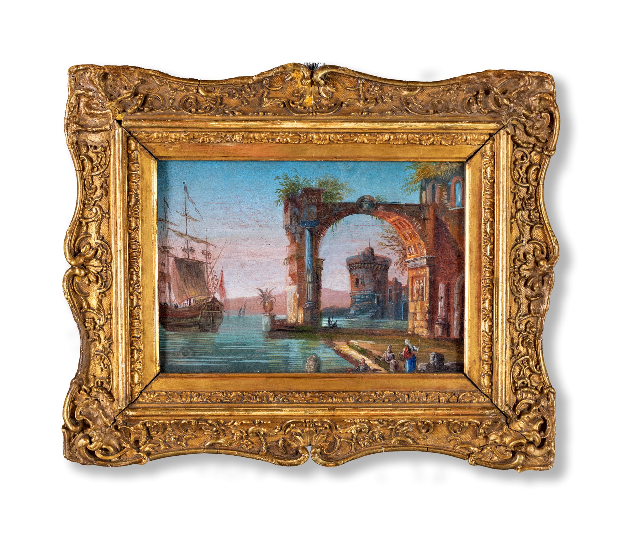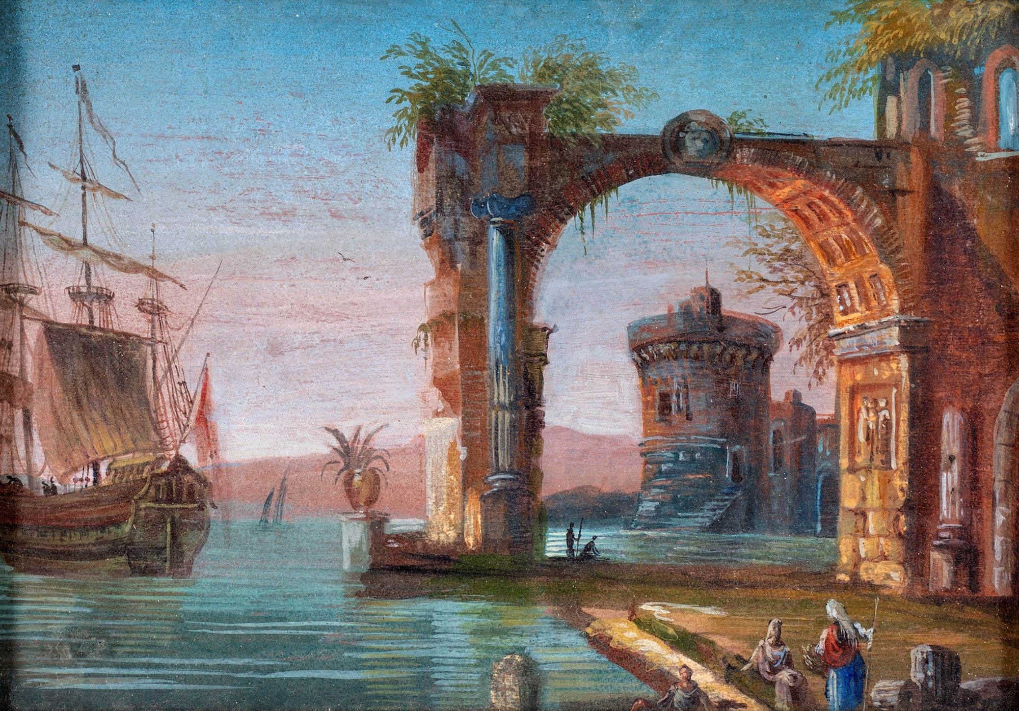 Scuola Veneta del XVIII secolo - Marina con veliero e ruderi antichi - Entro bella cornice in legno dorato - tempera su carta - cm 19x27