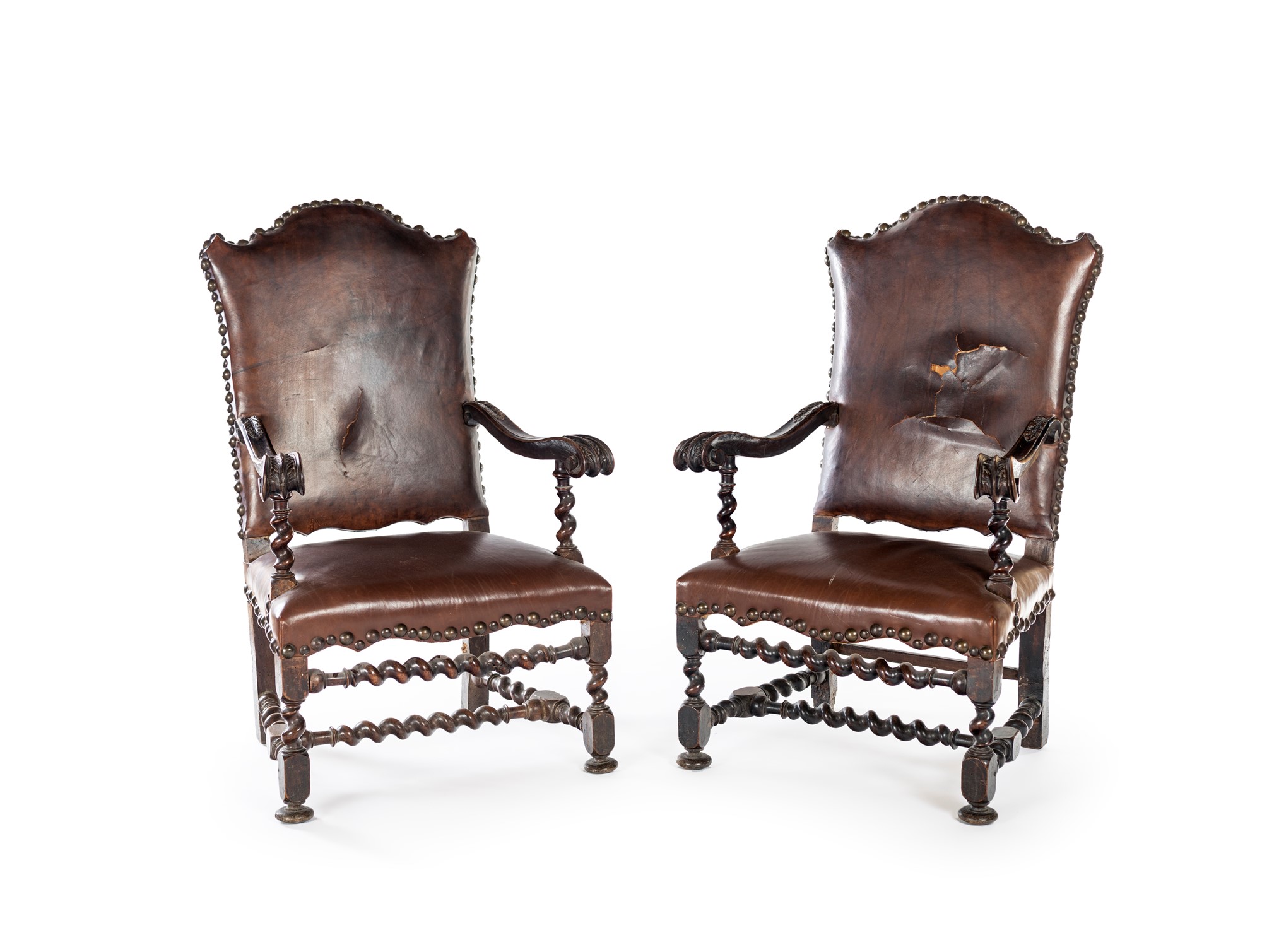 Coppia di seggioloni a rocchetto in legno di noce, XVII secolo - con alti schienali e sedili imbottiti rivestiti in cuoio, braccioli sagomati terminanti a ricciolo abbelliti da rilievi vegetali, gambe tornite - cm 112x68x56