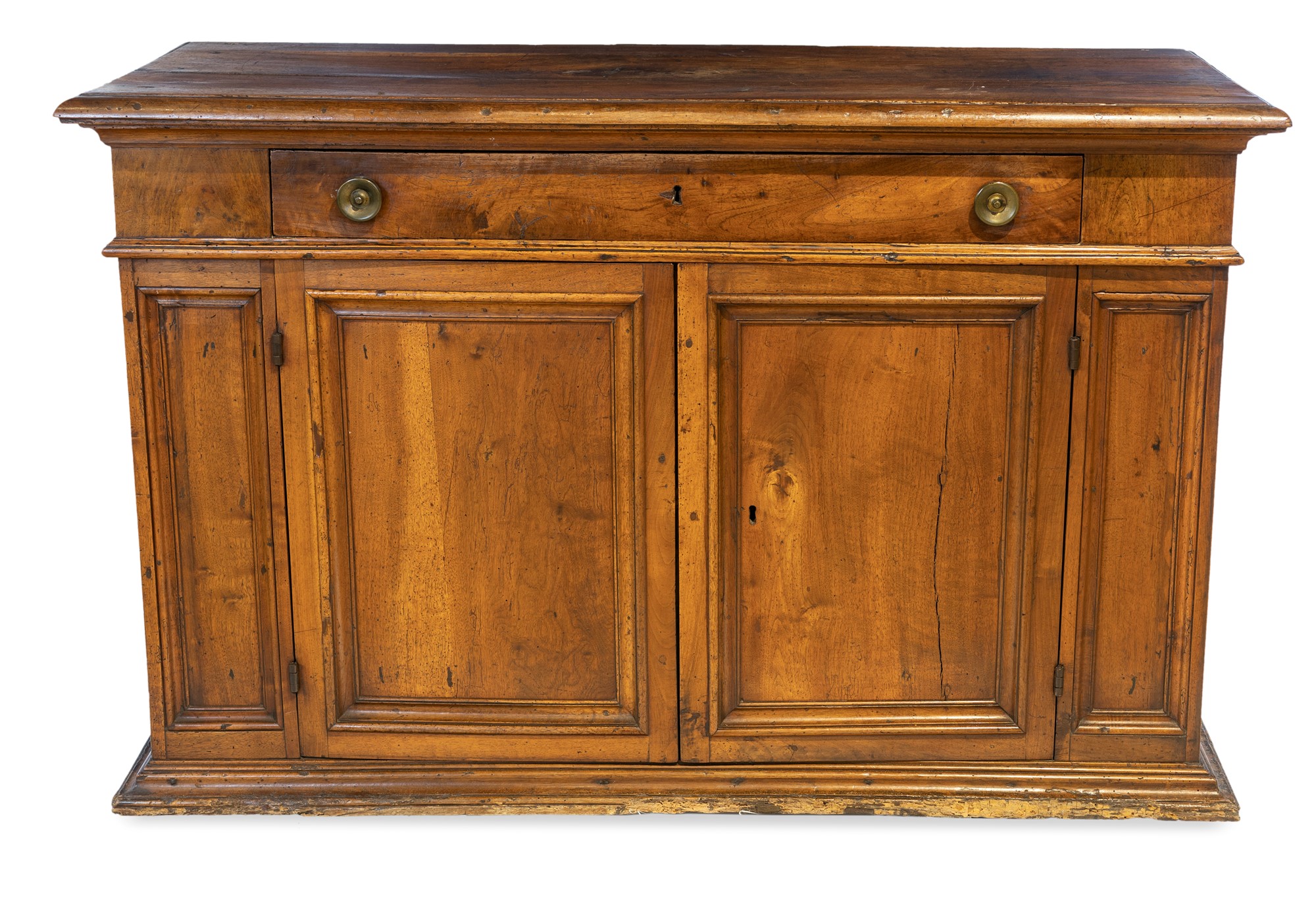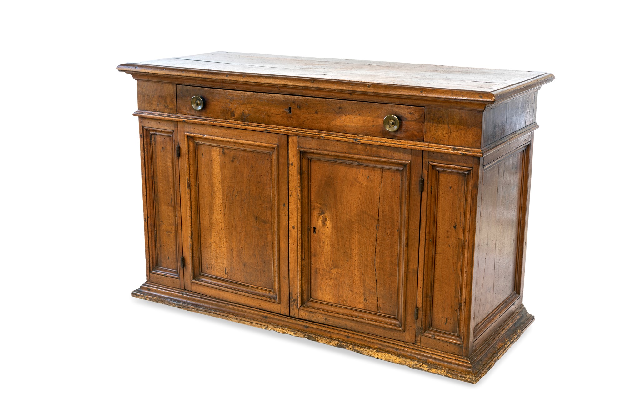 Credenza in noce, XVII secolo - con piano rettangolare sporgente sotteso da cornice aggettante; un cassetto compreso nella fascia e due sportelli frontali con specchiature racchiuse da profili modanati. Cornice inferiore consunta. - cm 98x154x64