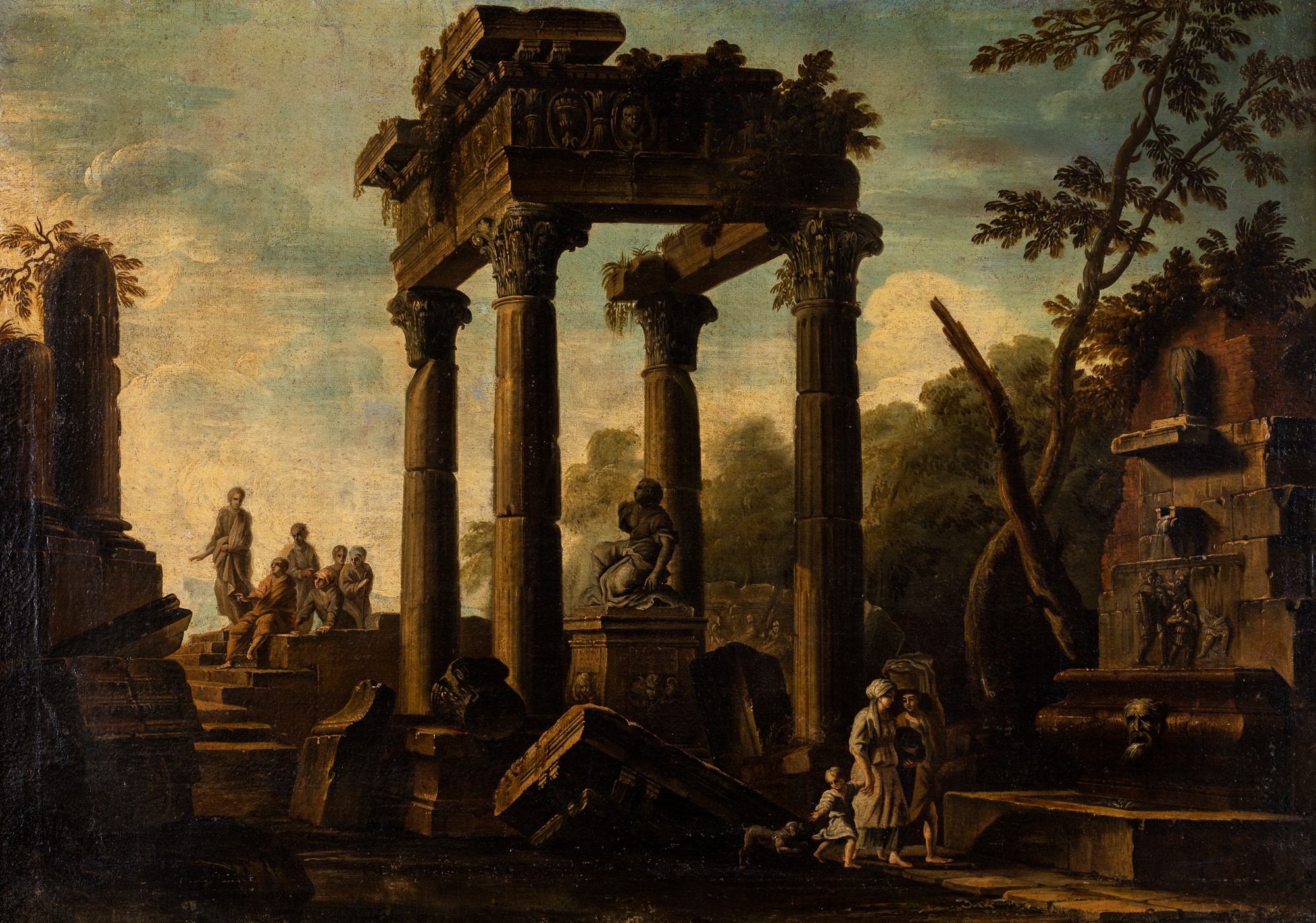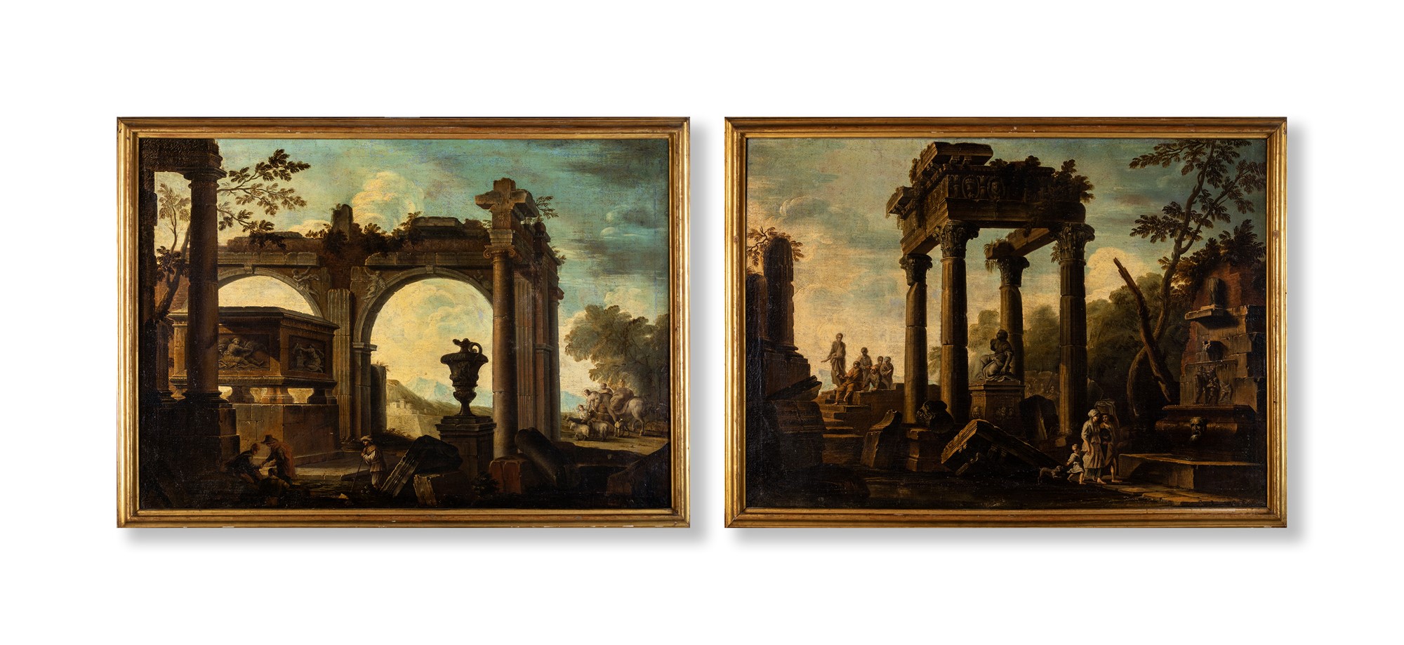Giovanni Ghisolfi ( cerchia ) - a) Capriccio architettonico con figure e rovine di tempio ionico b) Capriccio architettonico con figure e rovine di tempio corinzio - coppia di olii su tela - cm 90x130