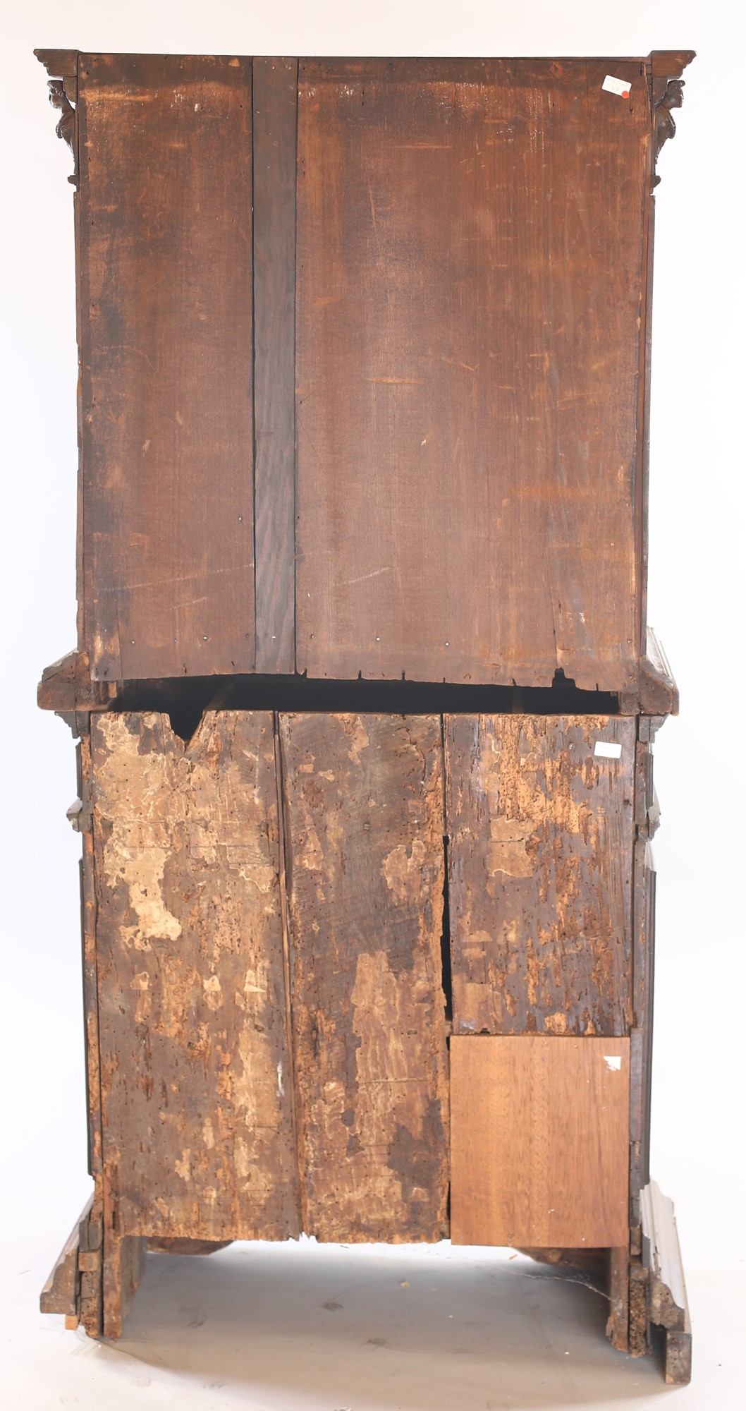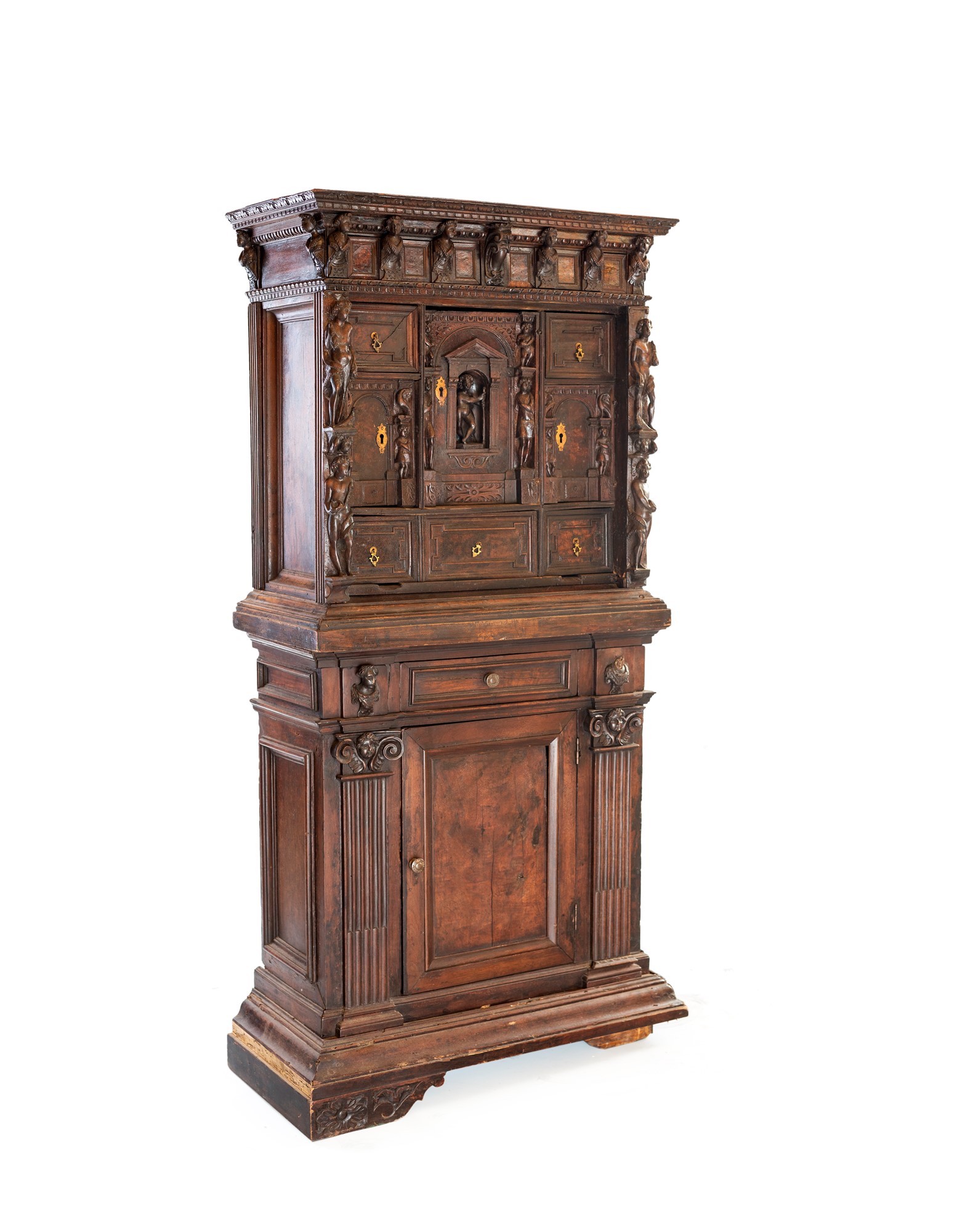 Stipo a bambocci in noce, Genova XVII secolo - caratterizzato da figure scolpite ed intagliate in altorilievo. Corpo superiore con due cassetti compresi nella fascia, uno sportello centrale con ripiani interni affiancato da ante e quattro tiretti; due cassetti nella parte inferiore con sportello sottostante delimitato da lesene scanalate, piedi a mensola. Difetti - cm 150x70x36