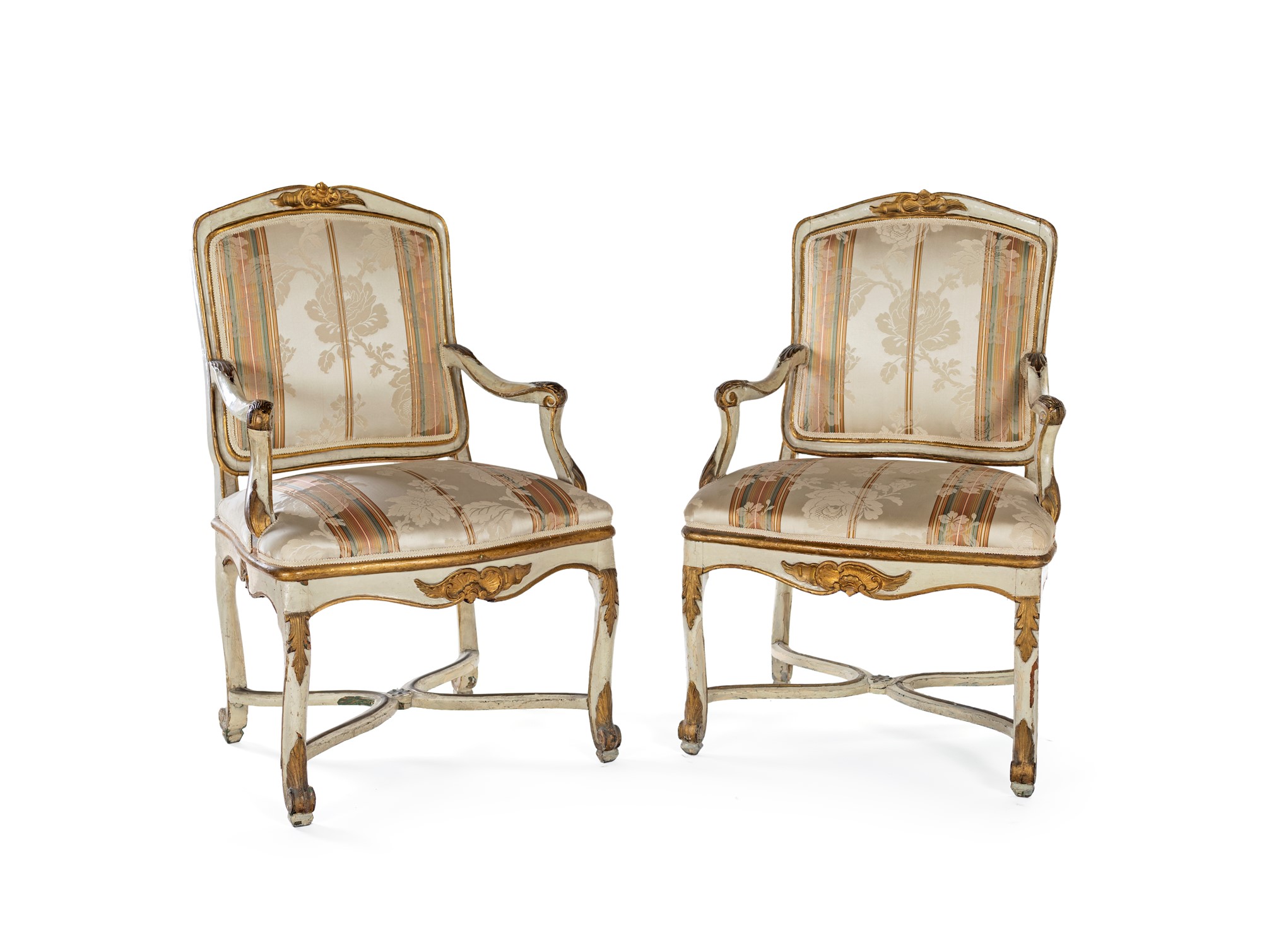 Coppia di poltrone in legno laccato bianco, Marche XVIII secolo - dorate...