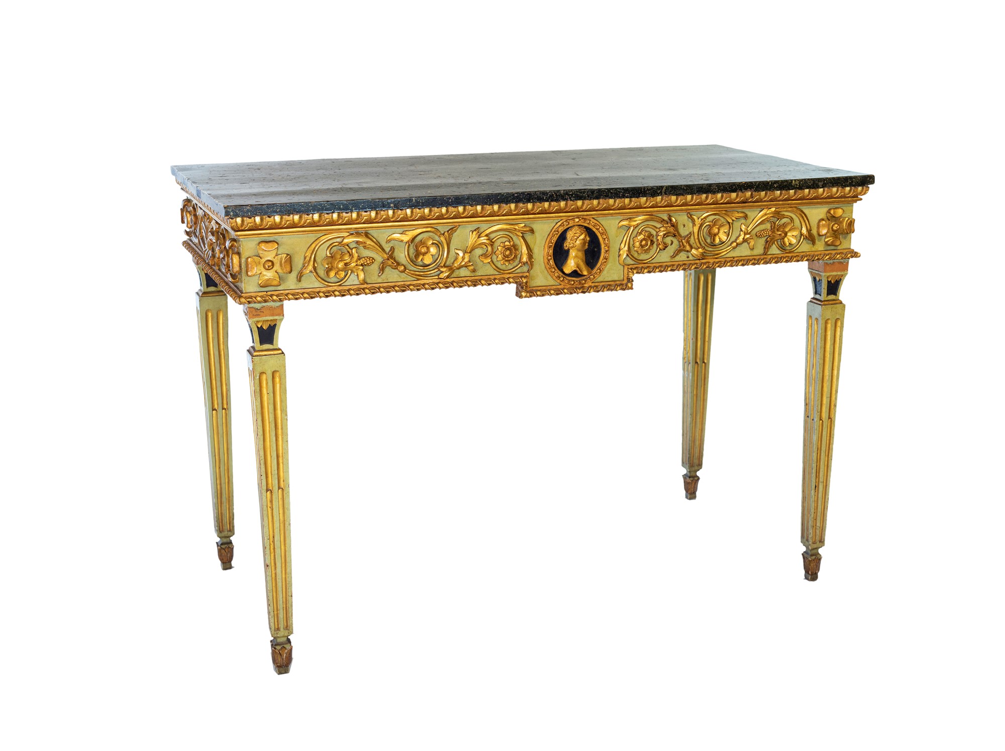 Console in legno laccato verde, Italia centrale XIX secolo - dorata lungo i profili ed i rilievi ornamentali; piano rettangolare dipinto ad imitazione del marmo, fascia lineare percorsa da girali fogliacee, centrata da medaglione con profilo muliebre, gambe rastremate - cm 93x135x68