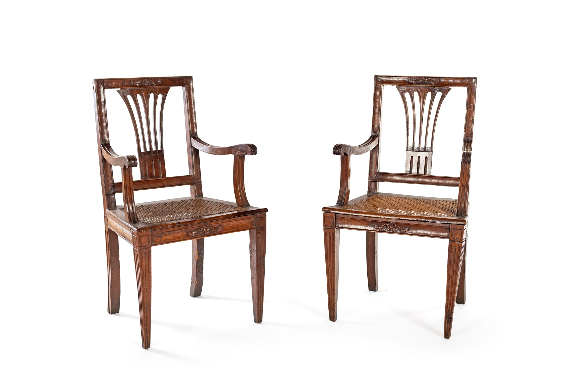 Coppia di poltroncine in noce, fine XVIII secolo - di linea squadrata con schienali a giorno, sedili in paglia di Vienna sormontati da cuscini, braccioli lineari, gambe rastremate scanalate - cm 95x57x45,5