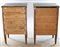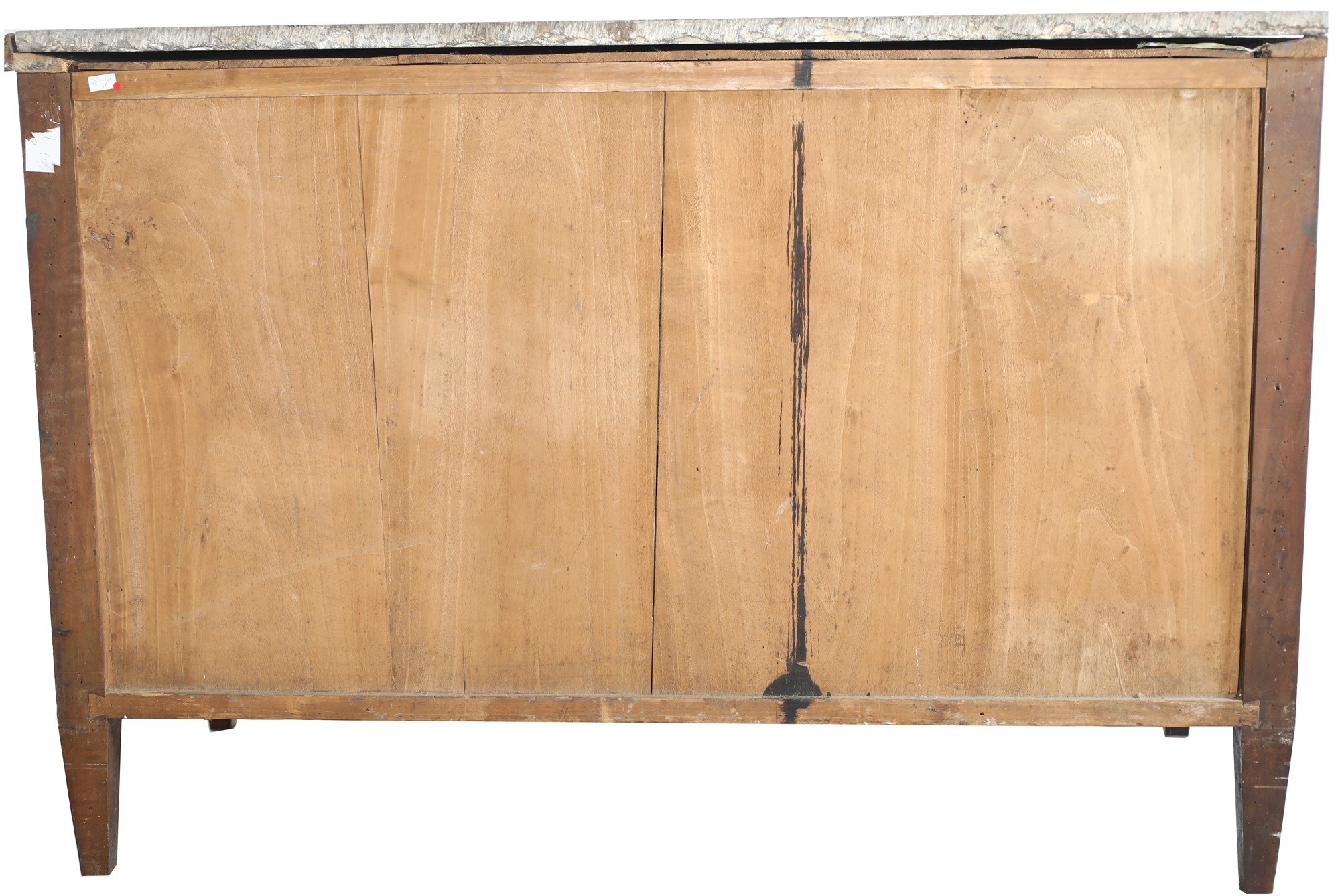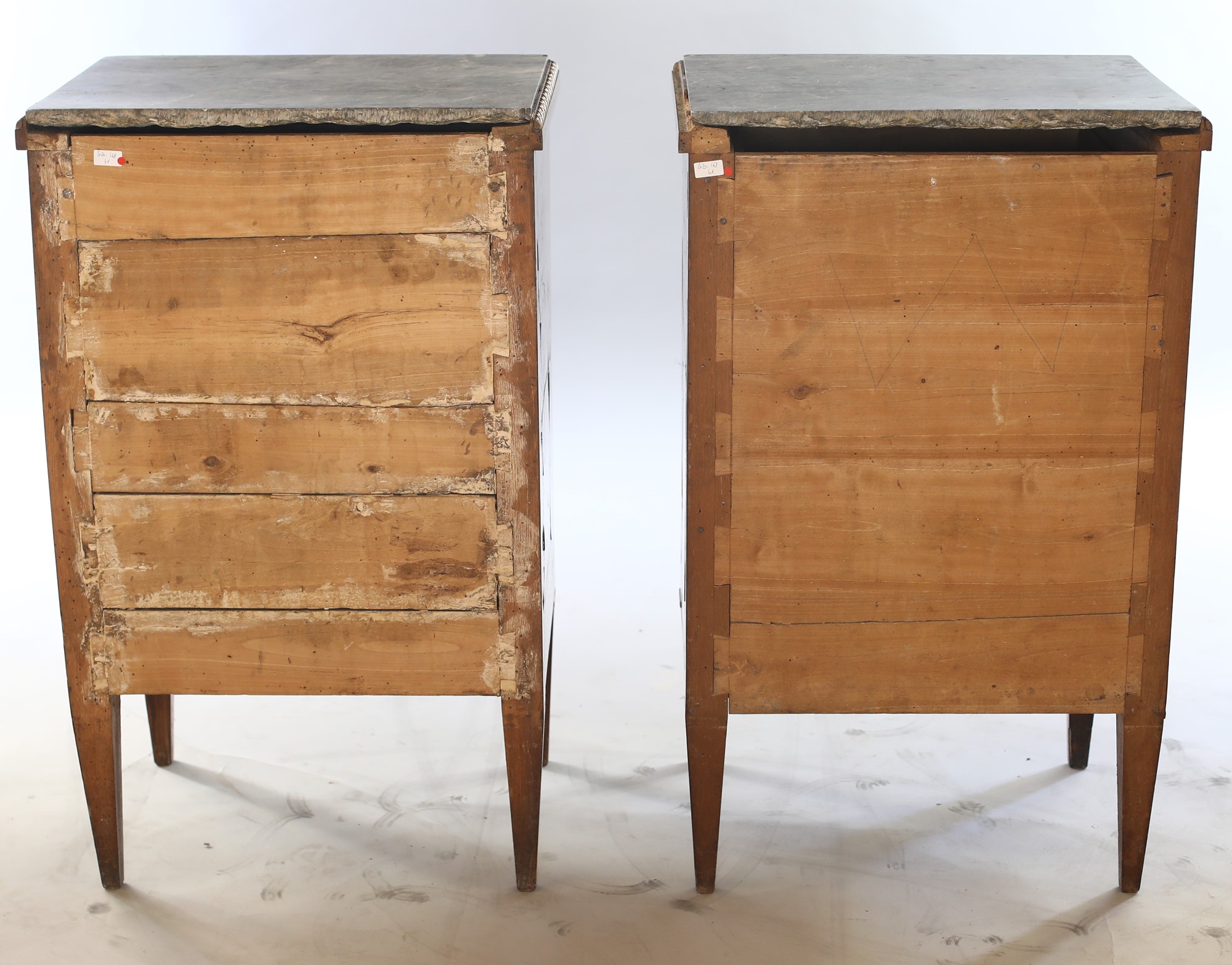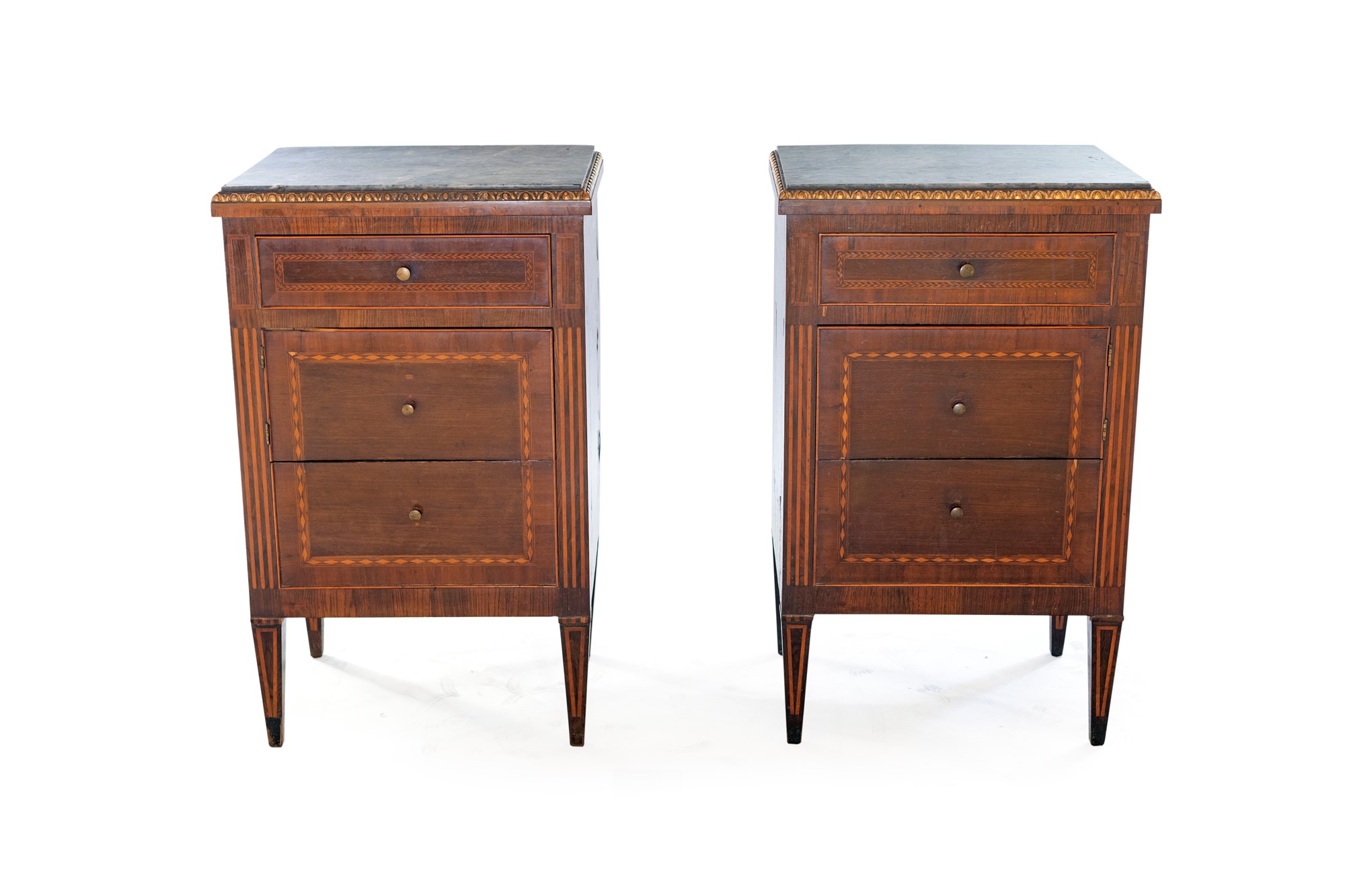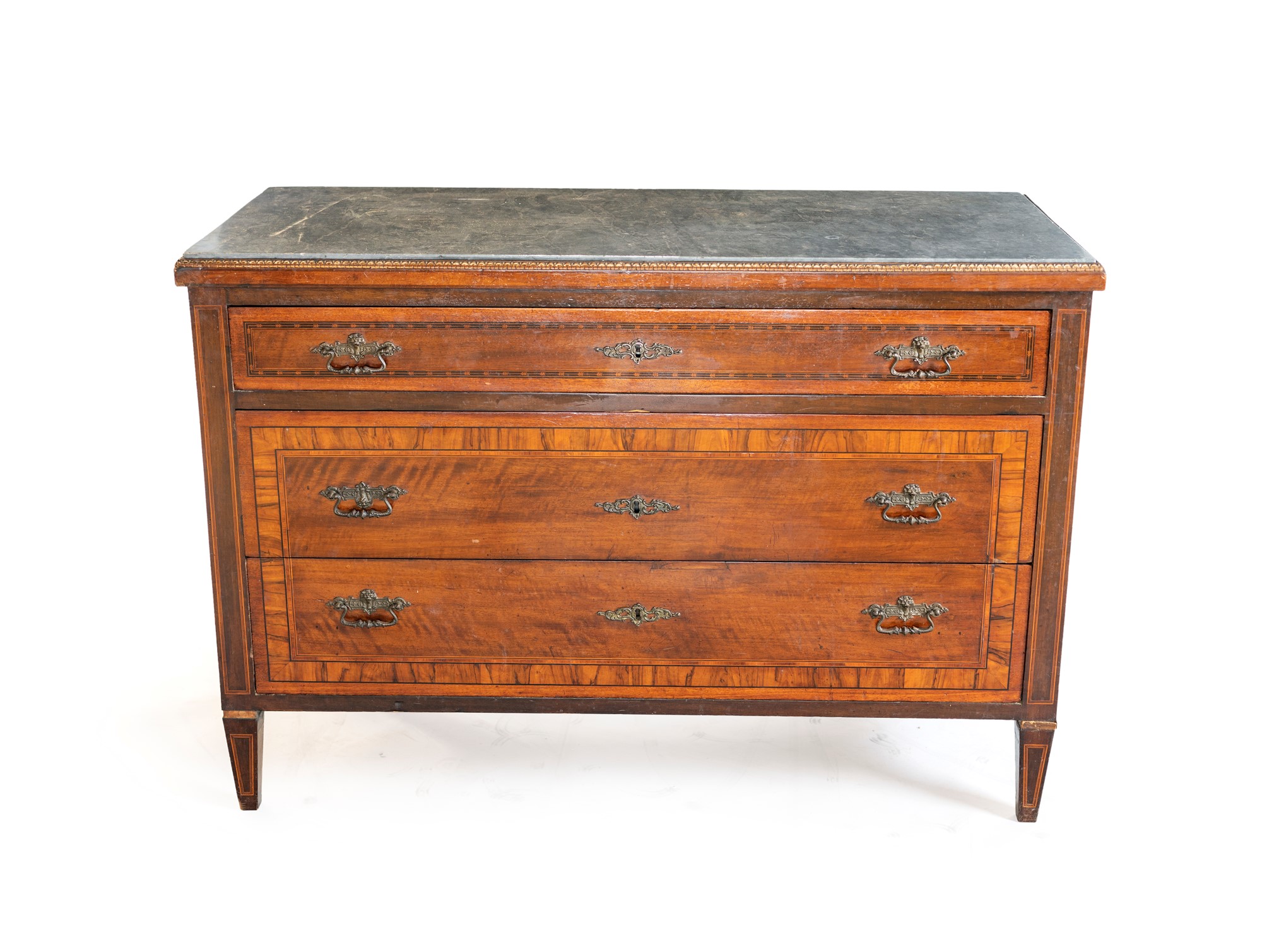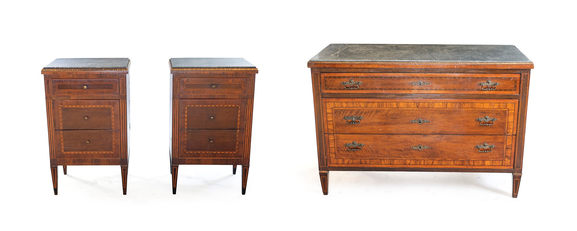 Cassettone e coppia di comodini in noce e palissandro, Toscana, fine del XVIII secolo - rifiniti da piano in marmo grigio racchiuso da cornice intagliata con tracce di doratura, recano un cassetto nella fascia e due sottostanti privi di traversa, incorniciati da bordure percorse da spighe e losanghe in sequenza intarsiate in legno di frutto; piedi rastremati. - cm 90x132x59 - comodini cm 84x52x40