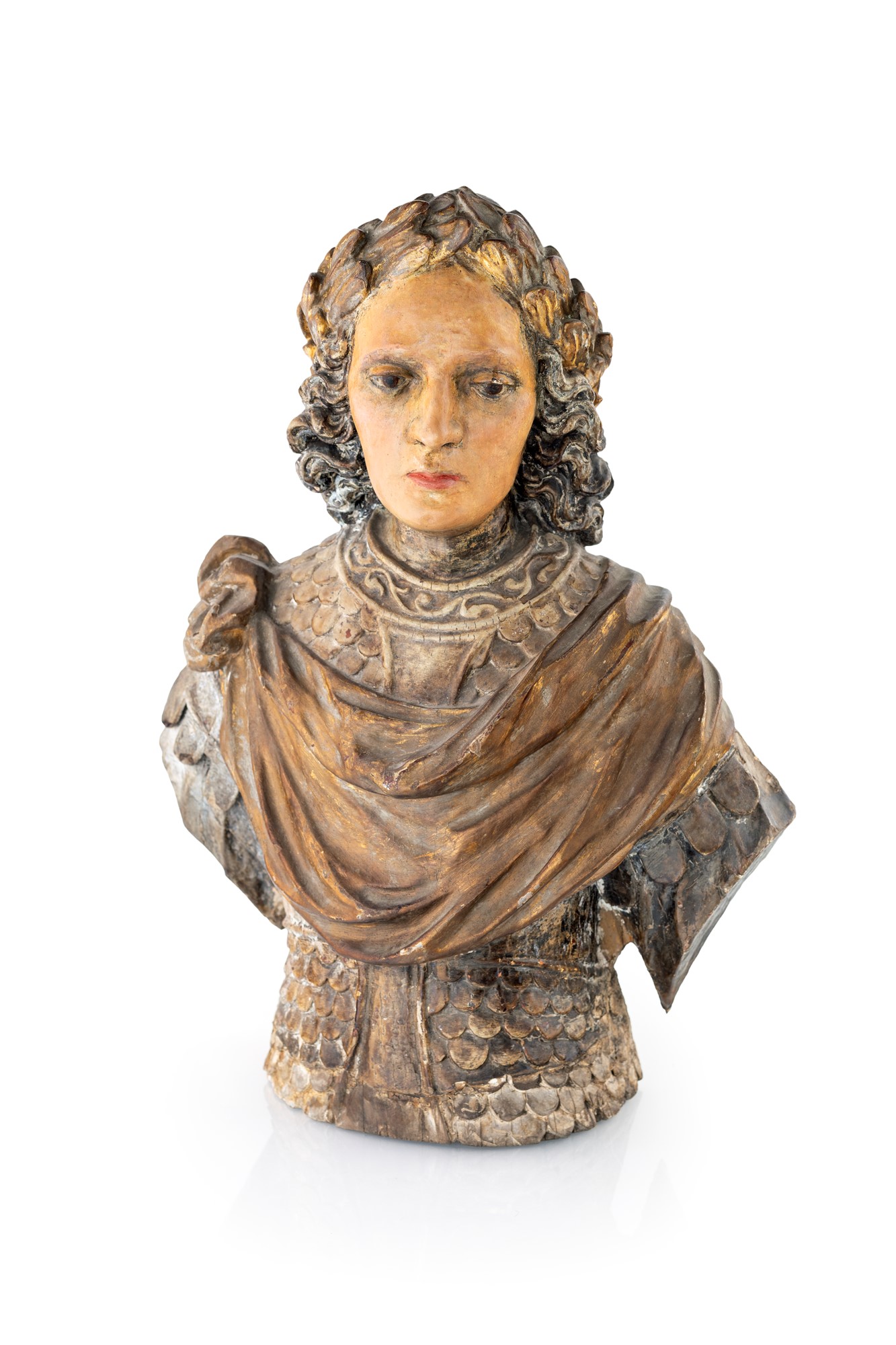Busto in legno policromo, XVII secolo - raffigurante Lorenzo de Medici. Restauri al volto - cm 50x41x16