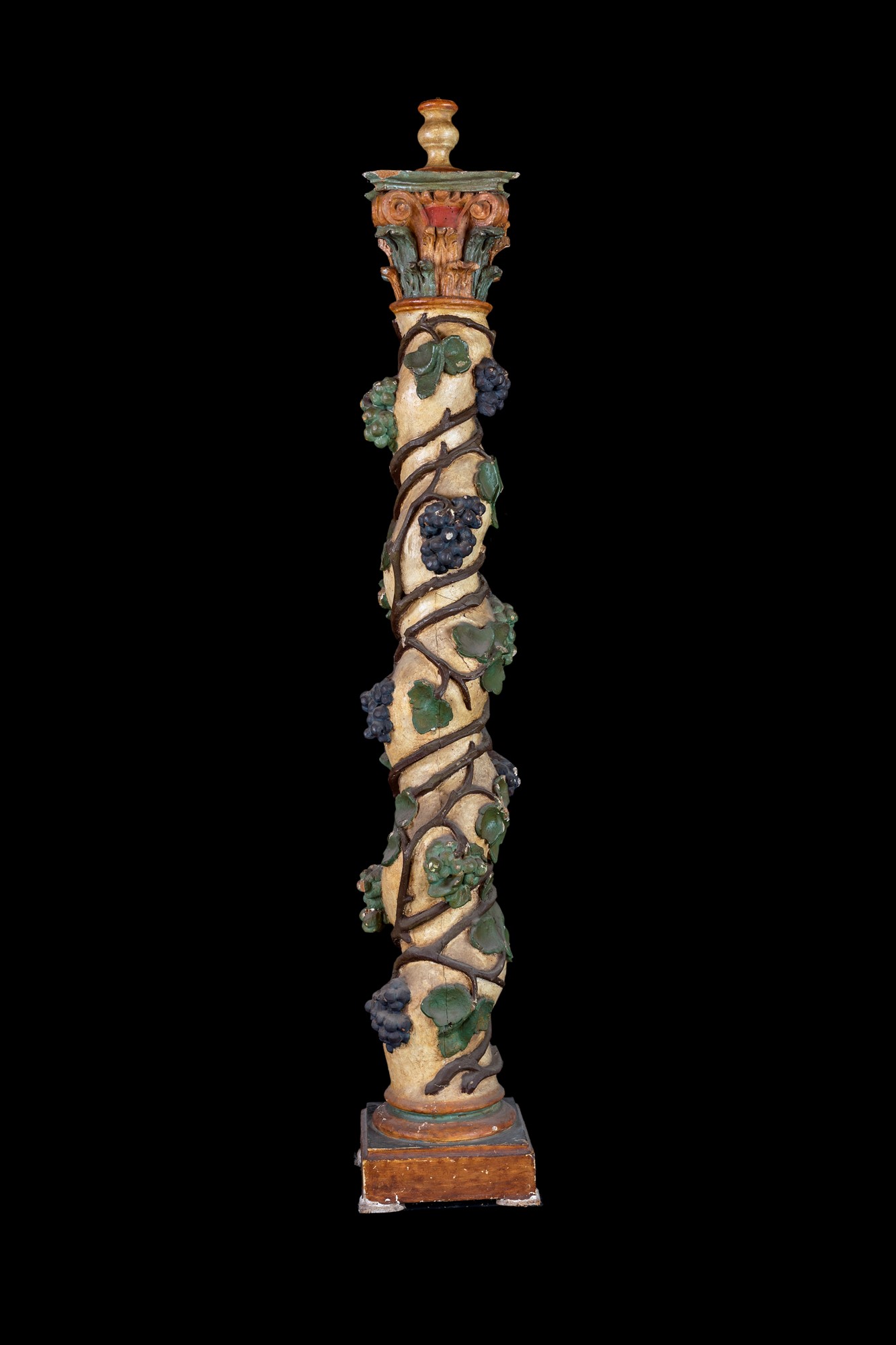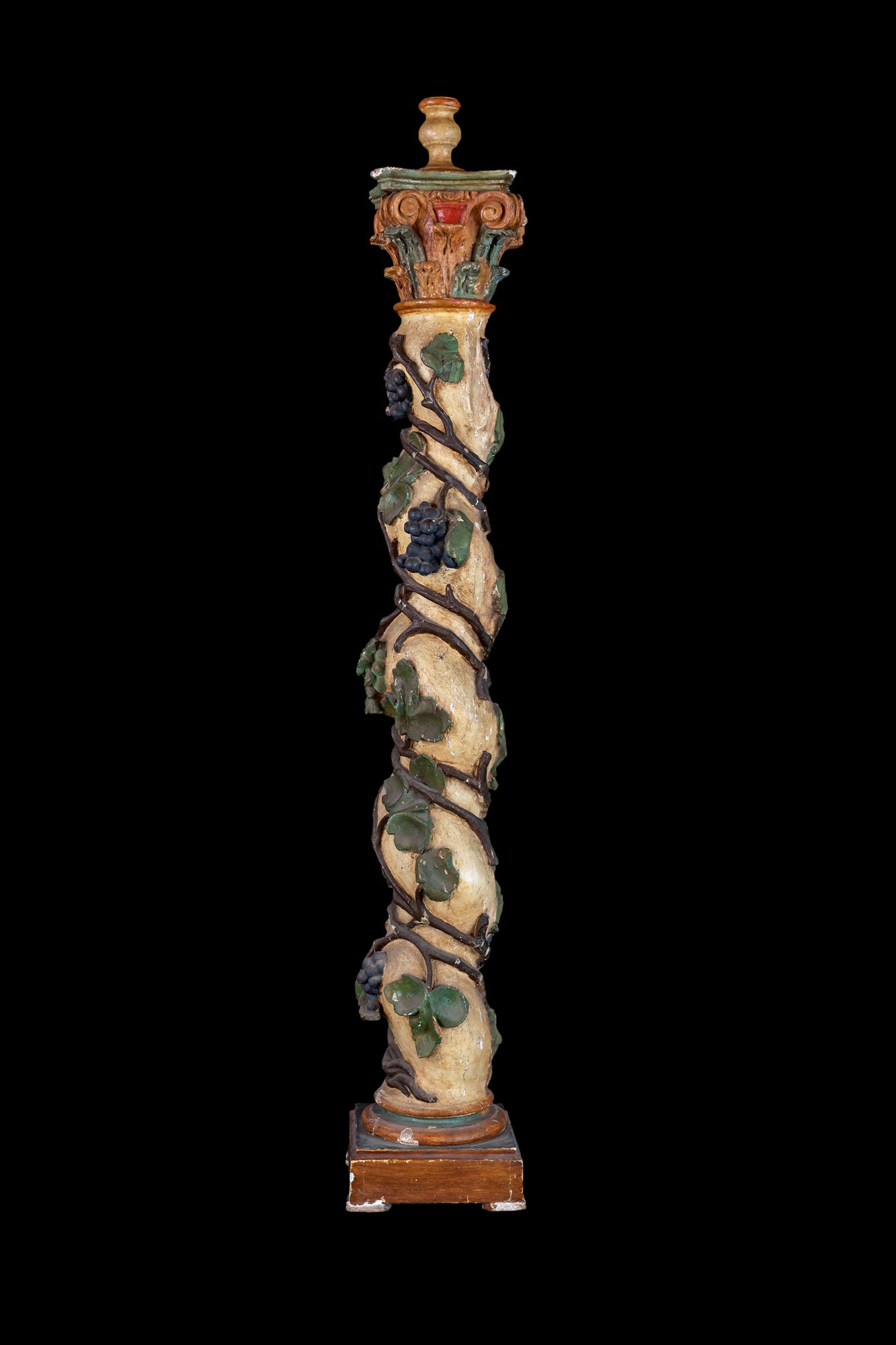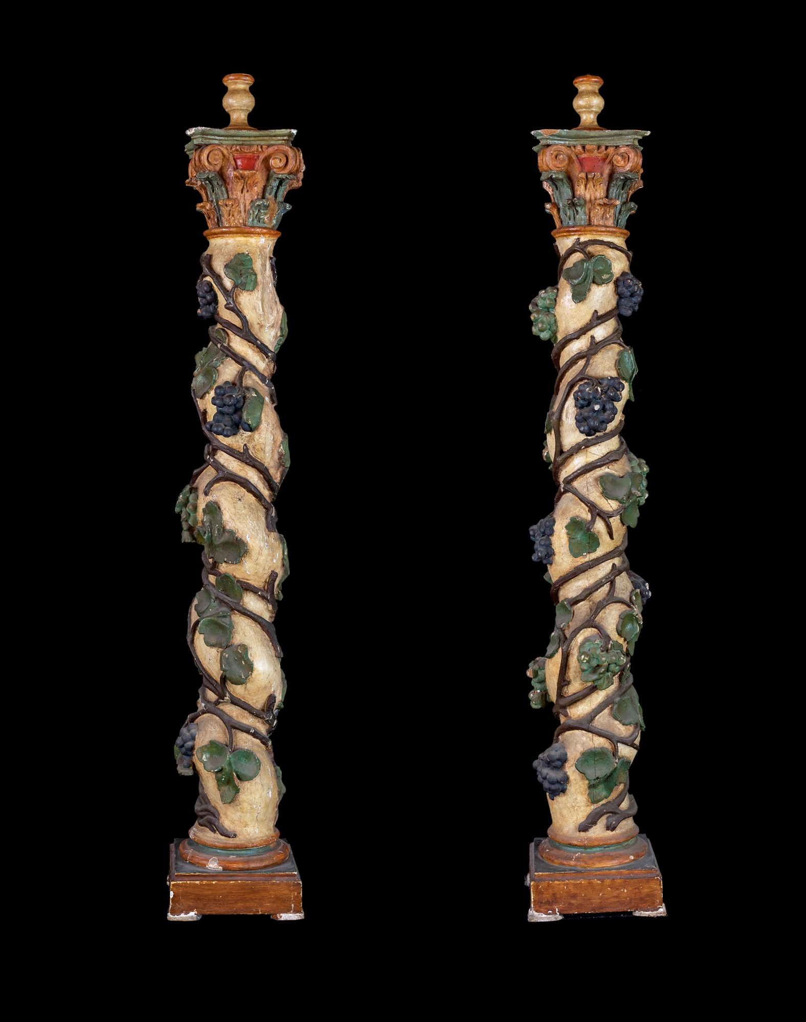 Coppia di colonne tortili - Coppia di torciere in legno scolpito e laccato, fine del XVIII secolo, in forma di colonna tortile su cui si avvolgono tralci di vite con grappoli realisticamente dipinti; rifinite da capitelli corinzi, sono sormontate da un supporto reggicandela. - altezza cm 160