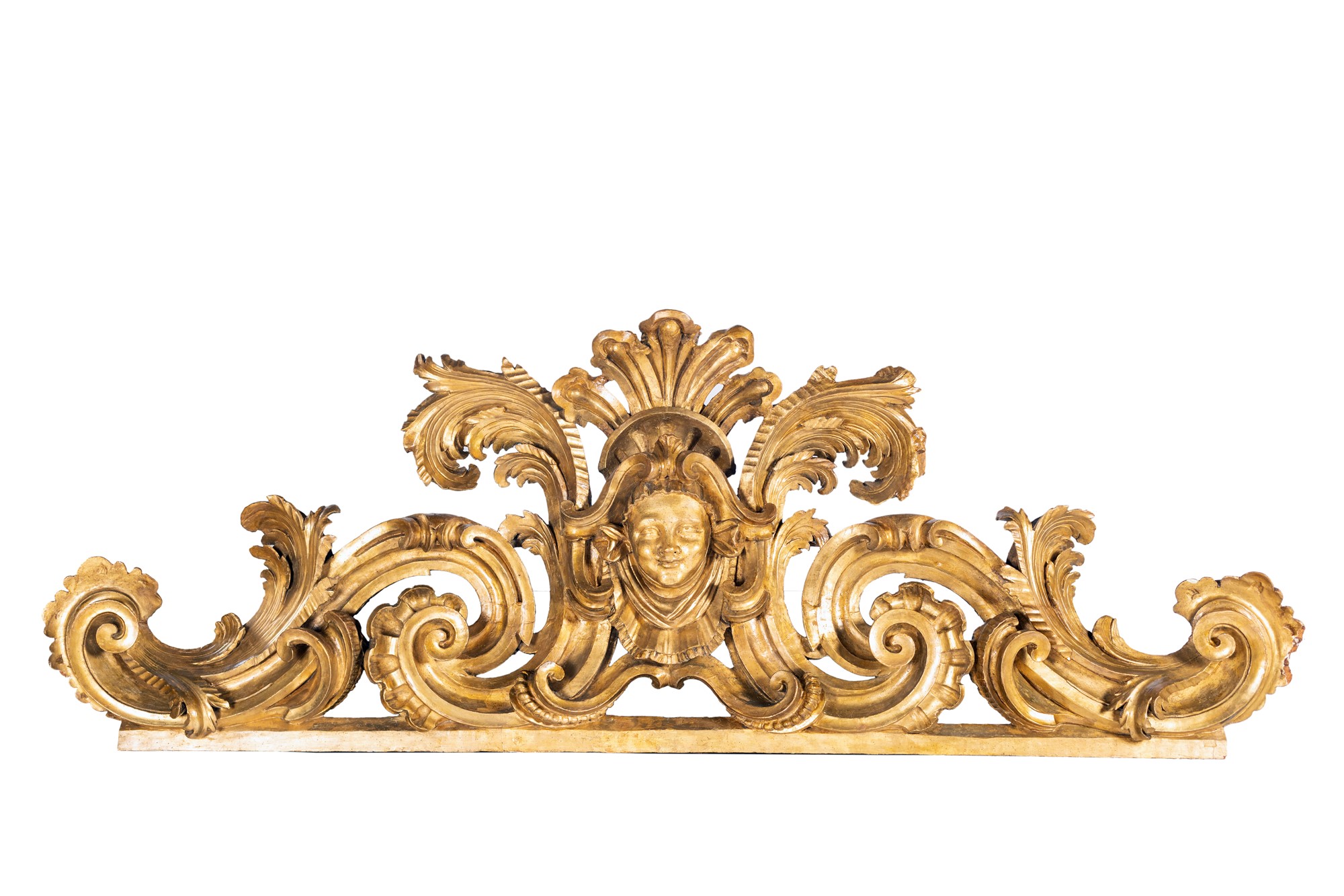 Grande fregio in legno intagliato e dorato, Roma XVIII secolo - centrato da un mascherone avvolto e circondato da volute vegetali terminanti a ricciolo - cm 95x265