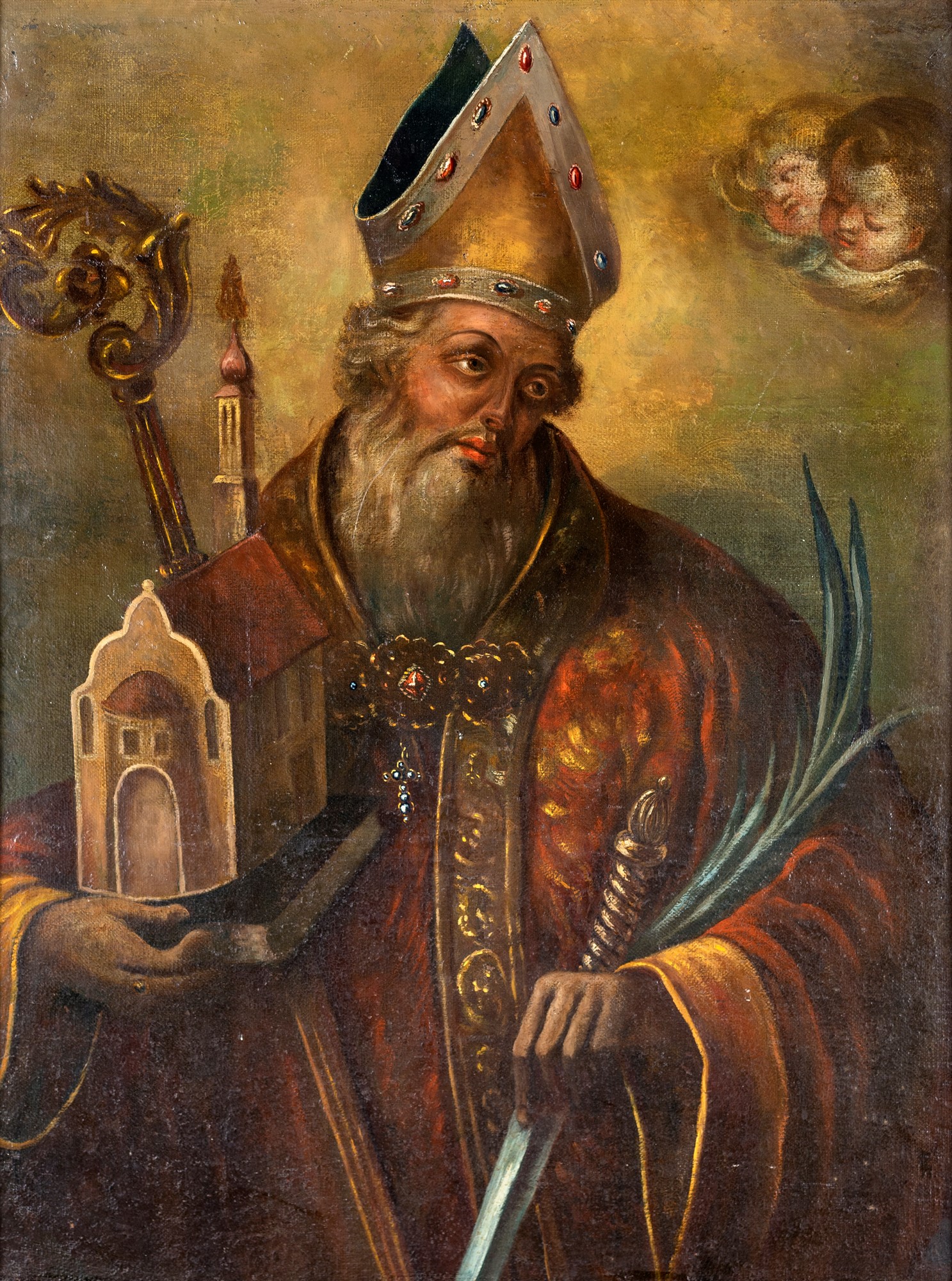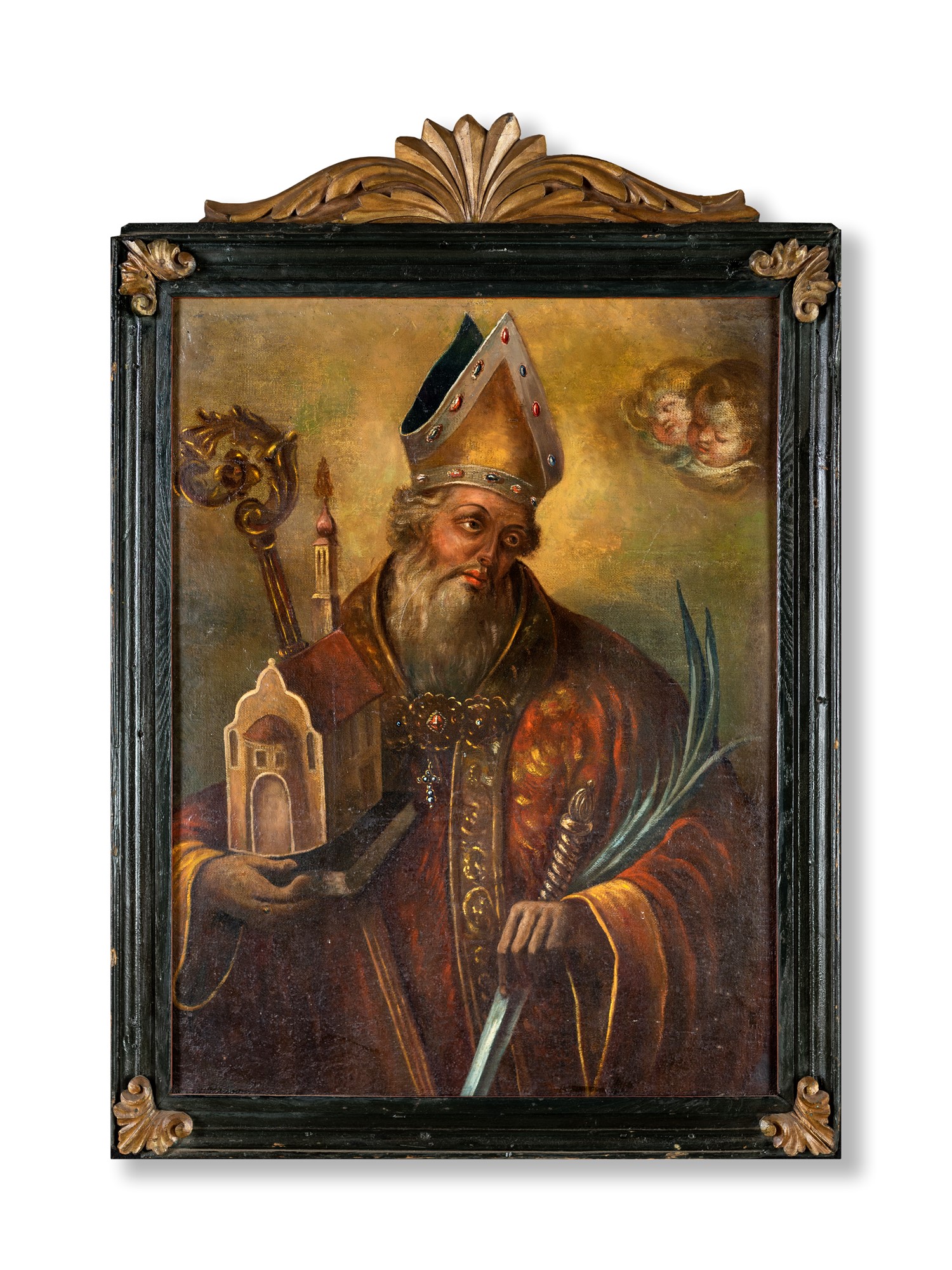 Pittore del XIX secolo - San Volfango di Ratisbona - cornice ebanizzata e...