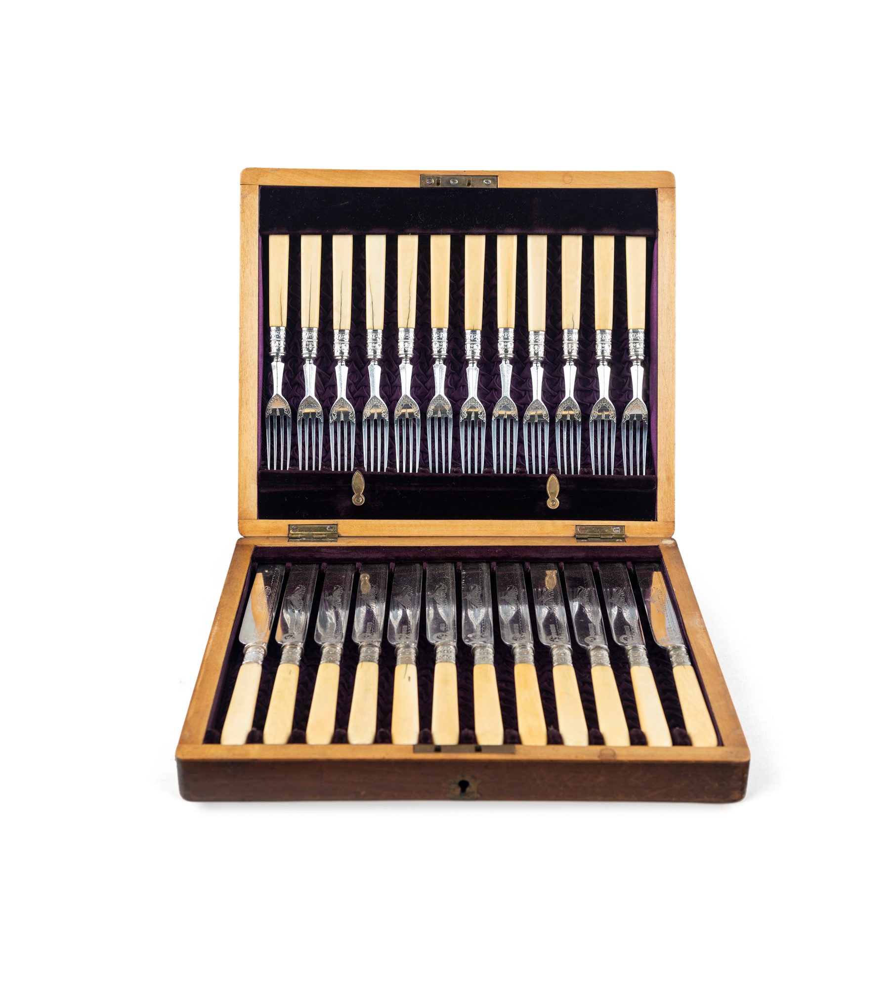 Servizio di posate in metallo argentato - composto da dodici forchette ed altrettanti coltelli con manico in avorio. Entro scatola in legno. -